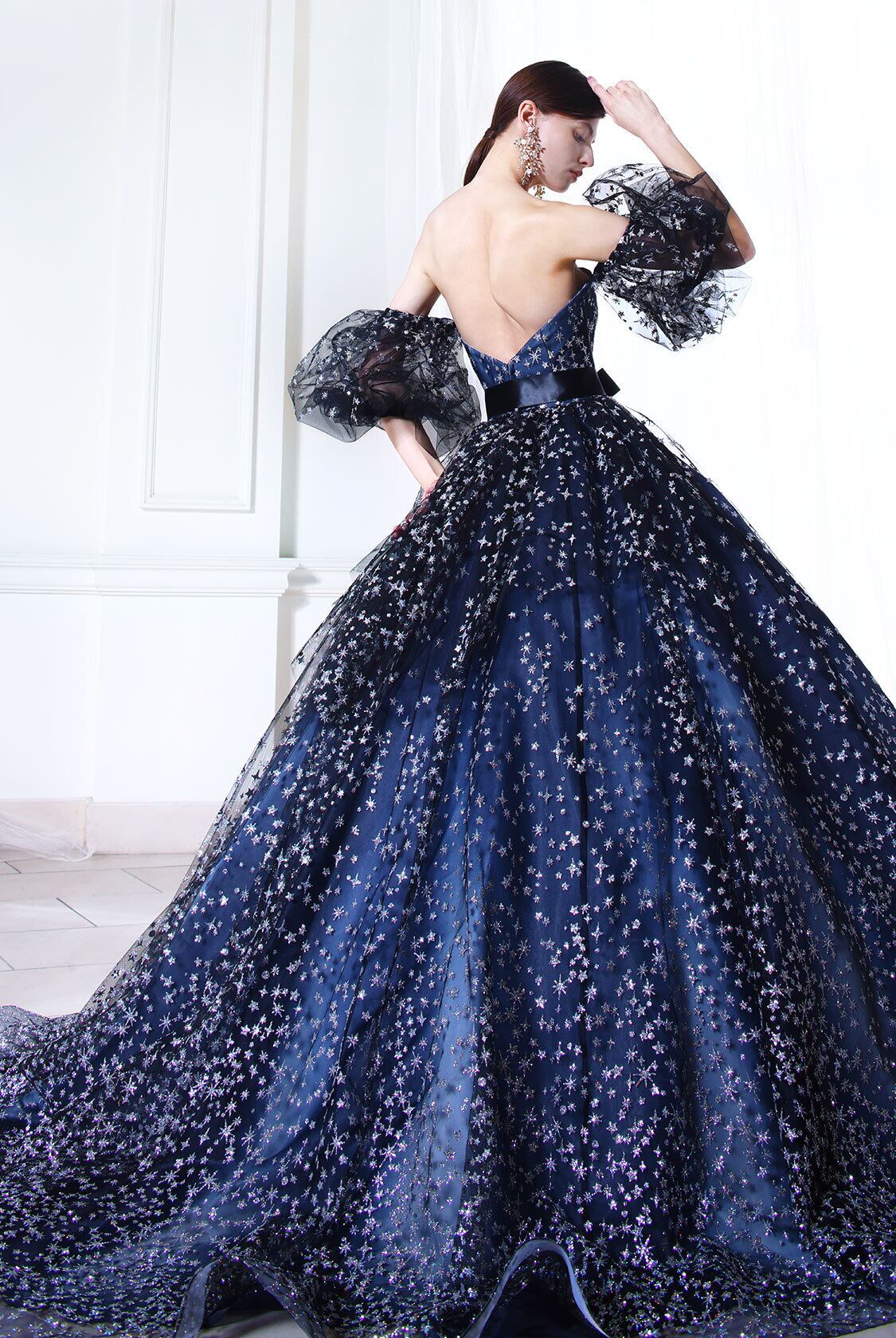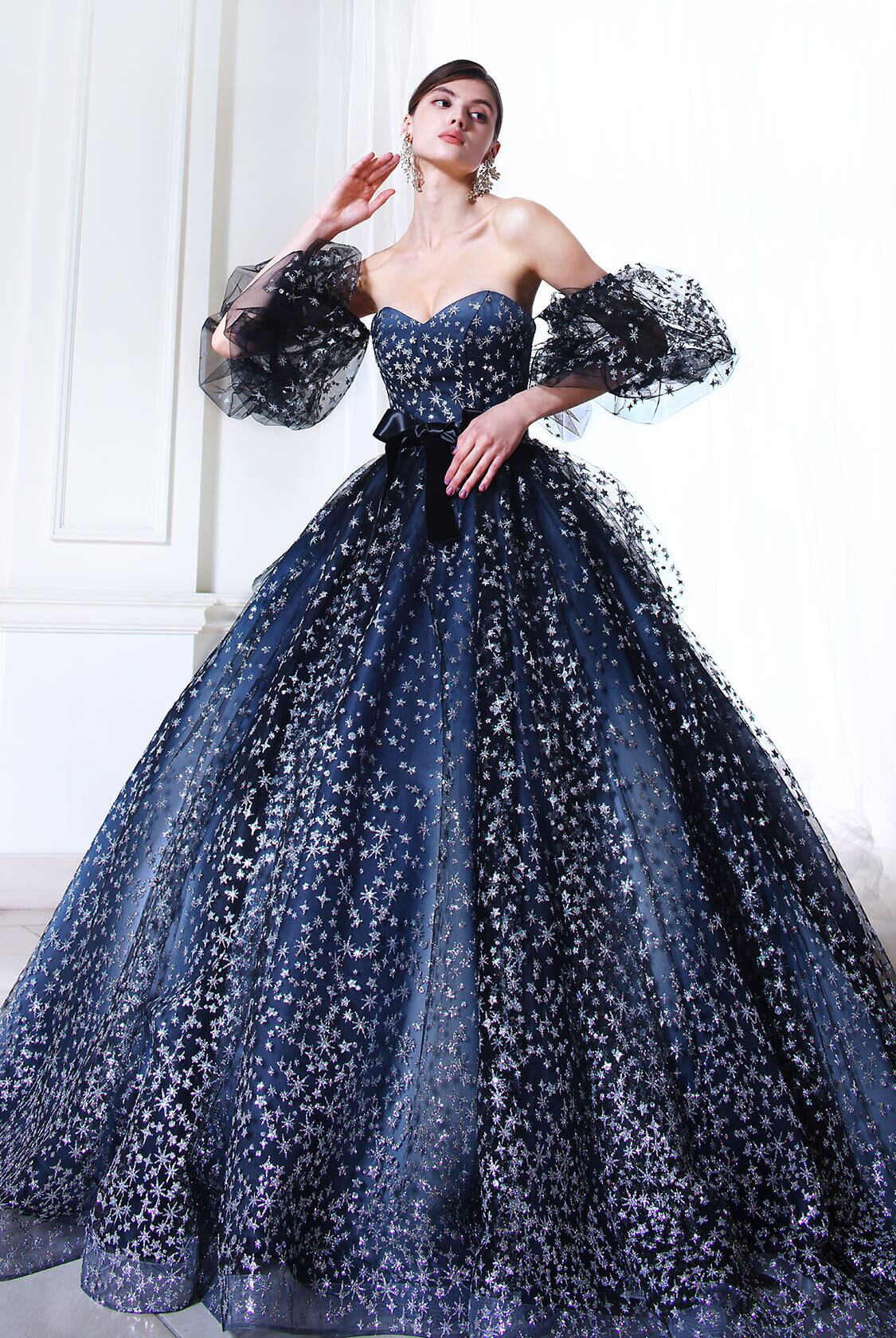 高品質!送料無料!カラードレス ネイビー色 パフスリーブ キラキラチュール かわいい ラメ エレガント 優雅 ハンドメイド トレーン サッシュベルト オーダードレス プリンセスライン パーティードレス 花嫁 豪華 結婚式/前撮り | David1021k Dress(ダヴィドレス)