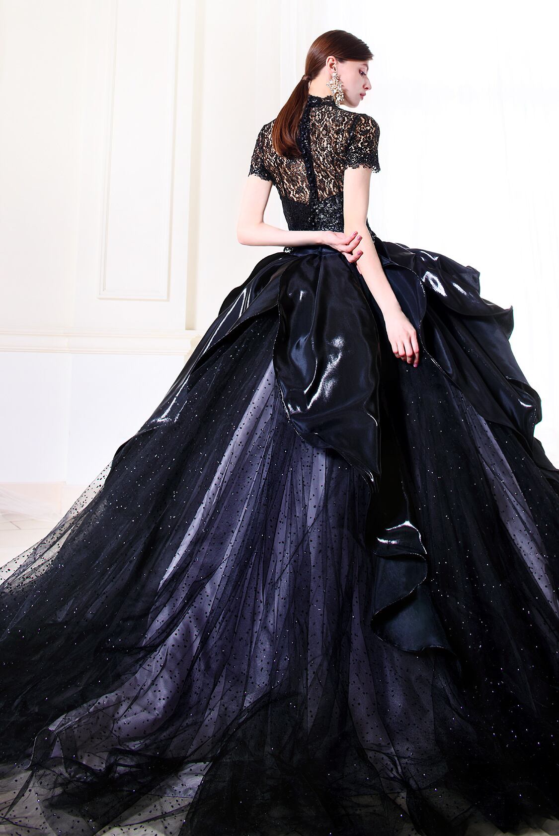 高品質!送料無料!カラードレス ブラック/黒 ベアトップ キラキラチュール 上品レースボレロ 大きな取り外し花リボン フリル 高級サテン かわいい ラメ エレガント 優雅 ハンドメイド トレーン オーダードレス プリンセスライン パーティードレス 花嫁 豪華 結婚式/前撮り