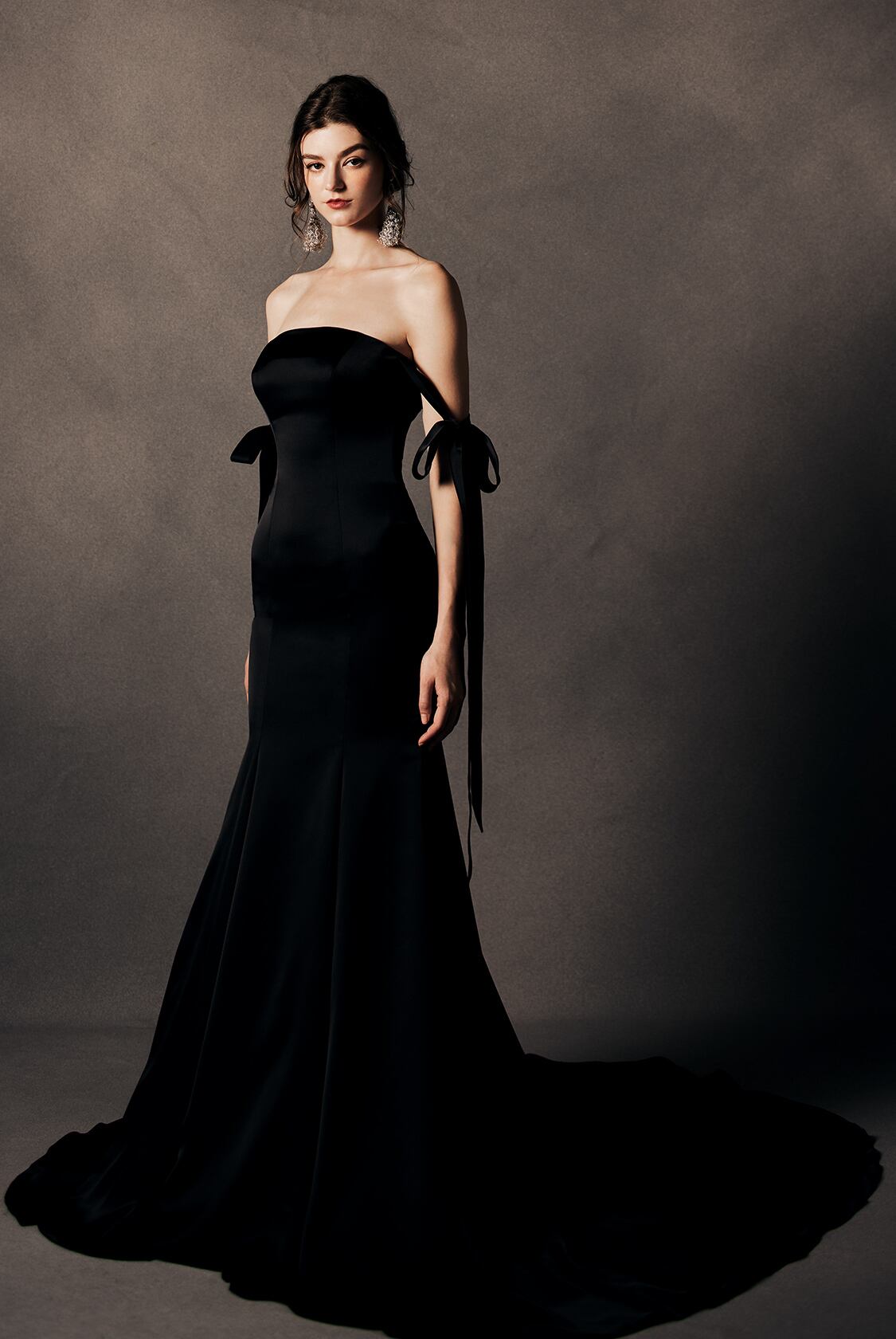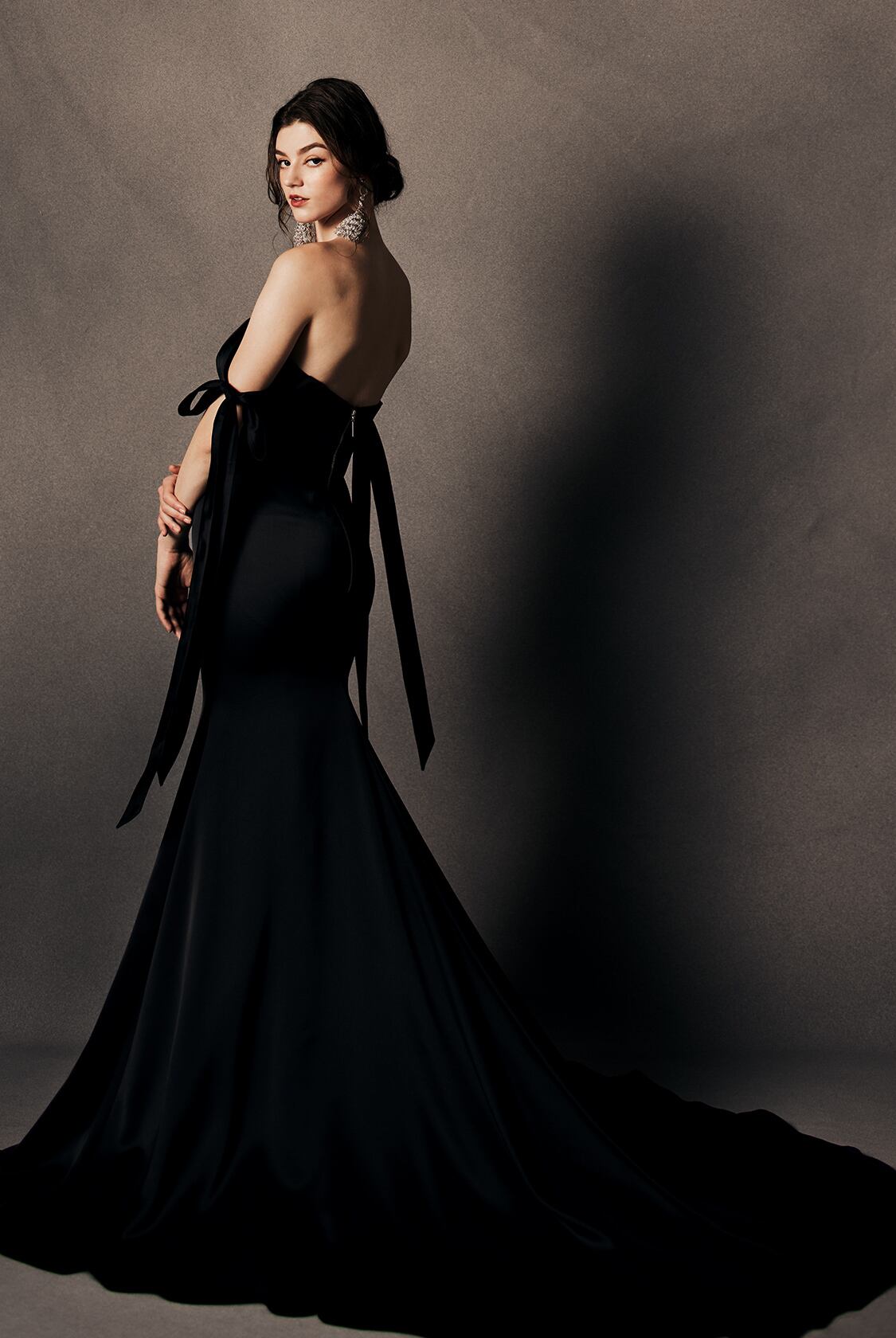 高品質!カラードレス ブラック/黒 マーメイドライン ヘプバーン風 優雅なシルエット パーティードレス トレーン ミディアムドレス 背中見せ 2次会/合コン/デート ハンドメイド オーダードレス 結婚式/前撮り/二次会/披露宴/演奏会/音楽会 | David1021k Dress(ダヴィドレス)