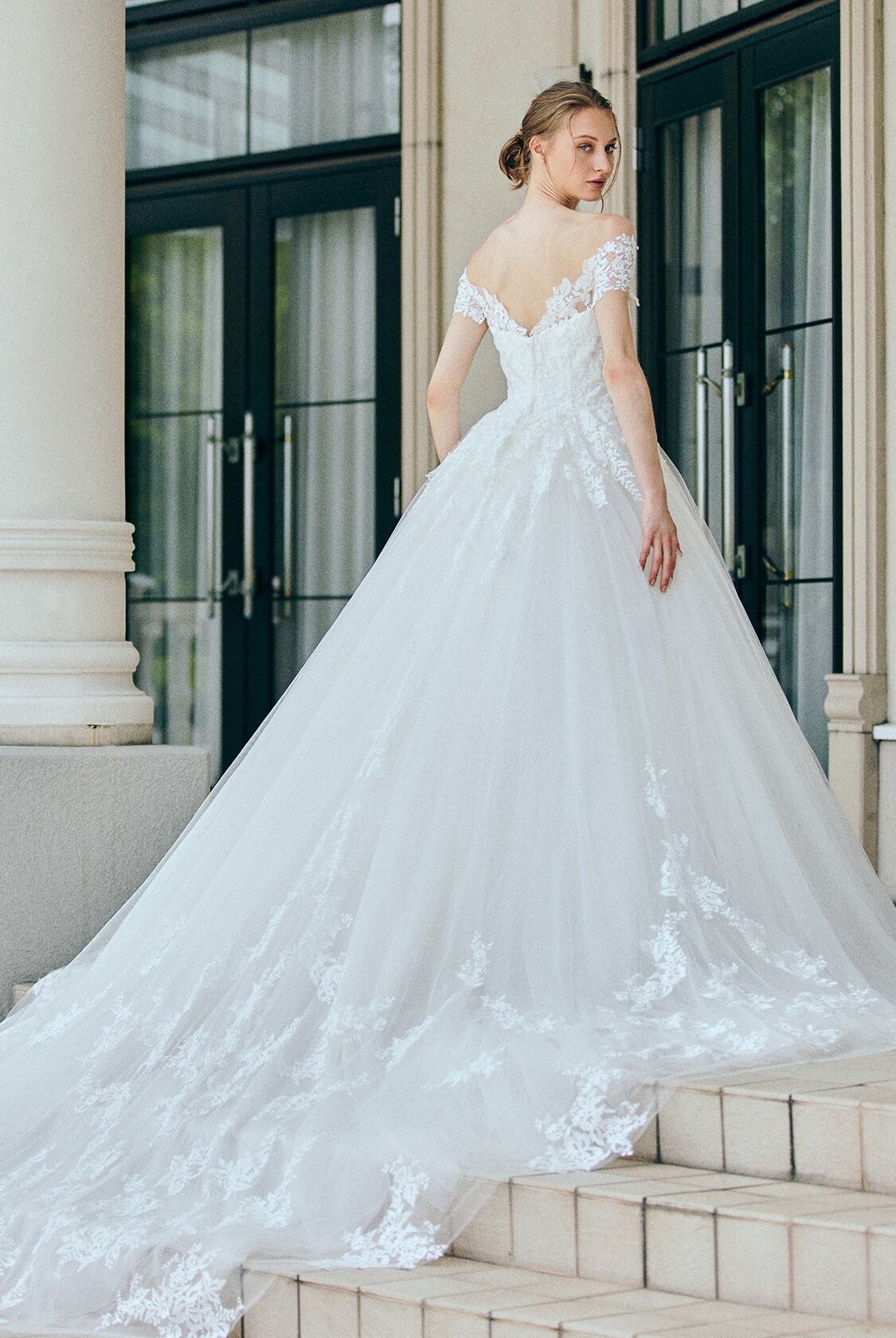 高品質!送料無料!ウエディングドレス かわいい オフショルダー 上品レース 花柄のモチーフ刺繍が美しく エレガント ハンドメイド 抜群のおしゃれ見え トレーン オーダードレス オーダーメイド 花嫁 豪華 結婚式/前撮り | David1021k Dress(ダヴィドレス)