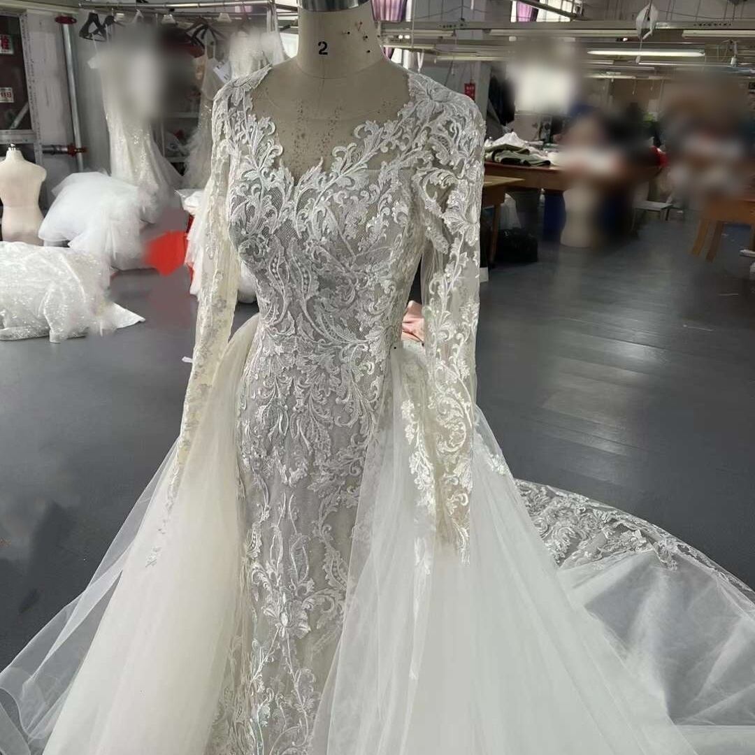 韓国風ビジュー ウエディングドレスキラキラのハンドビーディング長袖 華やかなトレーン プリンセスライン 輝きな光彩を放つ
