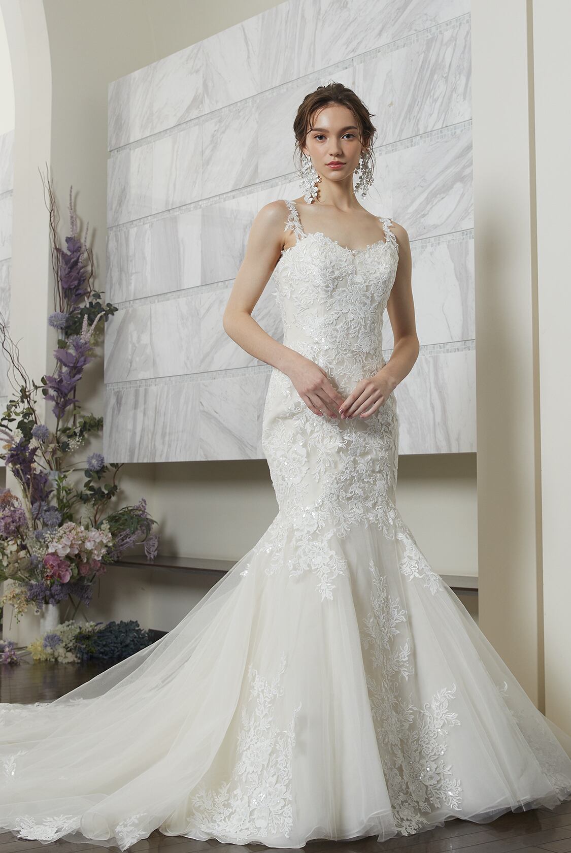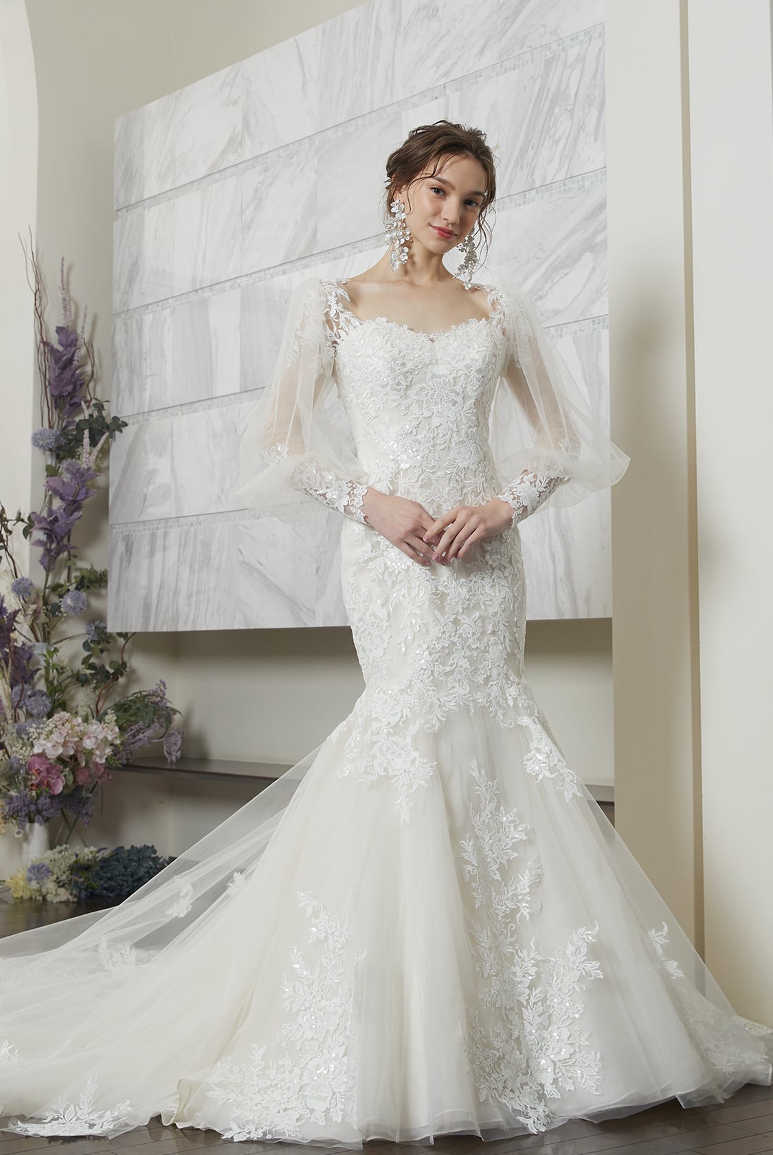 送料無料!ウエディングドレス マーメイドライン 長袖 キャミソール パフスリーブ 背中見せ/バックレス 上品レース 花柄のモチーフ刺繍が美しく 華やかなトレーン 優雅 オーダードレス パーティードレス 花嫁 結婚式/前撮り | David1021k Dress(ダヴィドレス)