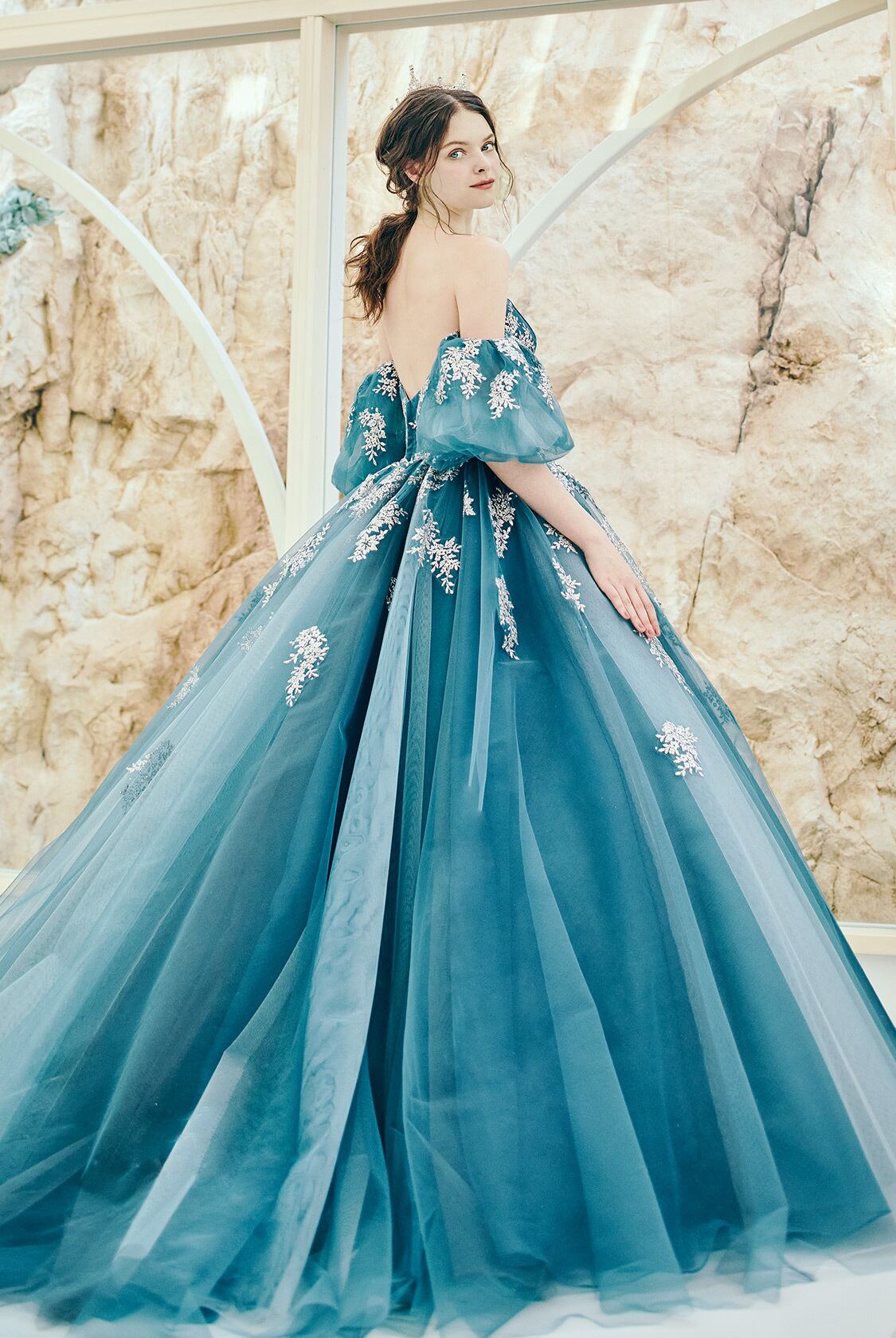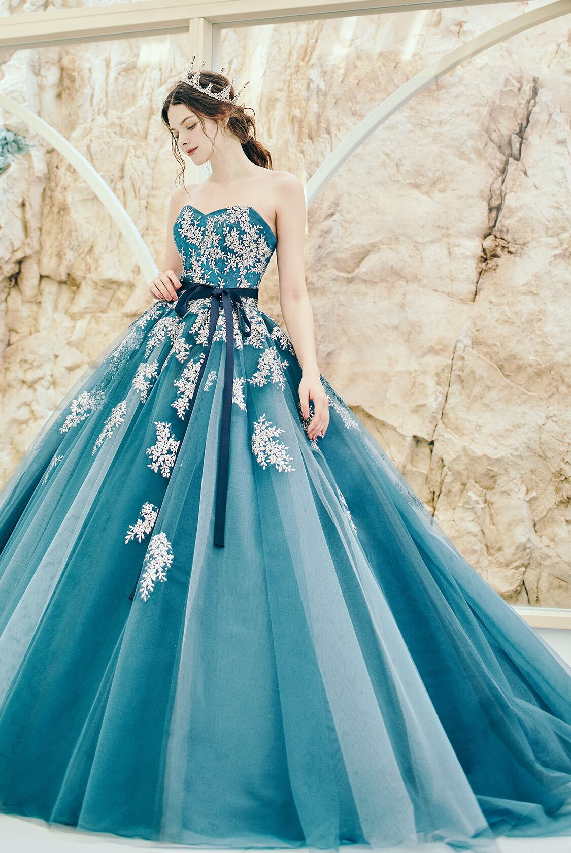 送料無料!カラードレス ベアトップ パフスリーブ グリーン グラデーション 花モチーフ トレーン 優雅 オーダードレス プリンセスライン パーティードレス 花嫁 結婚式/前撮り | David1021k Dress(ダヴィドレス)