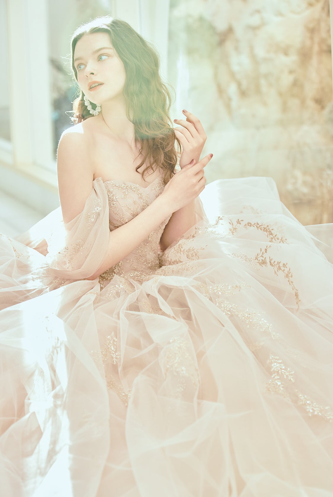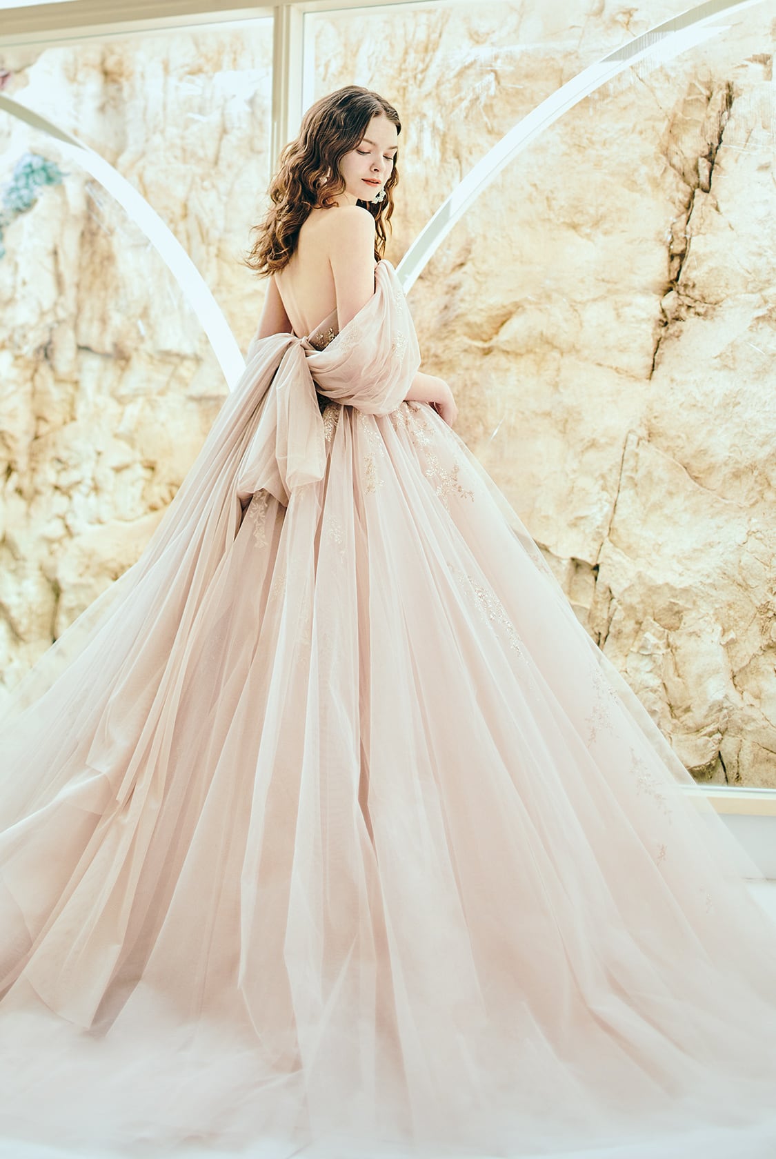 送料無料!カラードレス ベアトップ オフショルダー ベージュ色 上品レース トレーン 優雅 オーダードレス プリンセスライン パーティードレス 花嫁 結婚式/前撮り | David1021k Dress(ダヴィドレス)