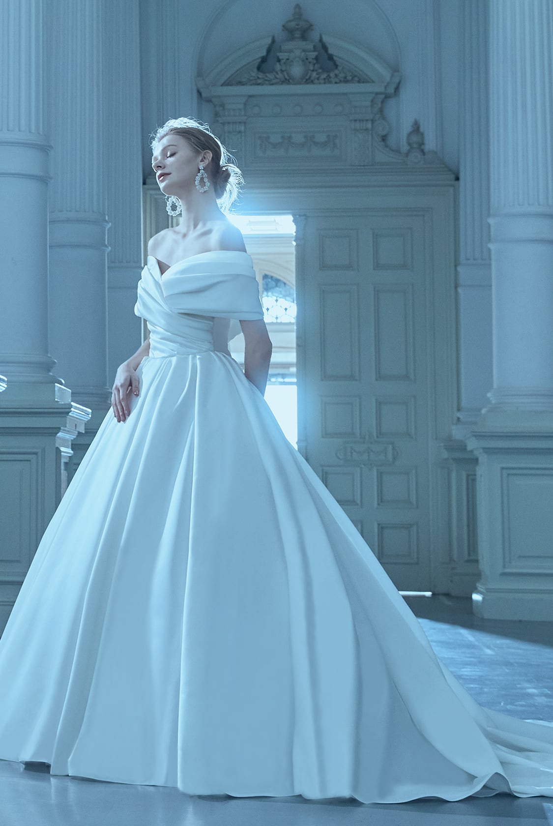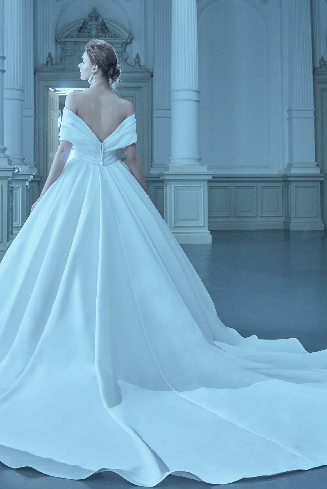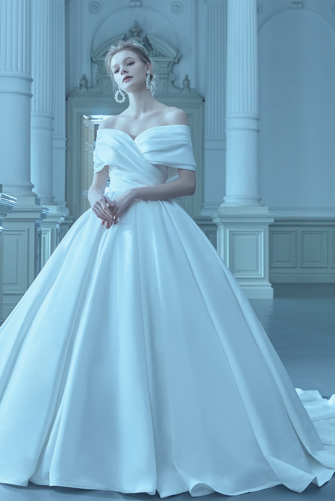 送料無料!ウエディングドレス オフショルダー 高級サテン 華やかなトレーン 優雅 背中見せ/バックレス オーダードレス パーティードレス 花嫁 結婚式/前撮り | David1021k Dress(ダヴィドレス)