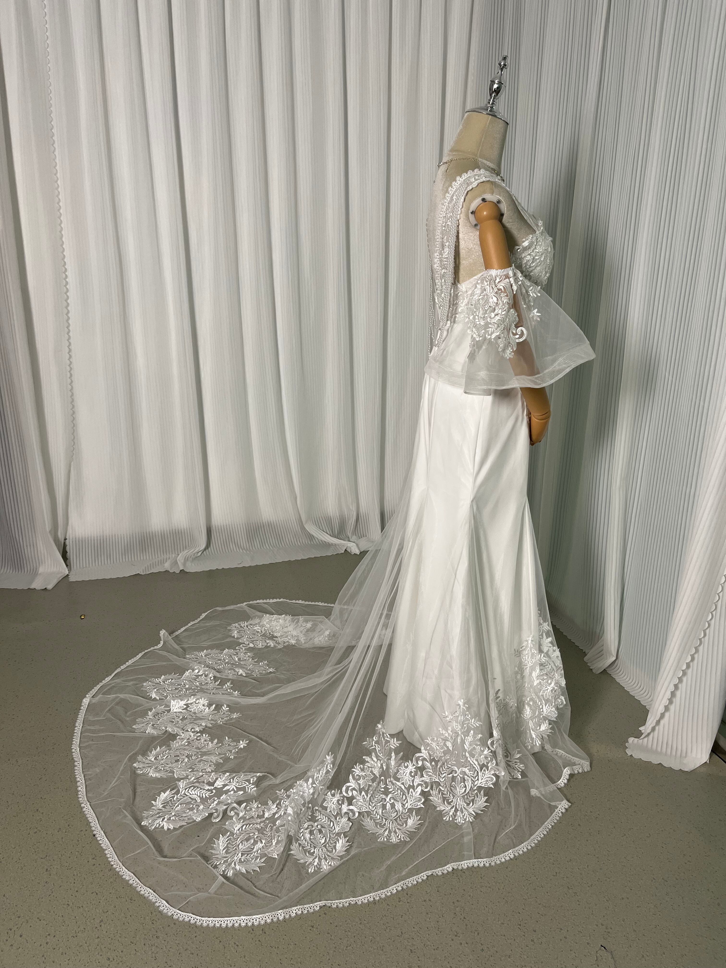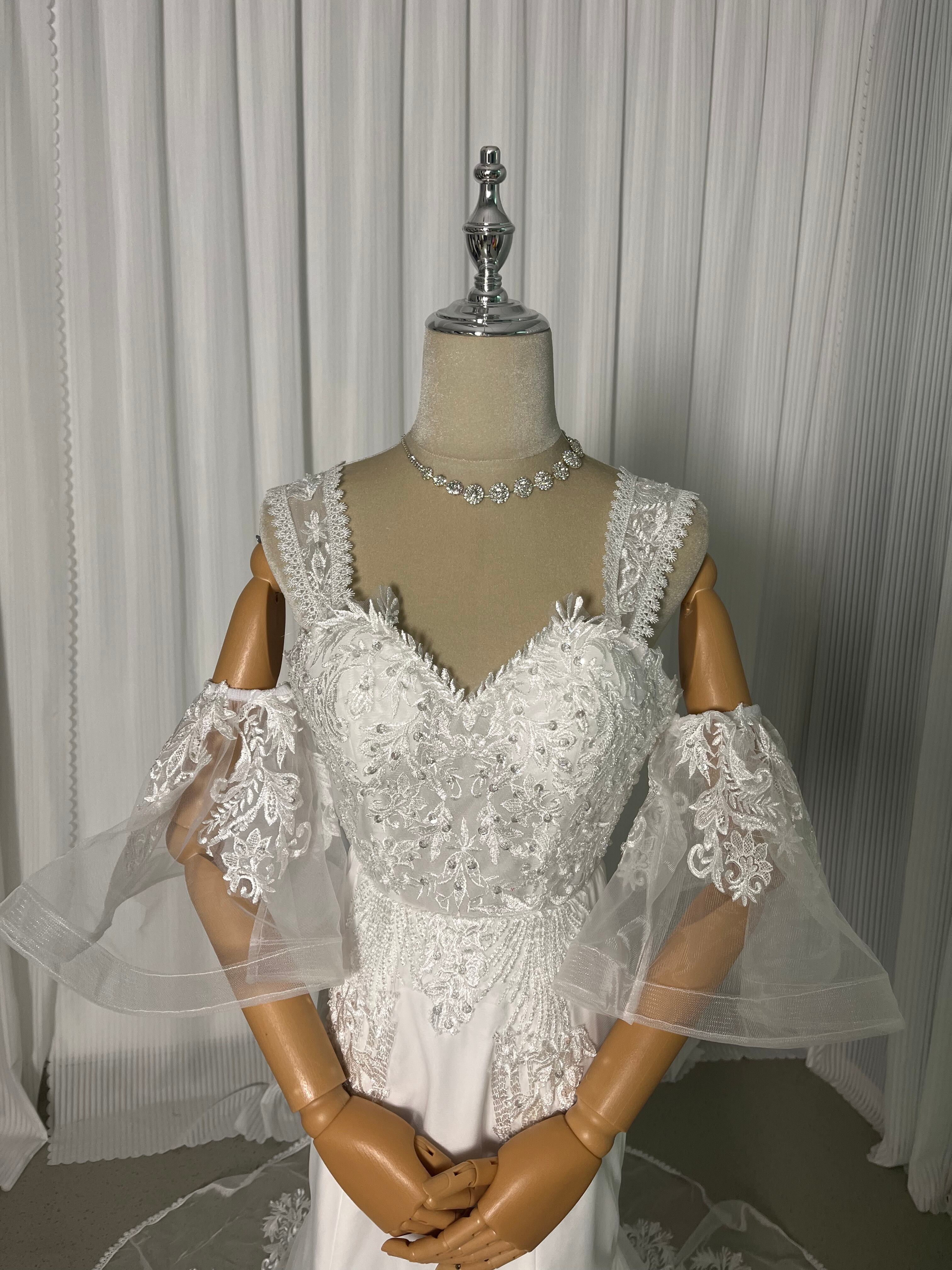輝きな光彩を放つ パフスリーブ ウエディングドレス ソフトチュール 3D立体レース ロングトレーン 結婚式