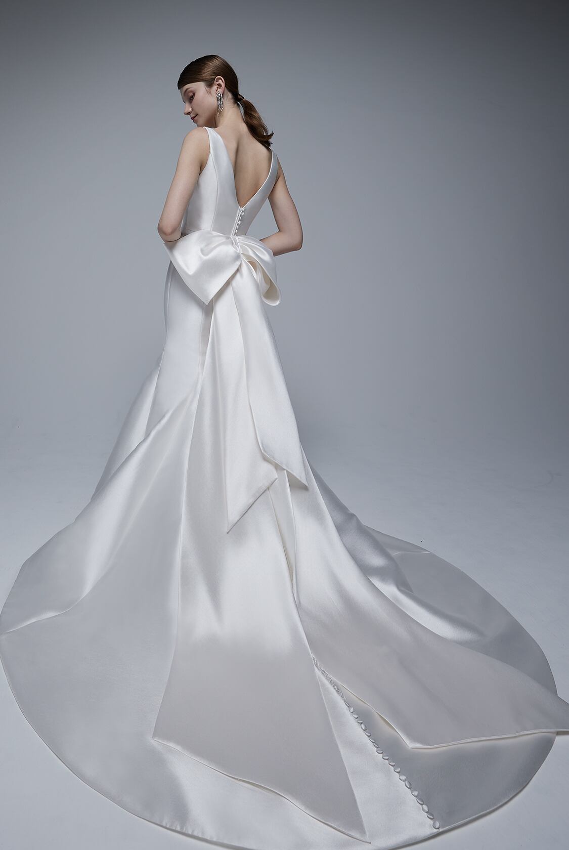 送料無料!ウエディングドレス ノースリーブ マーメイドライン 高級サテン バックリボン 背中見せ/バックレス 優雅なシルエット 華やかなトレーン オーダードレス 憧れのドレス パーティードレス クラシカル 花嫁 結婚式/前撮り | David1021k Dress(ダヴィドレス)