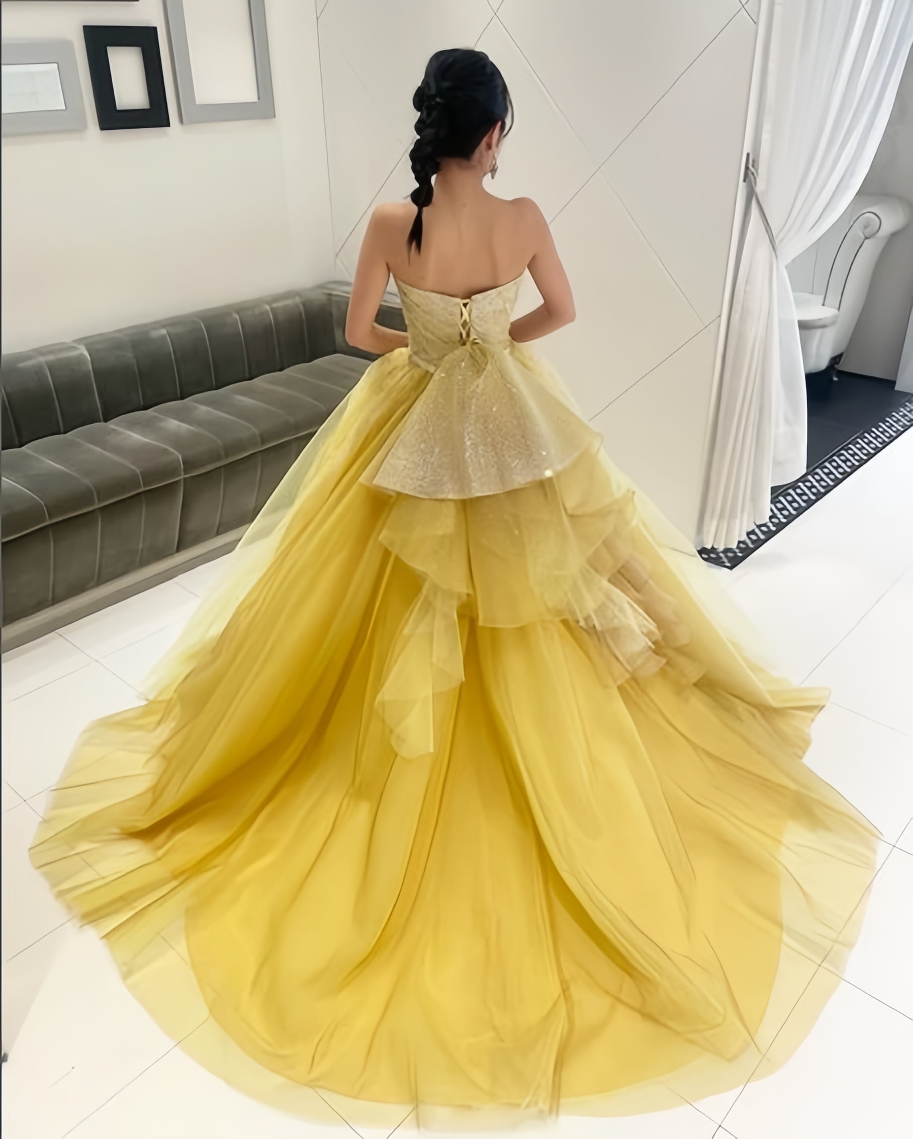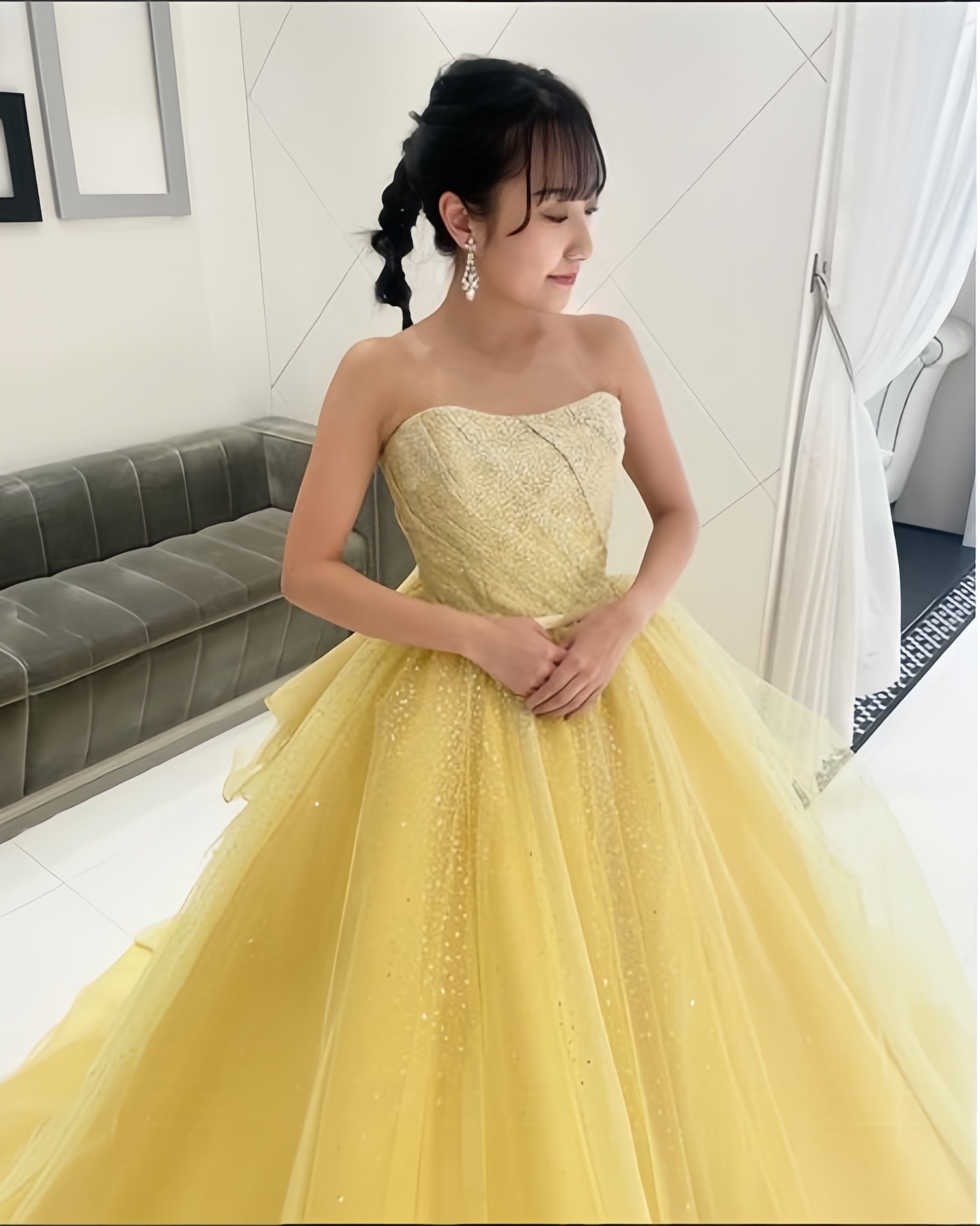 送料無料!カラードレス ベアトップ バックリボン イエロー/黄色い キラキラチュール トレーン 優雅 オーダードレス プリンセスライン パーティードレス 花嫁 結婚式/前撮り | David1021k Dress(ダヴィドレス)