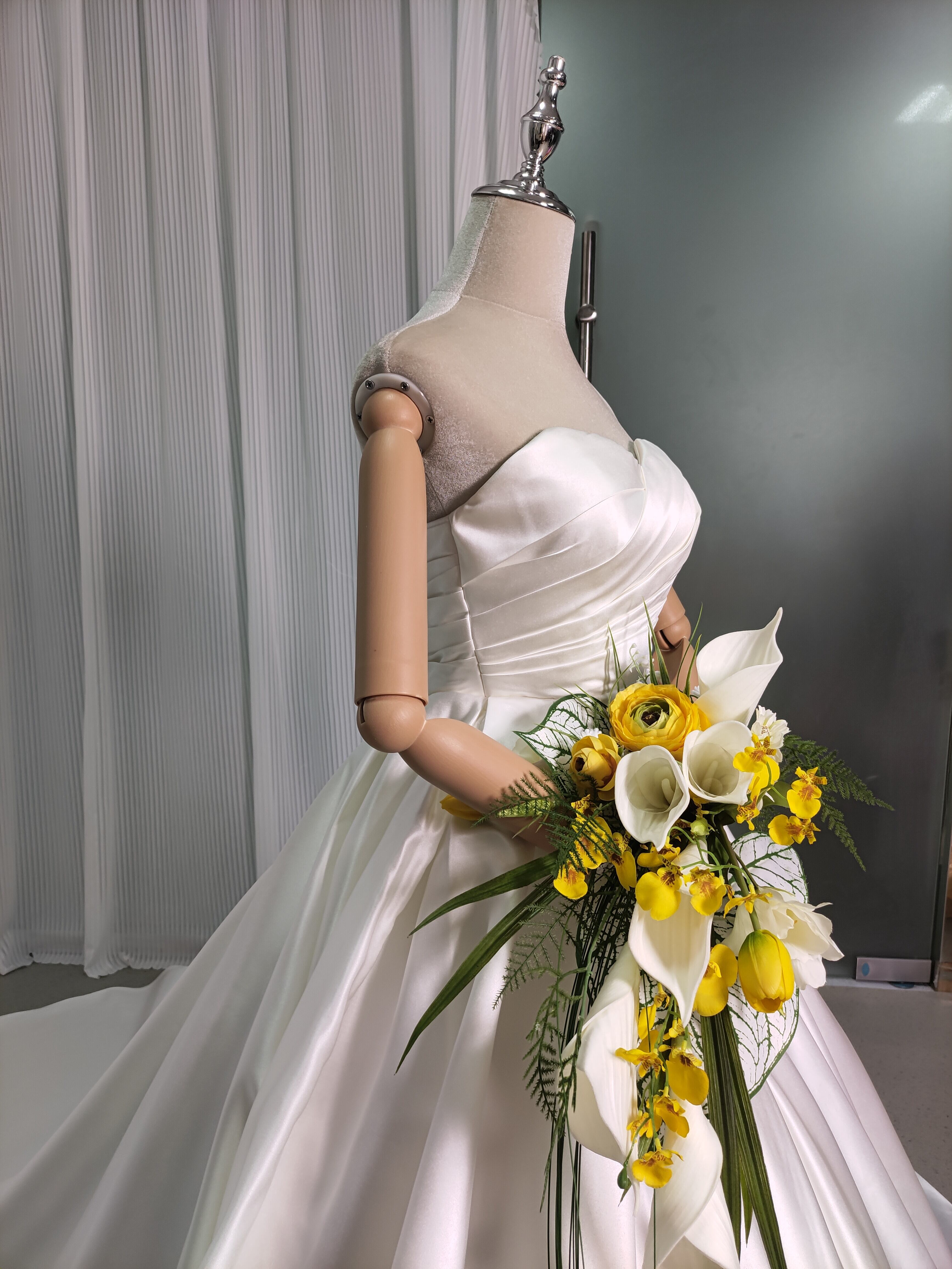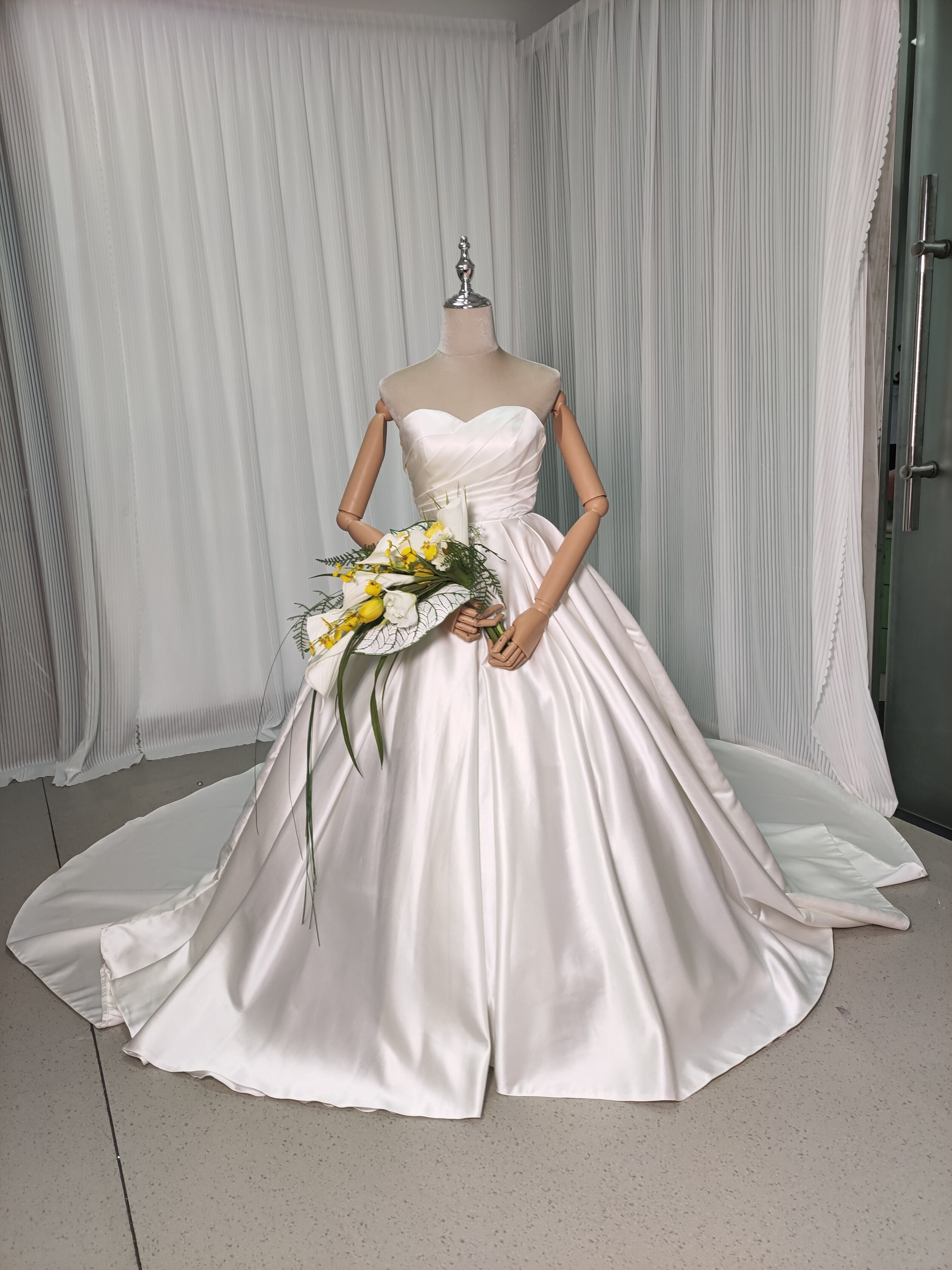 人気上昇!ウエディングドレス ホワイト エンパイア ベアトップ 華やかなトレーン/結婚式/披露宴