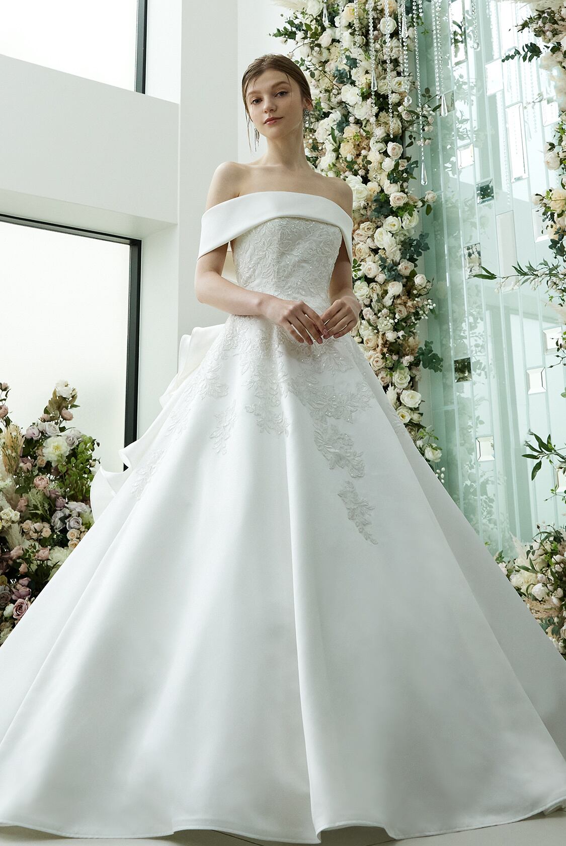 送料無料!ウエディングドレス オフショルダー ベアトップ 華やかなトレーン バックリボン フリル 上品レース オーダードレス 憧れのドレス カジュアル クラシカル ハンドメイド 花柄のモチーフ刺繍が美しく 花嫁/前撮り/結婚式/披露宴