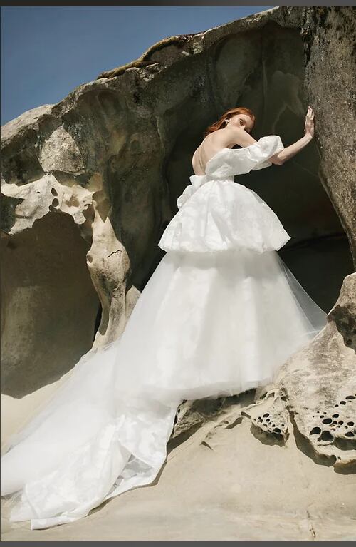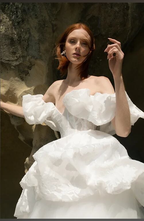 送料無料!ウエディングドレス オフショルダー vネック ボリューミー 華やかなトレーン ソフトチュール オーダードレス 憧れのドレス カジュアル クラシカル ハンドメイド 花嫁/前撮り/結婚式/披露宴