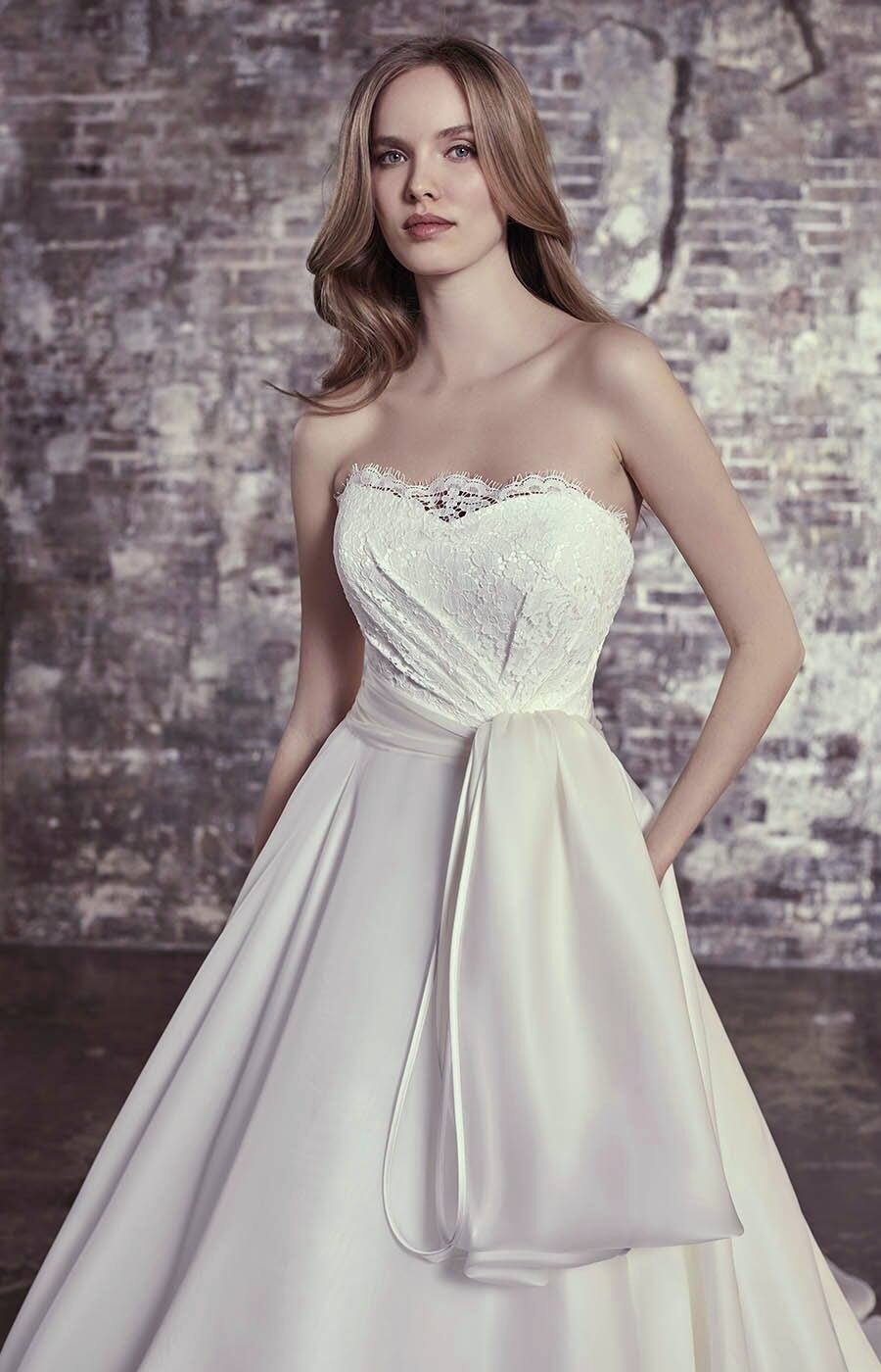 送料無料!ウエディングドレス パーティードレス ベアトップ Aライン 華やかなトレーン リボン オーダードレス 憧れのドレス クラシカル ハンドメイド 花嫁/前撮り/結婚式/披露宴 | David1021k Dress(ダヴィドレス)