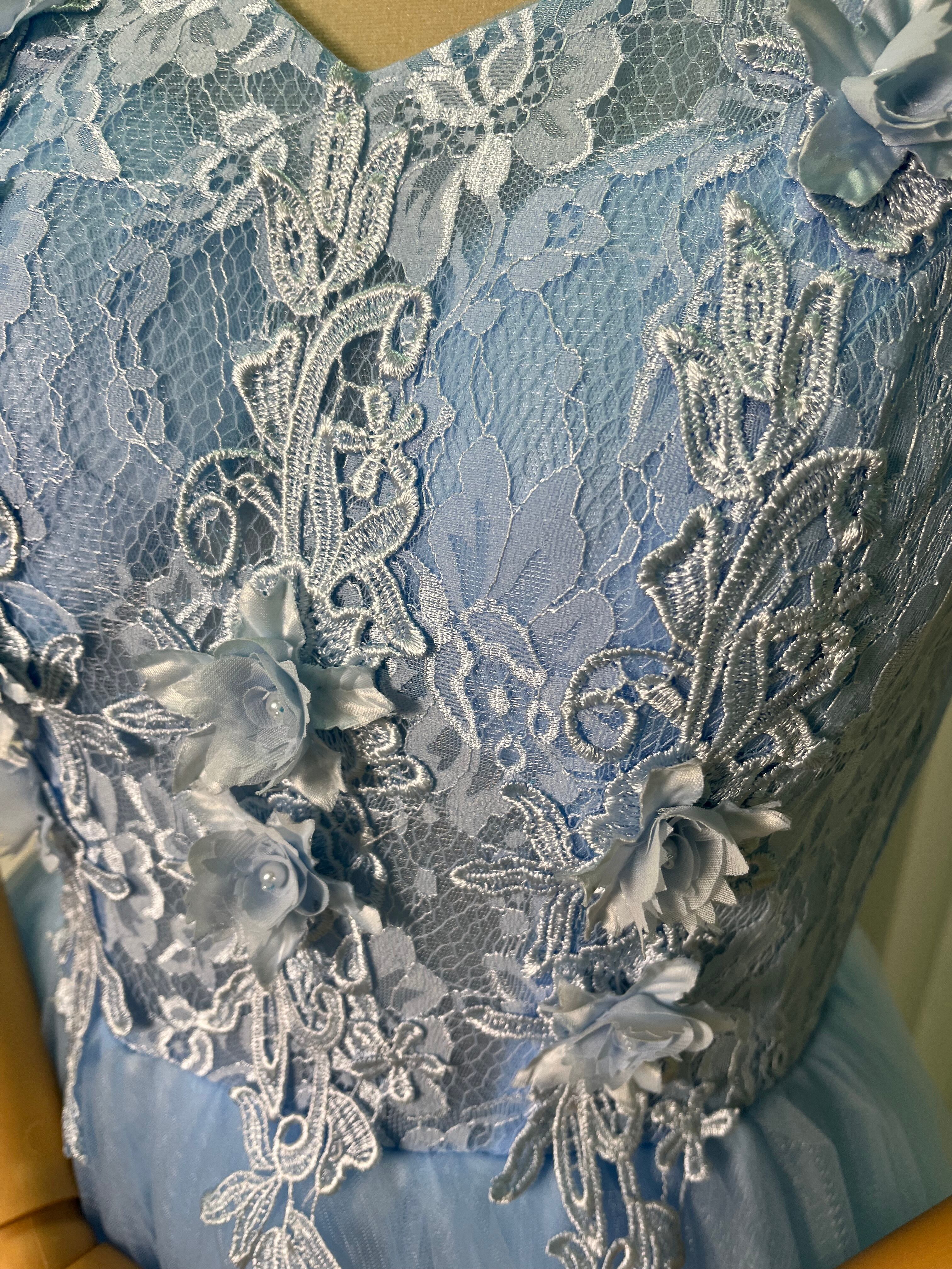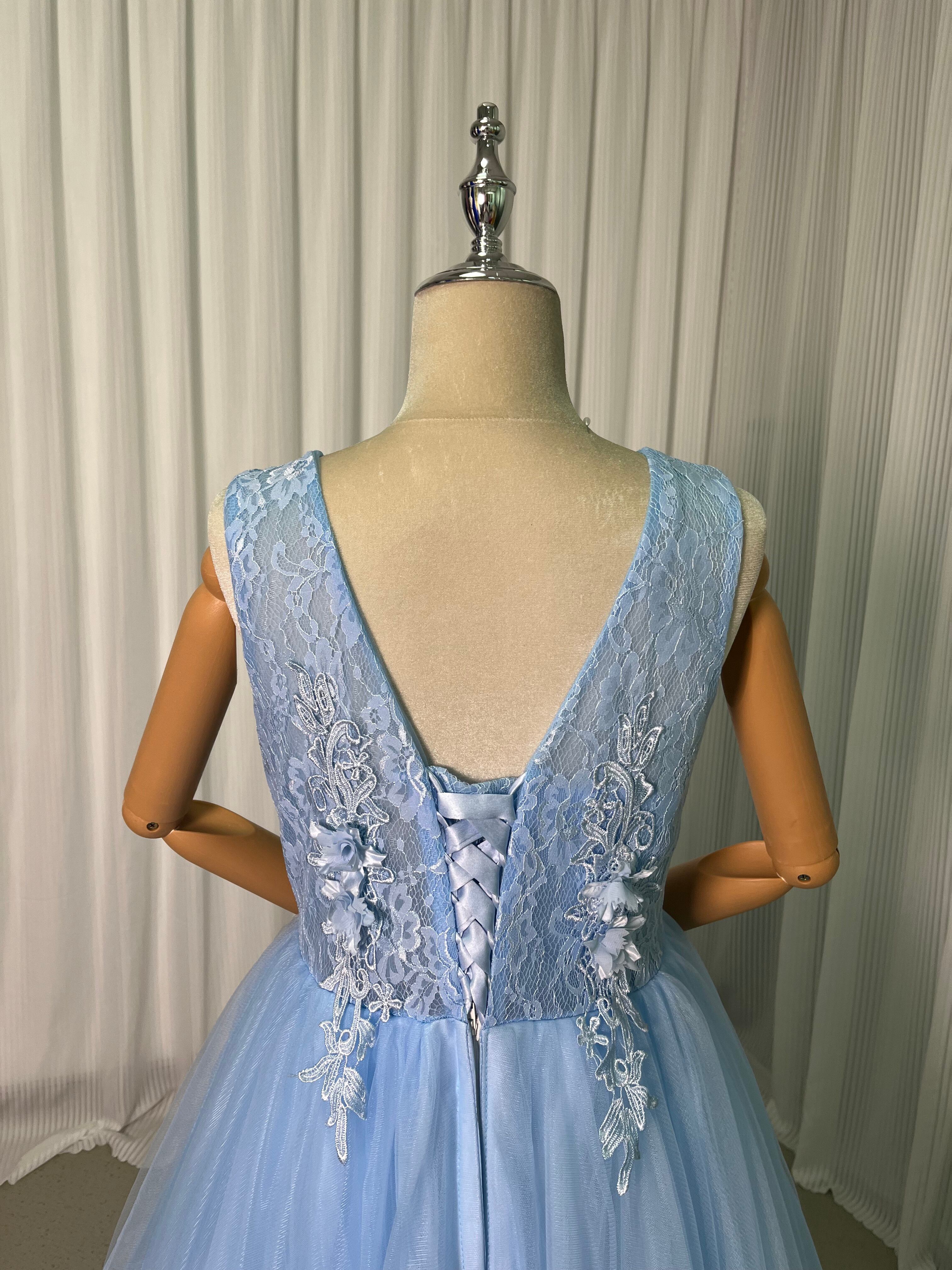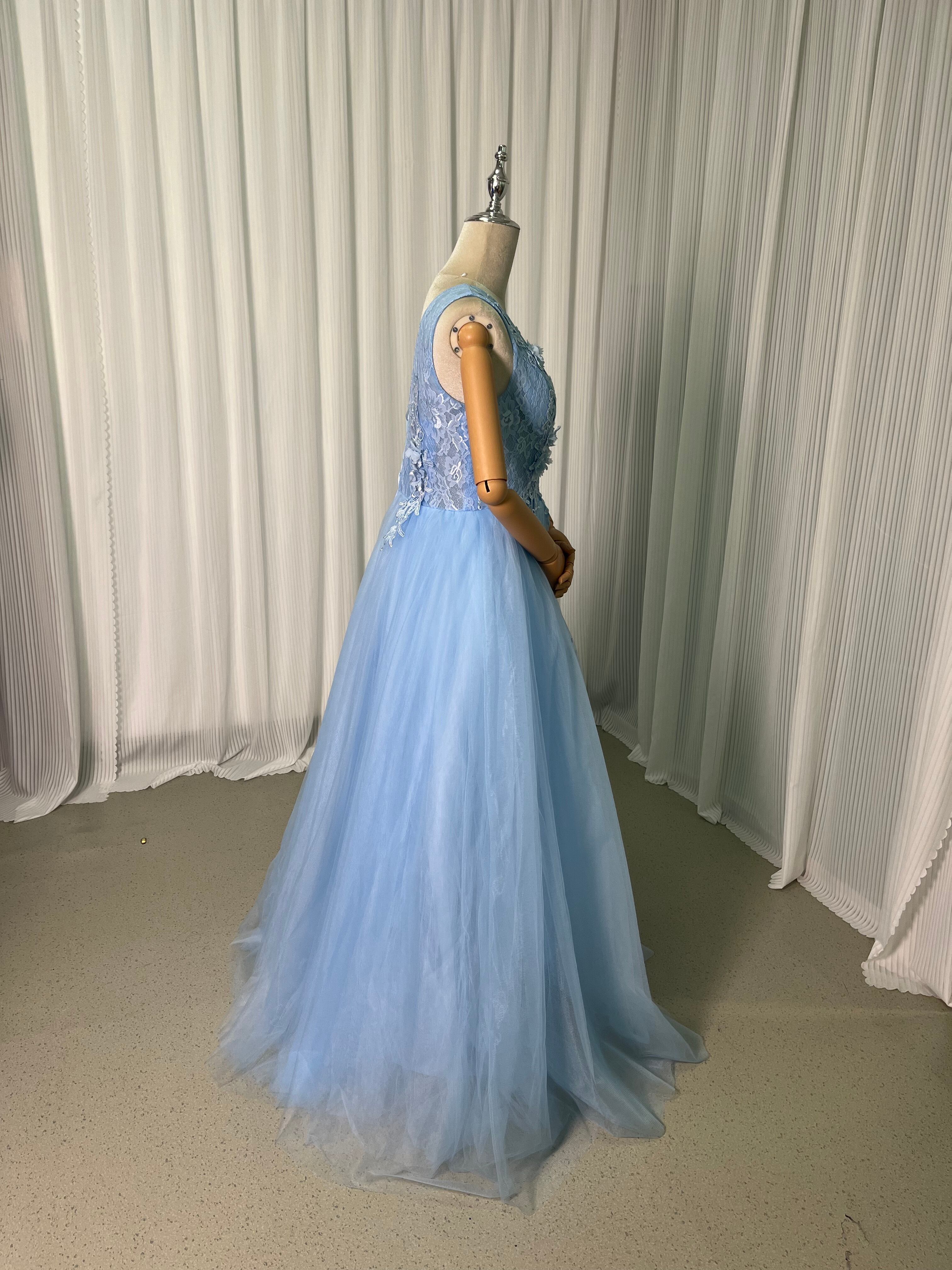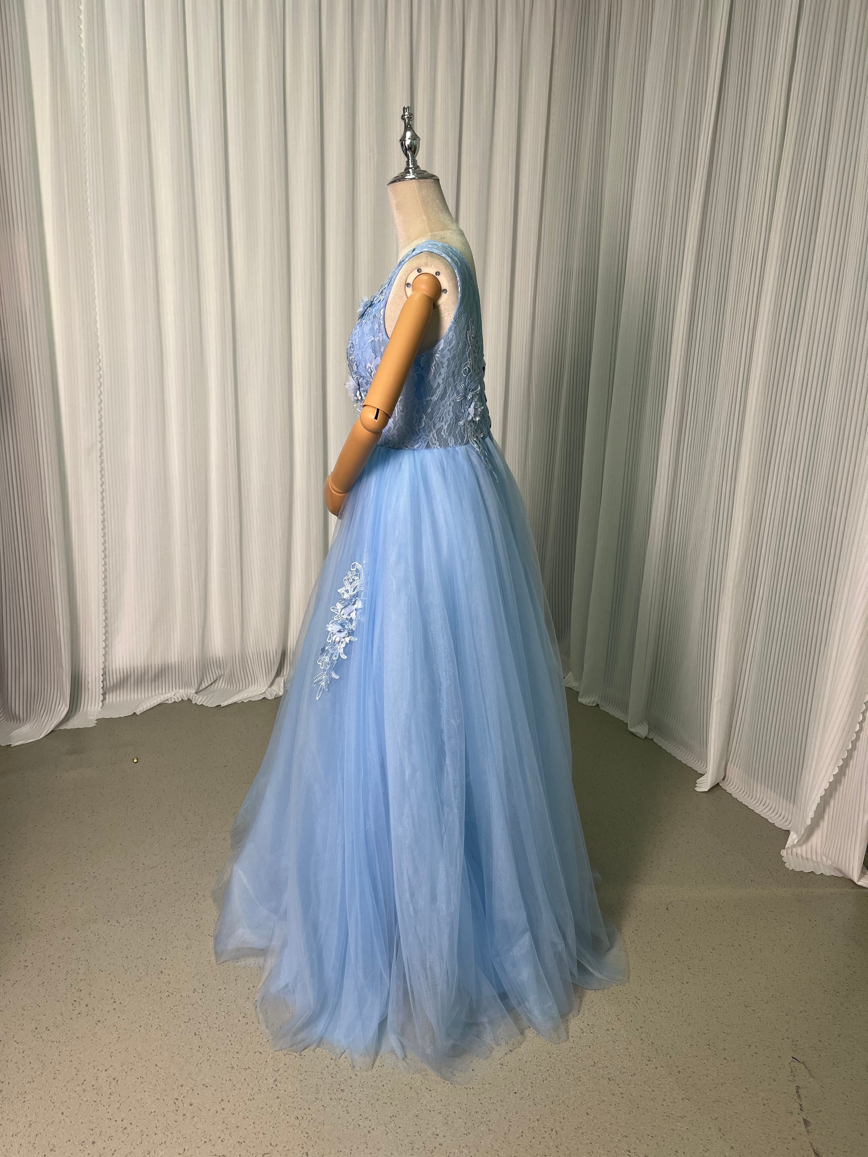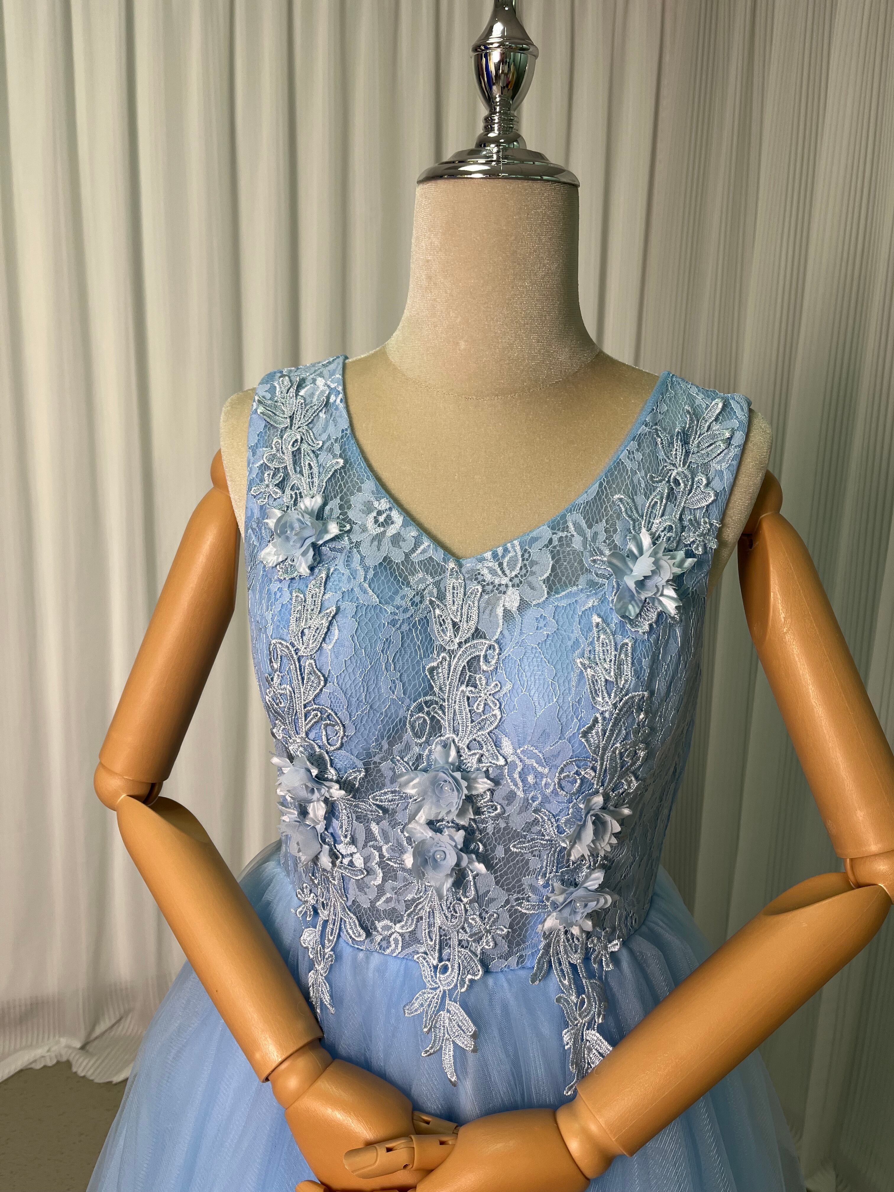 高品質!ライトブルー カラードレス 上品レース ソフトチュール 結婚式/前撮り/二次会/2次会/披露宴/演奏会/音楽会