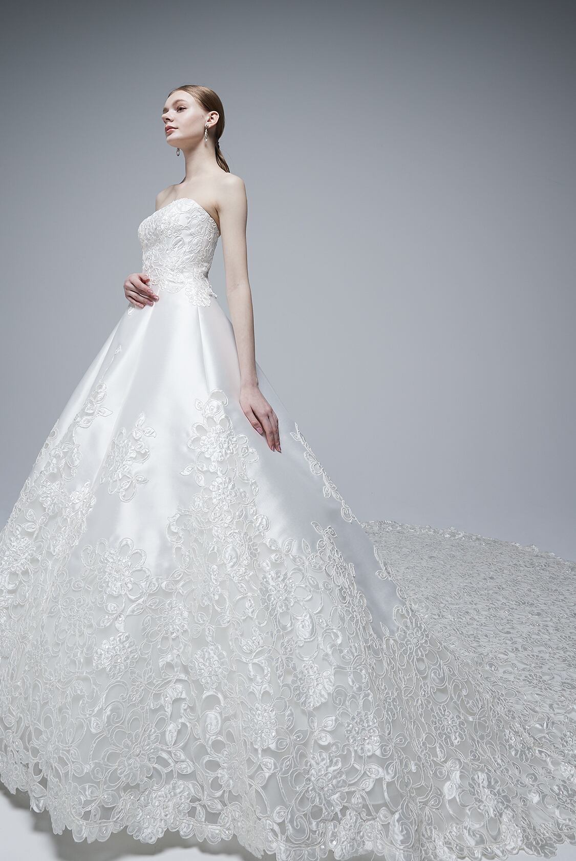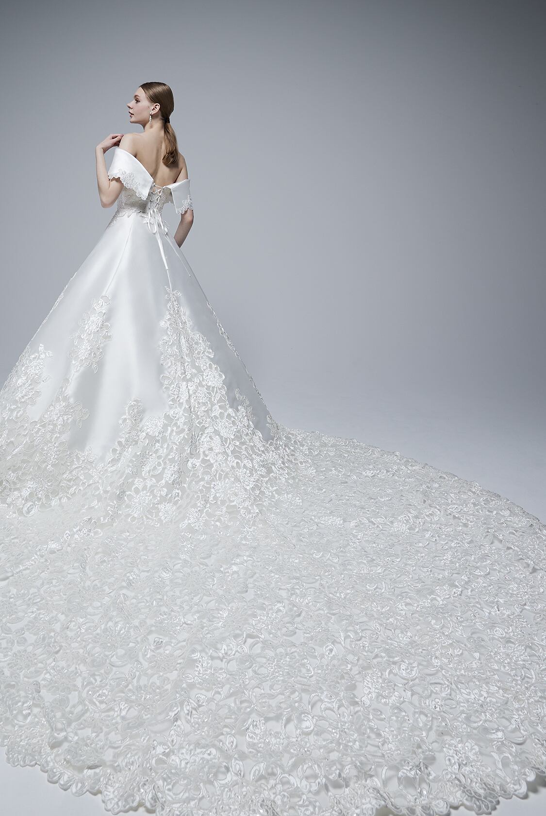 高品質!送料無料!ウエディングドレス ベアトップ オフショルダー ロールカラー 総レーストレーン 華やかなトレーン プリンセスライン 高級サテン オーダードレス ハンドメイド 花嫁/前撮り/結婚式/披露宴
