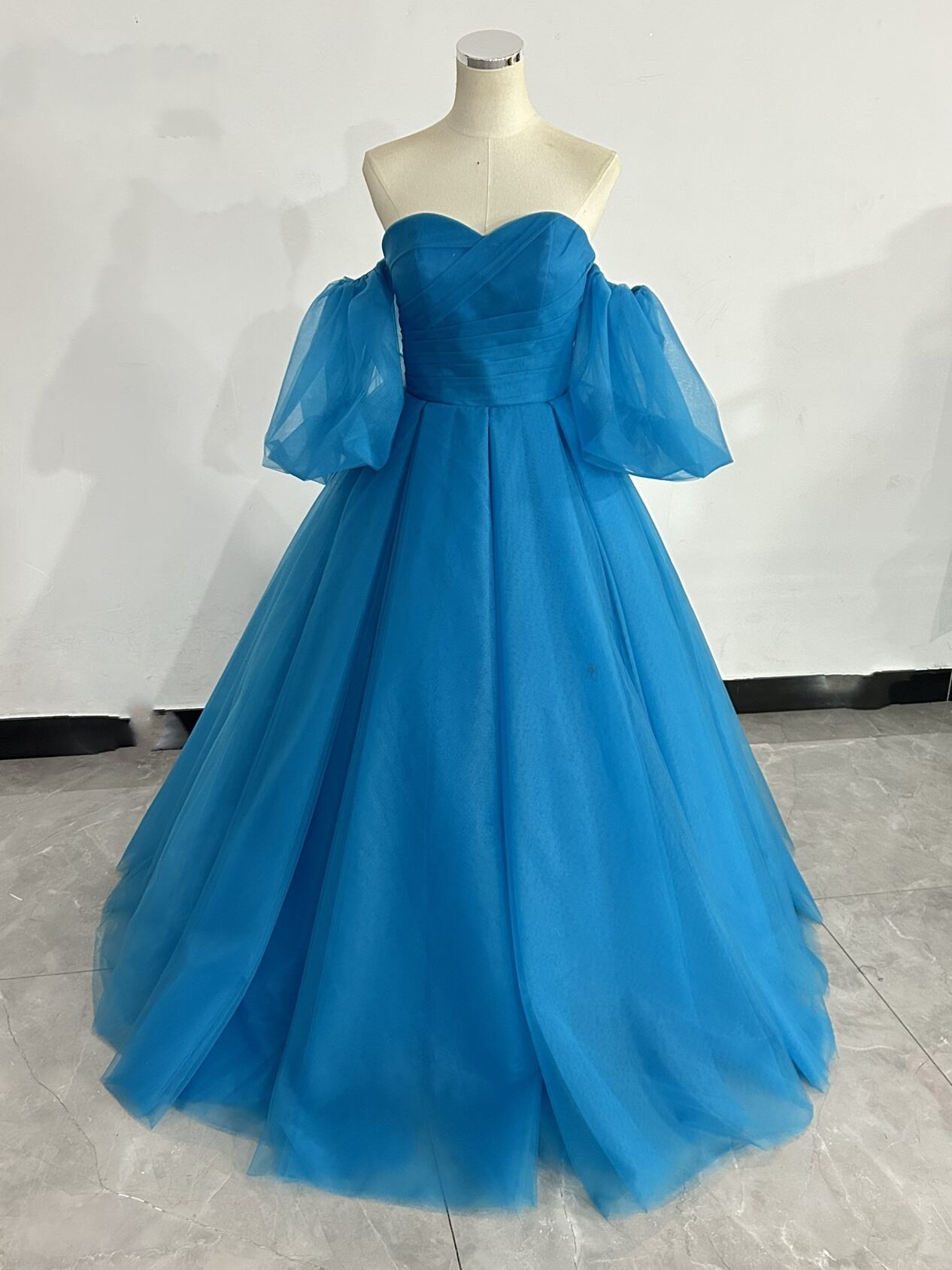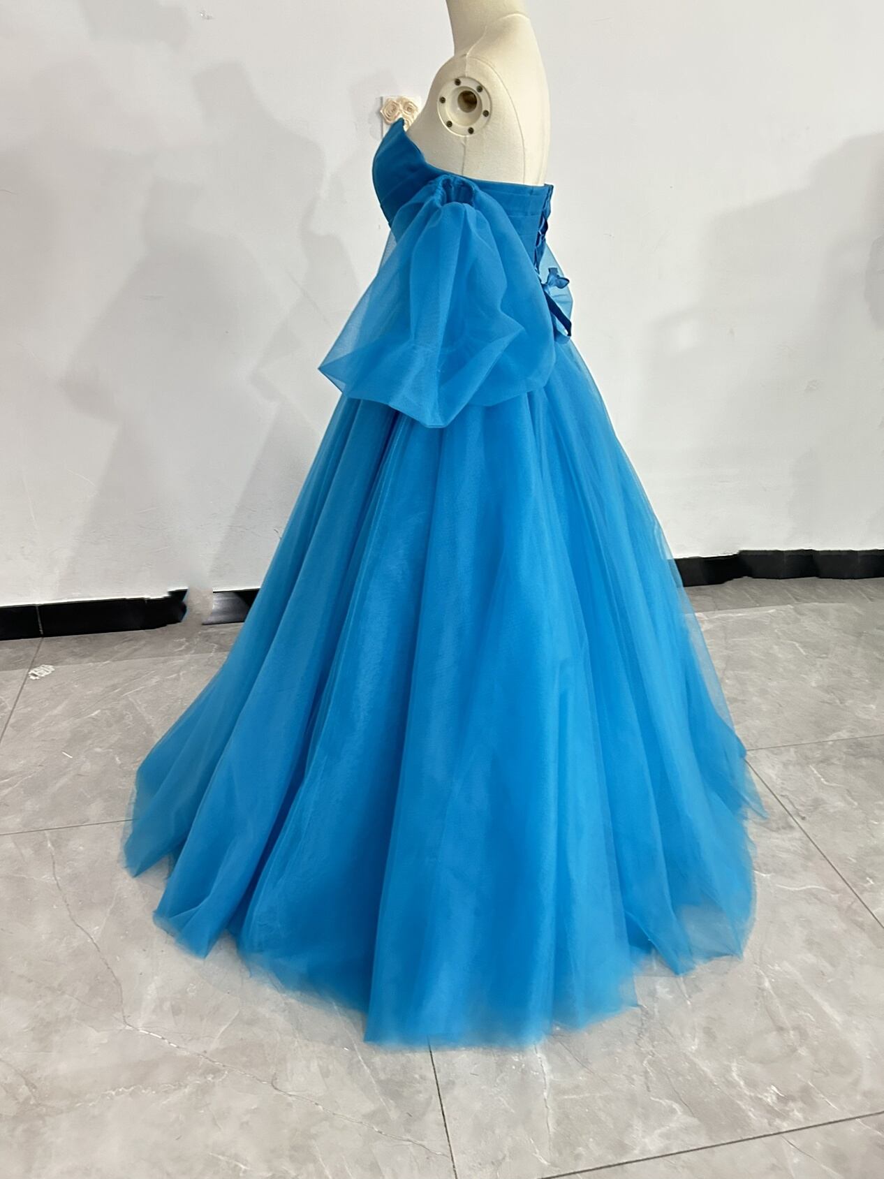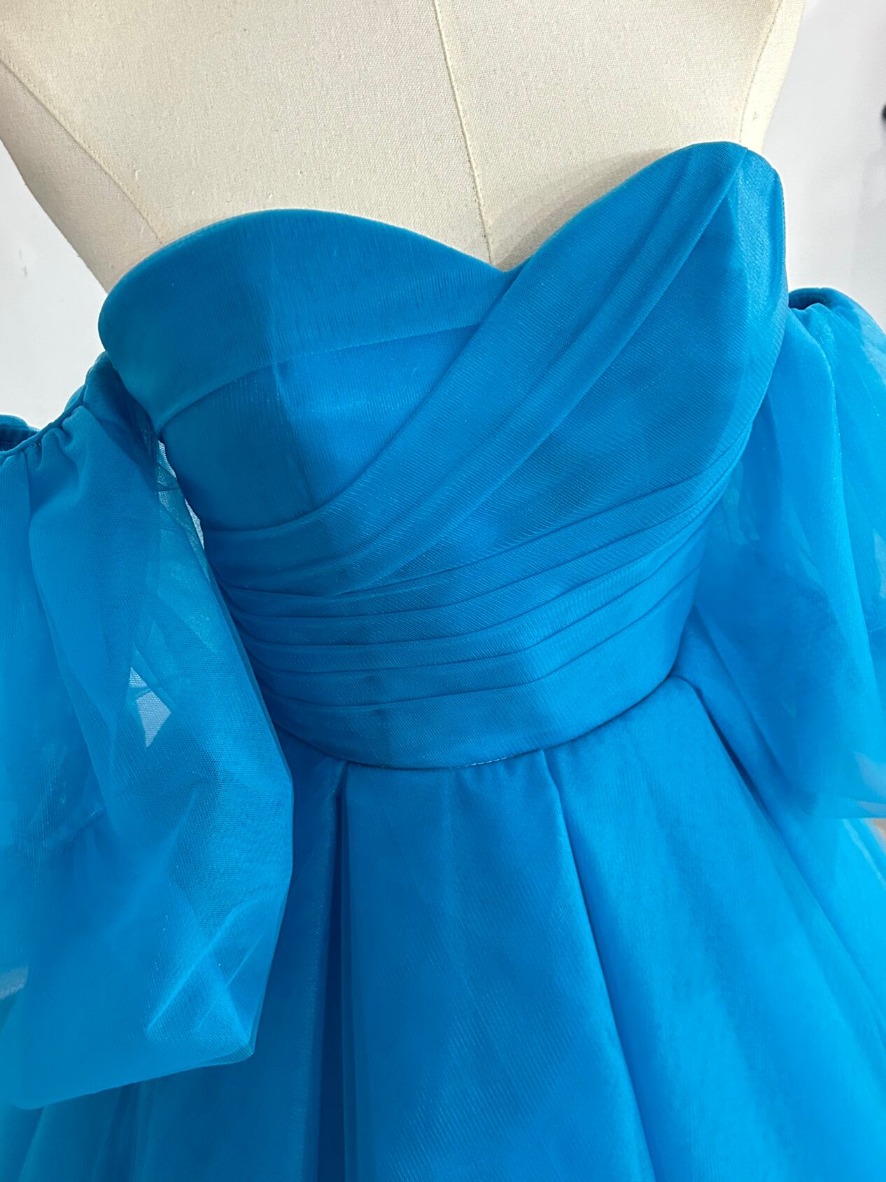 送料無料!人気上昇!爽やかで優しいブルーカラードレス パーティードレス ベアトップ 取り外し 姫袖 /結婚式/披露
