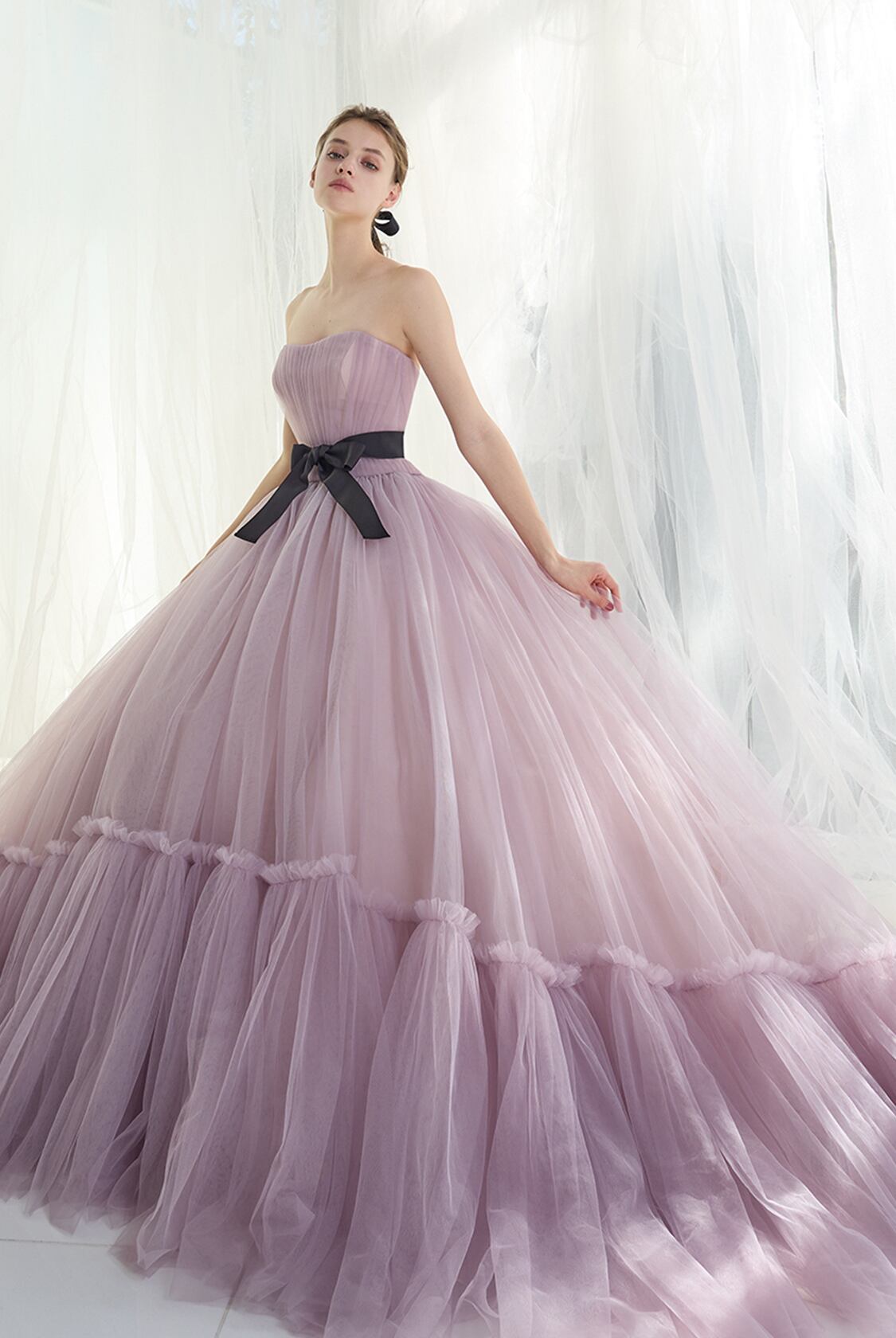 高品質!送料無料!カラードレス ベアトップ パープル/紫 ベルト ラベンダー色 ソフトチュール タック かわいい エレガント ハンドメイド ボリューミー トレーン オーダードレス プリンセスライン 花嫁 豪華 結婚式/前撮り