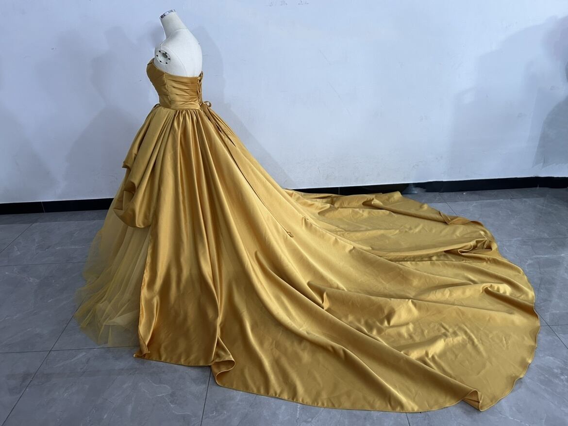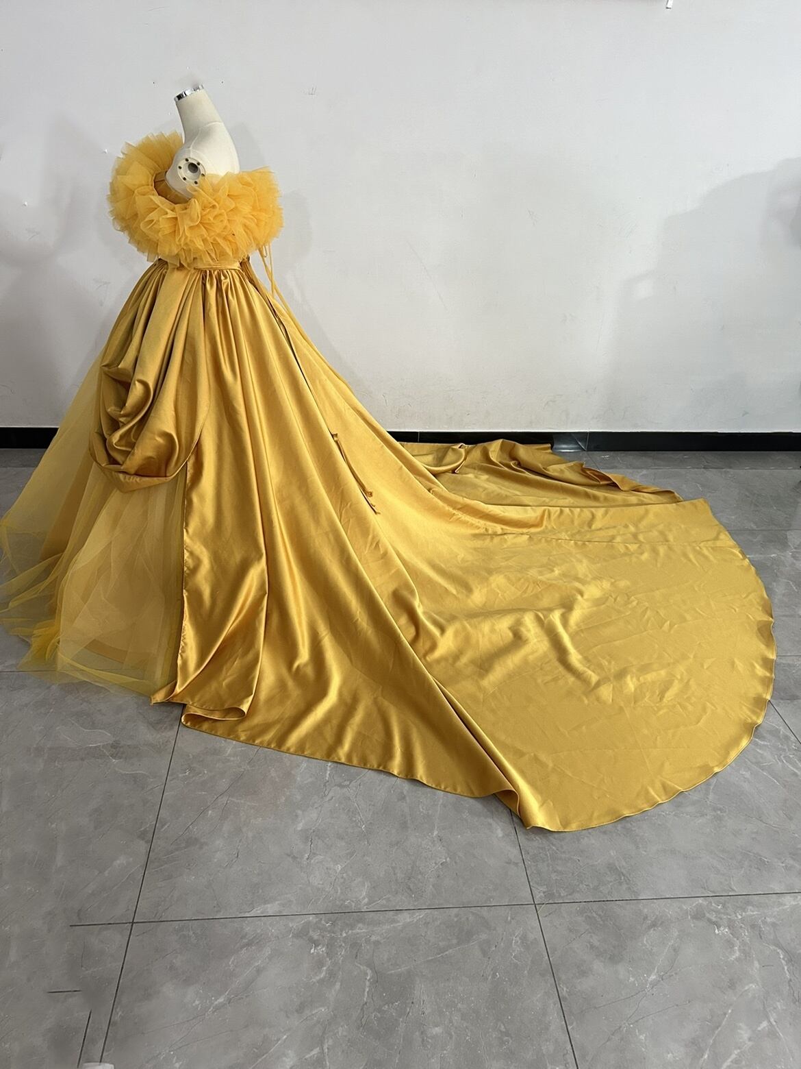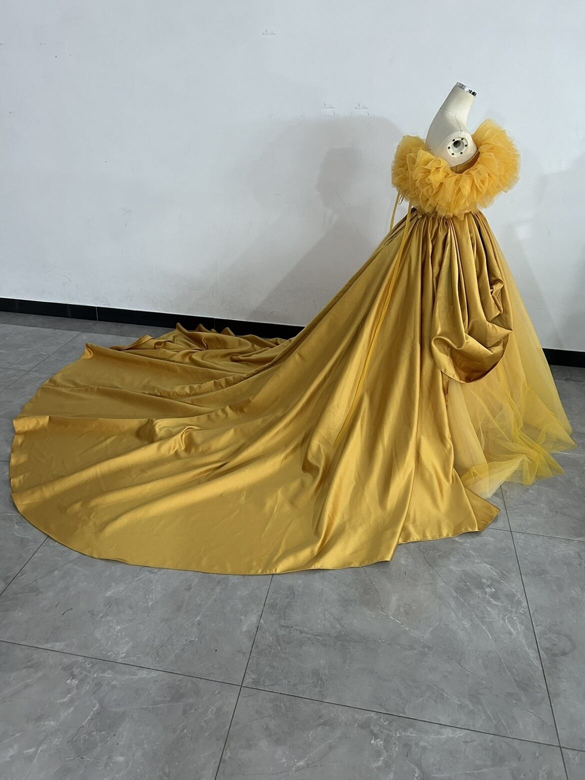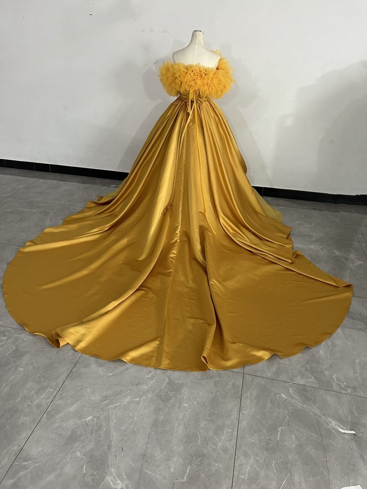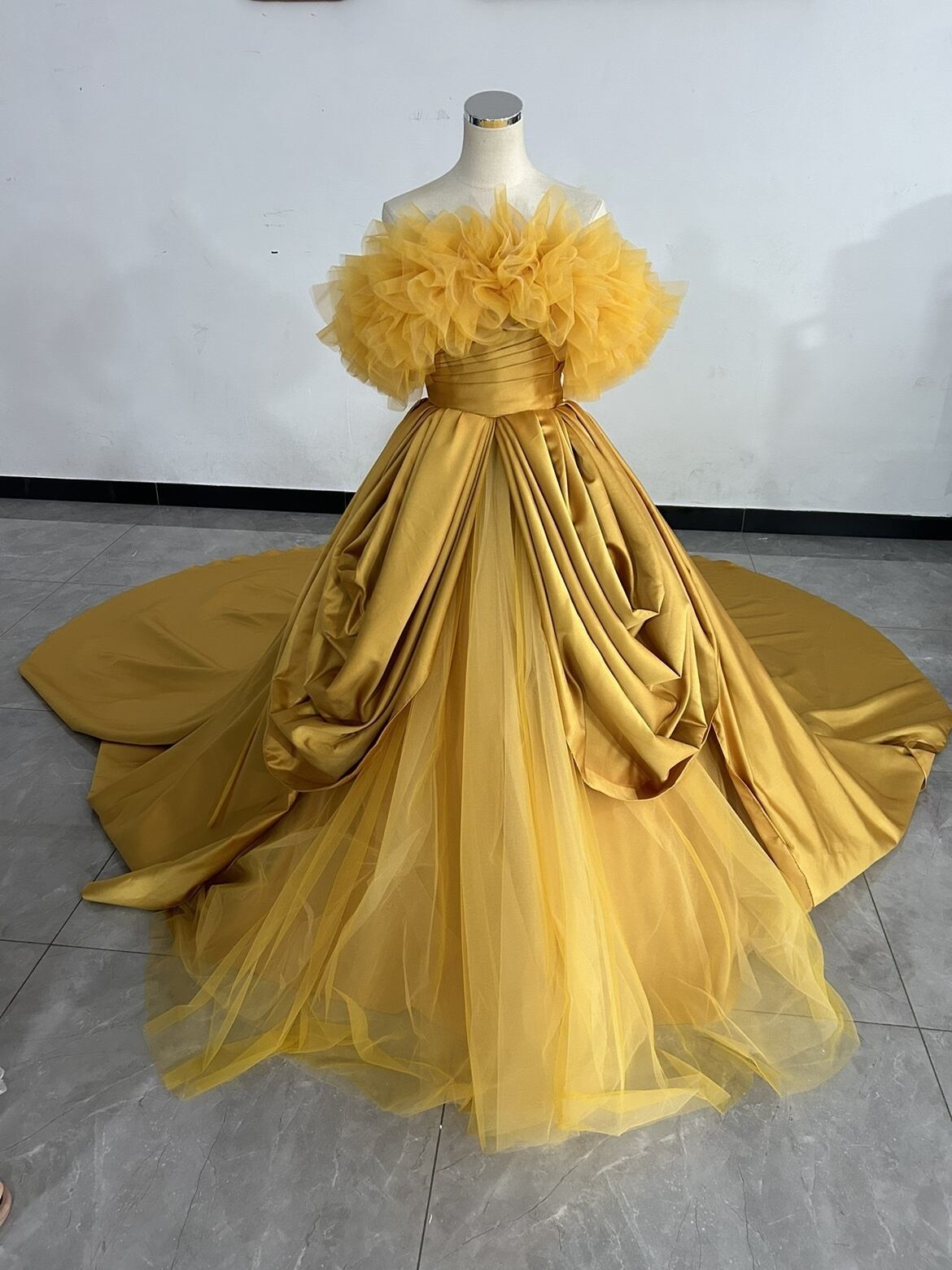 輝きな光彩を放つ イエロー取り外しオフショルダー カラードレス 華やかなトレーン プリンセスライン /前撮り/花嫁/結婚式/披露宴