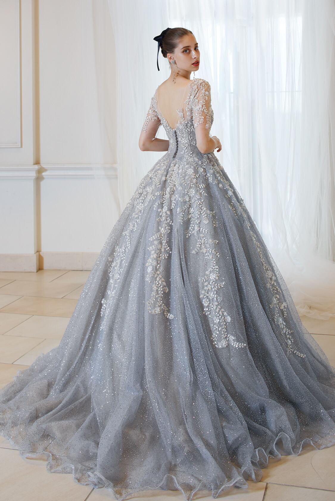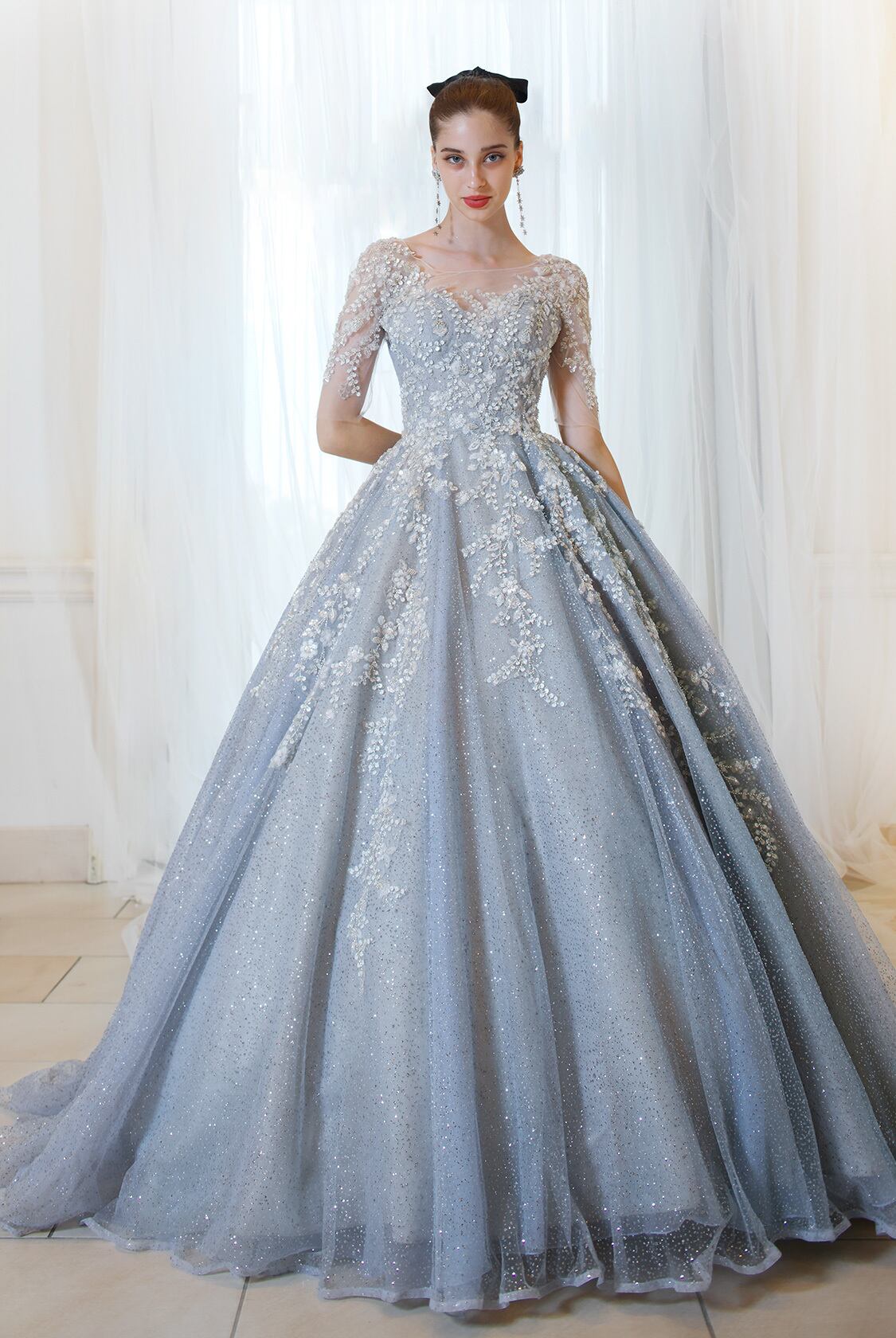 高品質!送料無料!カラードレス ブルーグレー Vネック 短袖 3D立体レース刺繍 キラキラチュール 上品レース 花柄のモチーフ刺繍が美しく かわいい エレガント 優雅 ハンドメイド トレーン オーダードレス プリンセスライン 花嫁 豪華 結婚式/前撮り