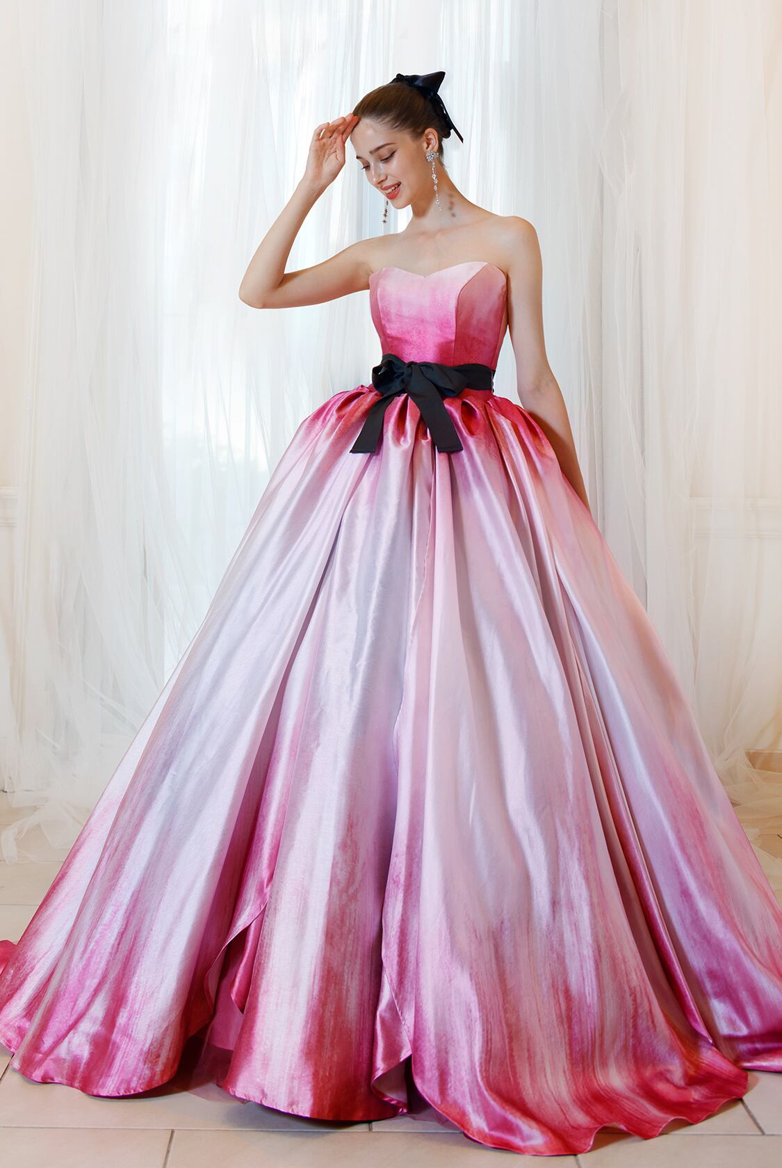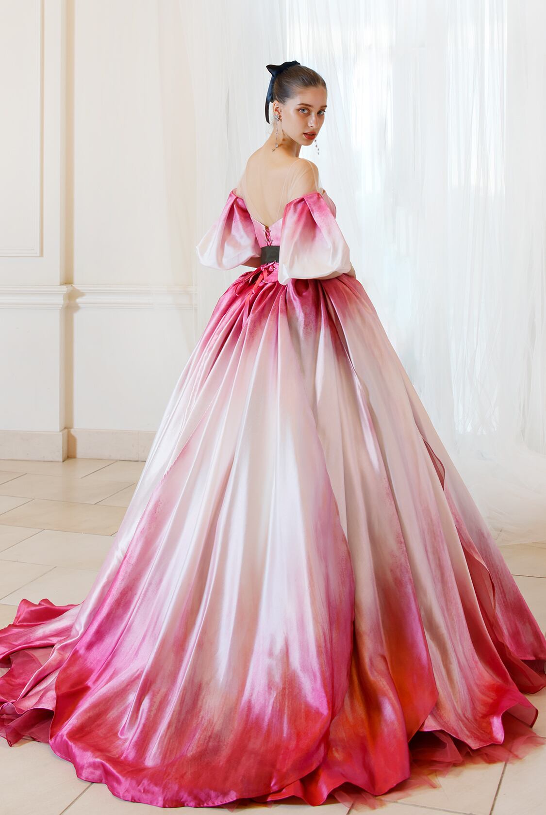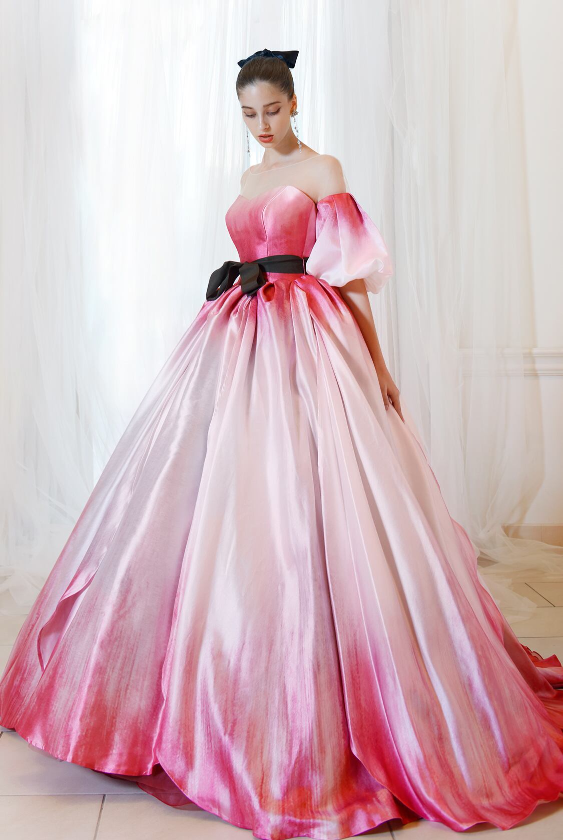 高品質!送料無料!カラードレス ピンク グラデーション 2WAY かわいい エレガント ハンドメイド ベルト パフスリーブ トレーン オーダードレス 花びらスカート 花嫁 豪華 結婚式/前撮り