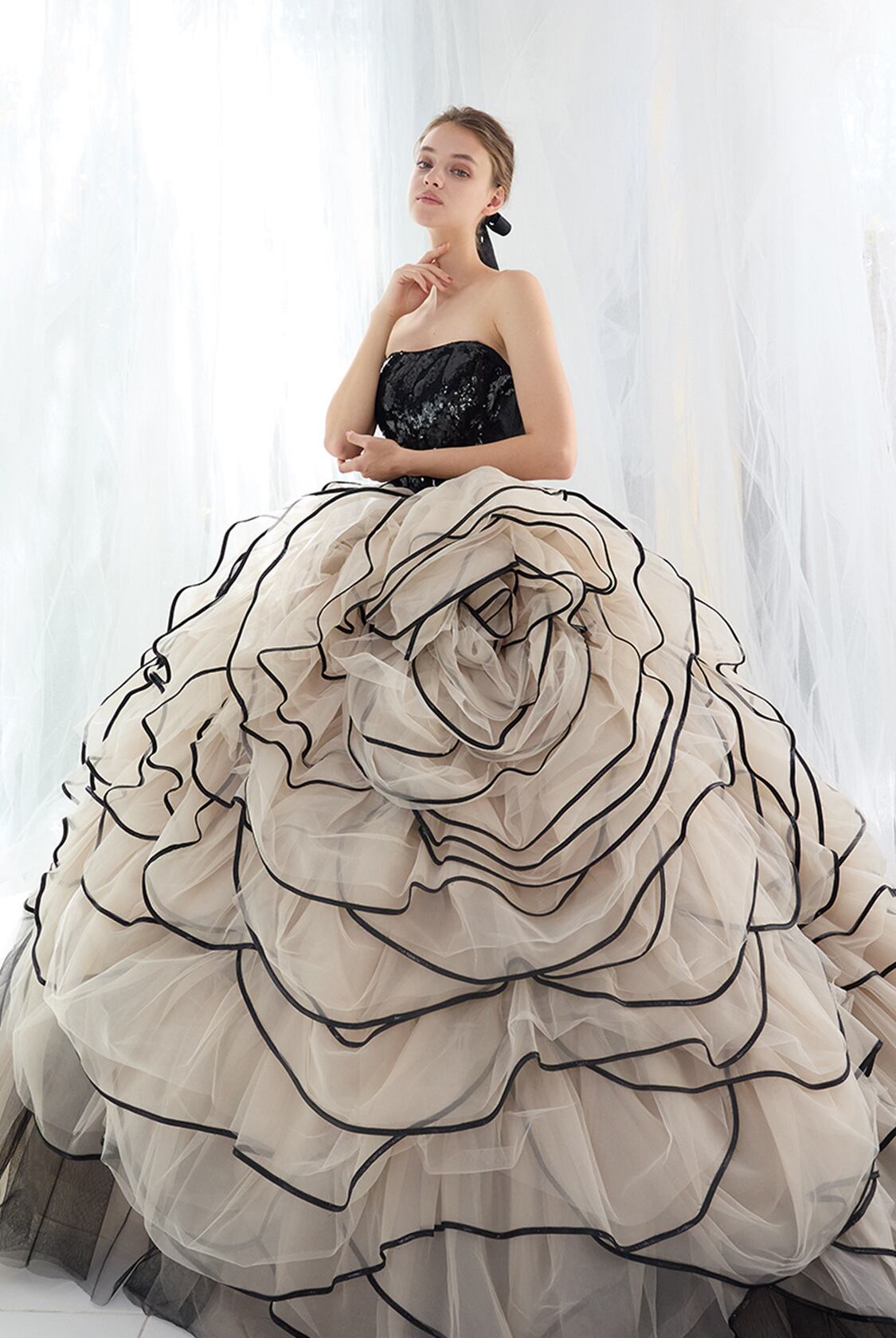 豪華!送料無料!カラードレス ブラック/黒 花型装飾 ベアトップ パイピング ソフトチュール かわいい エレガント オーバースカート ハンドメイド トレーン オーダードレス グラデーション パーティードレス 花嫁 結婚式/前撮り