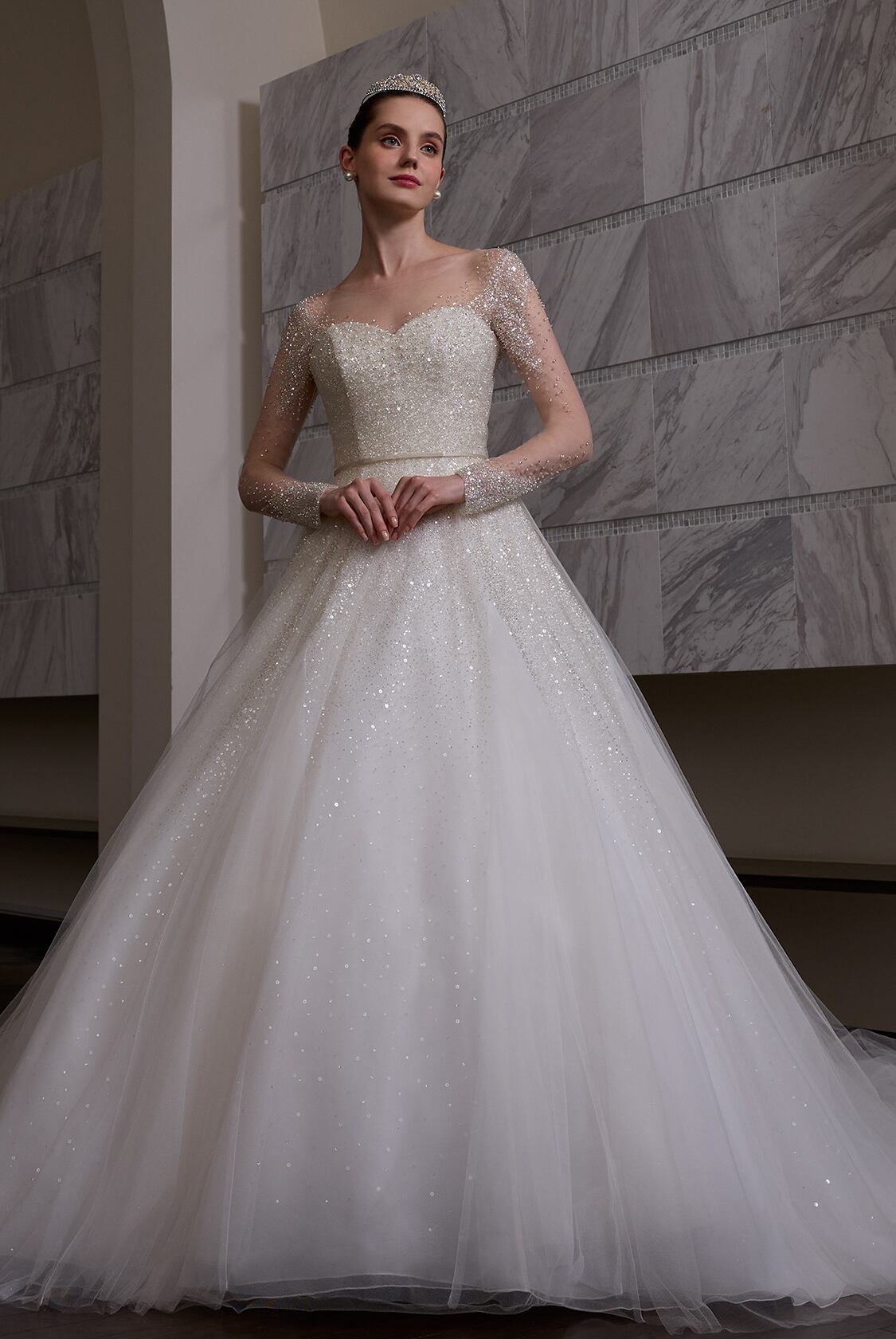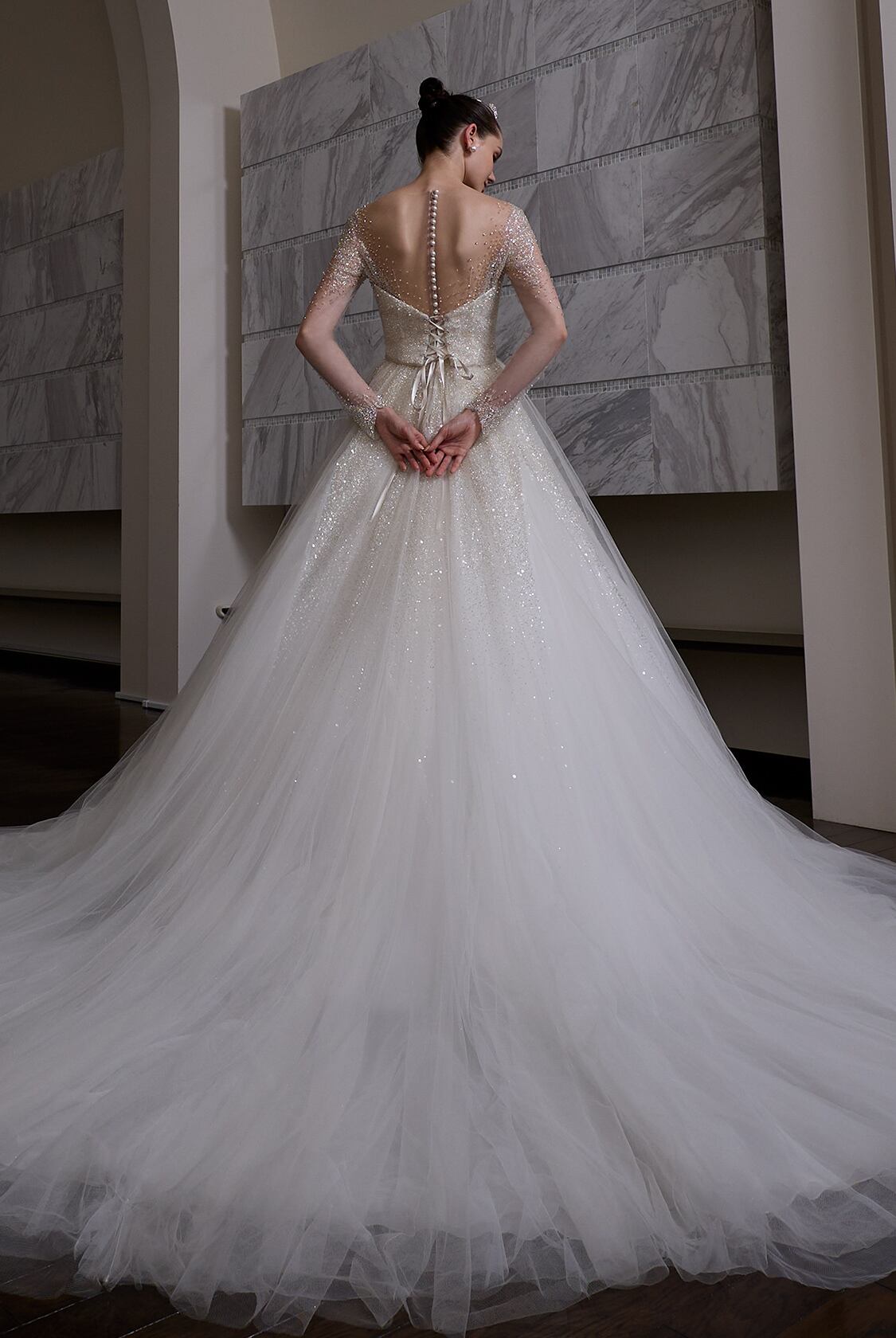 高品質!送料無料!ウエディングドレス キラキラチュール 長袖 ベアトップ キラキラシースルーボレロ ソフトチュール スパンコール トレーン オーダードレス ハンドメイド 花嫁/挙式/前撮り/結婚式/披露宴