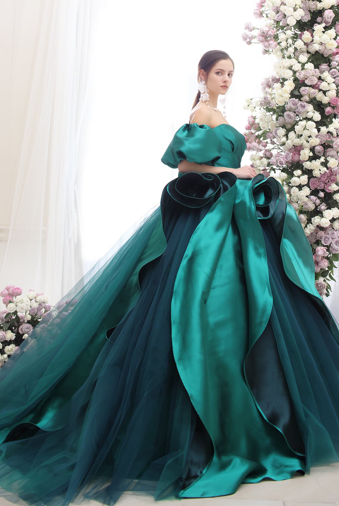 高品質!送料無料!カラードレス ベアトップ エメラルドグリーン パフスリーブ ソフトチュール かわいい エレガント 高級サテン ハンドメイド トレーン オーダードレス プリンセスライン 花嫁 豪華 結婚式/前撮り