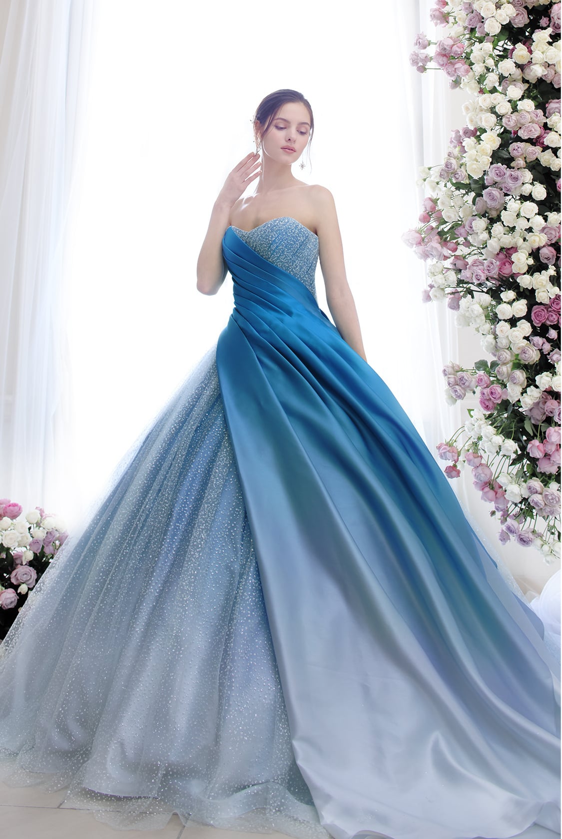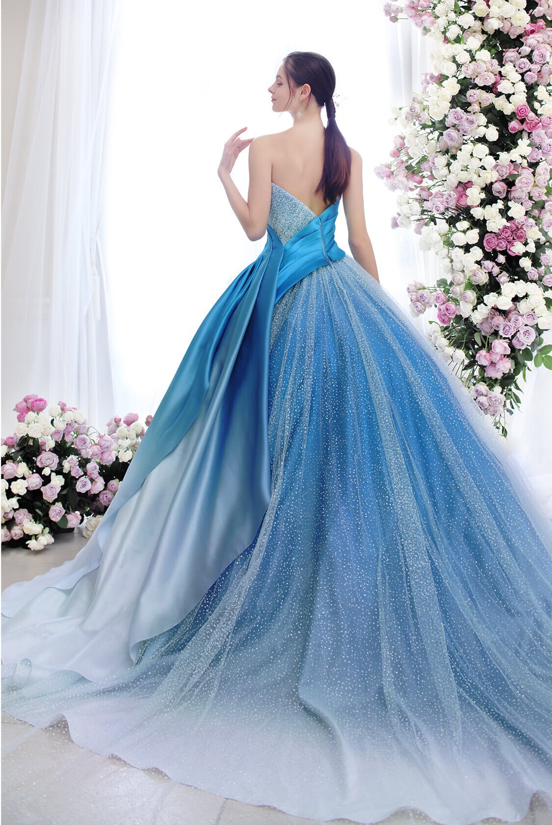 高品質!送料無料!カラードレス ベアトップ ブルー/青 グラデーション キラキラグリッターチュール かわいい エレガント ハンドメイド トレーン オーダードレス 花嫁 豪華 結婚式/前撮り