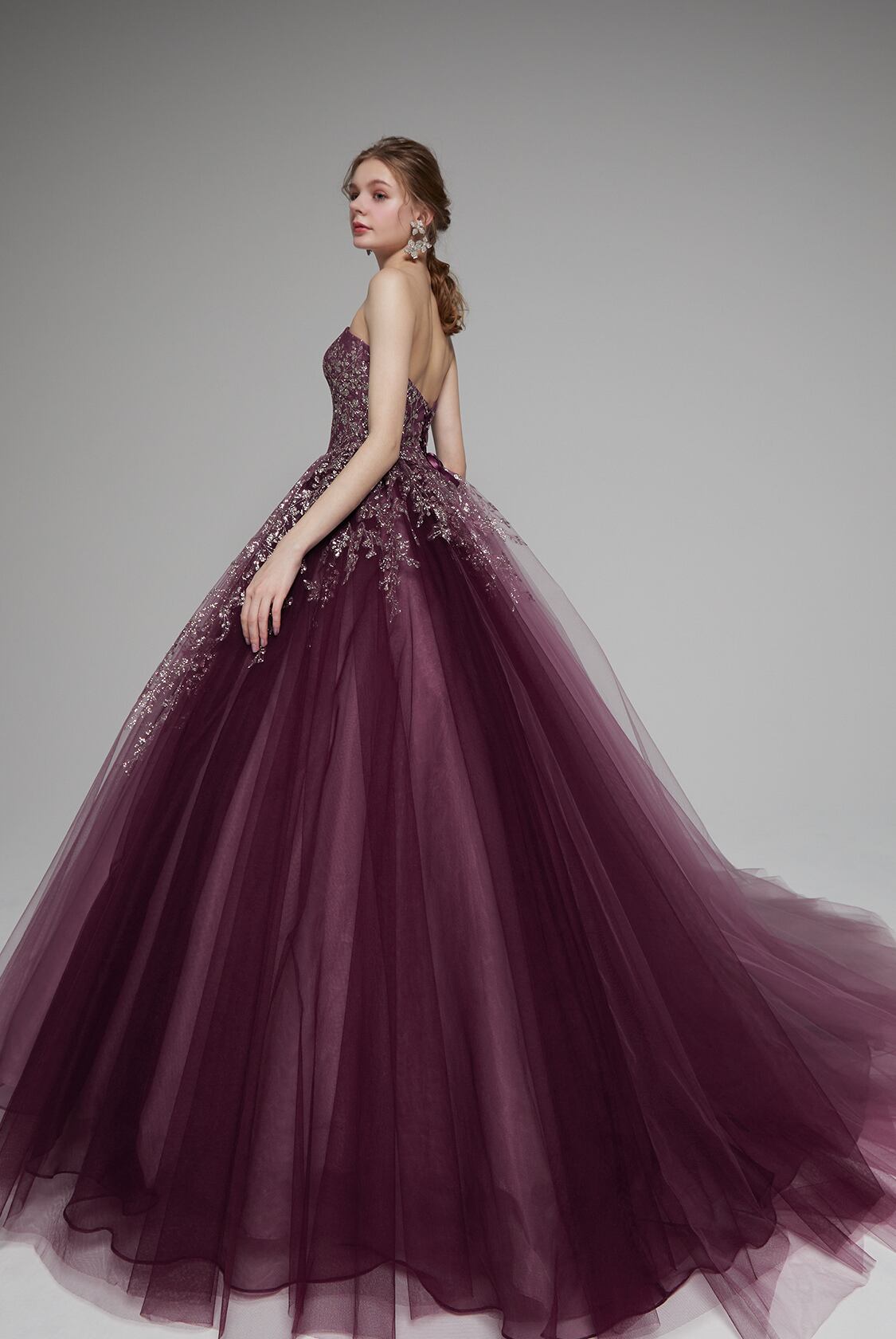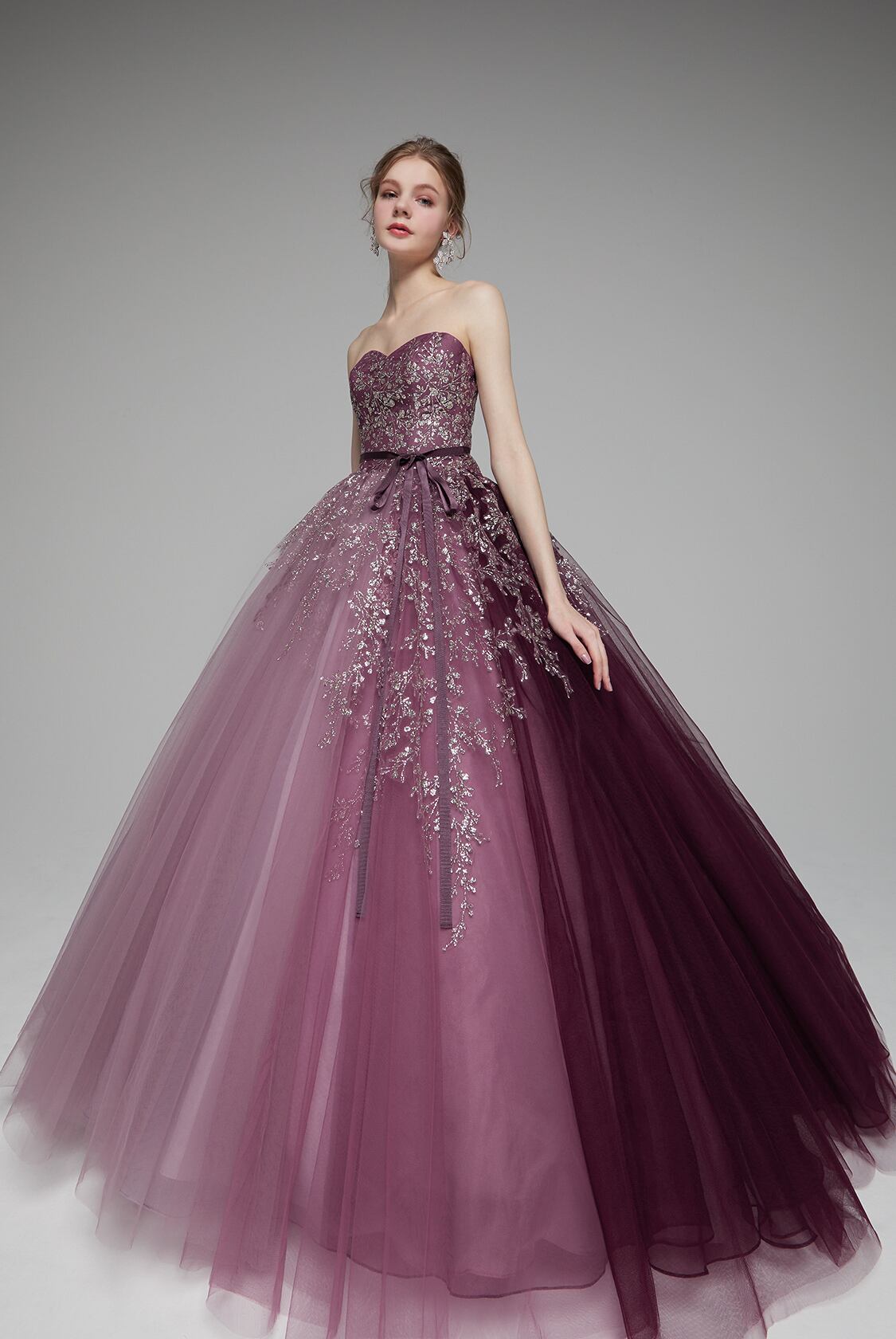 高品質!送料無料!カラードレス ベアトップ パープル/紫 グラデーション 花モチーフ ソフトチュール かわいい エレガント ハンドメイド トレーン オーダードレス 花嫁 豪華 結婚式/前撮り