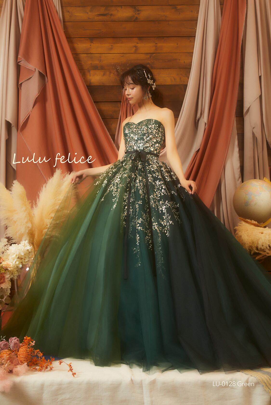 高品質!送料無料!カラードレス ベアトップ グリーン グラデーション 花モチーフ ソフトチュール かわいい エレガント ハンドメイド トレーン オーダードレス 花嫁 豪華 結婚式/前撮り | David1021k Dress(ダヴィドレス)