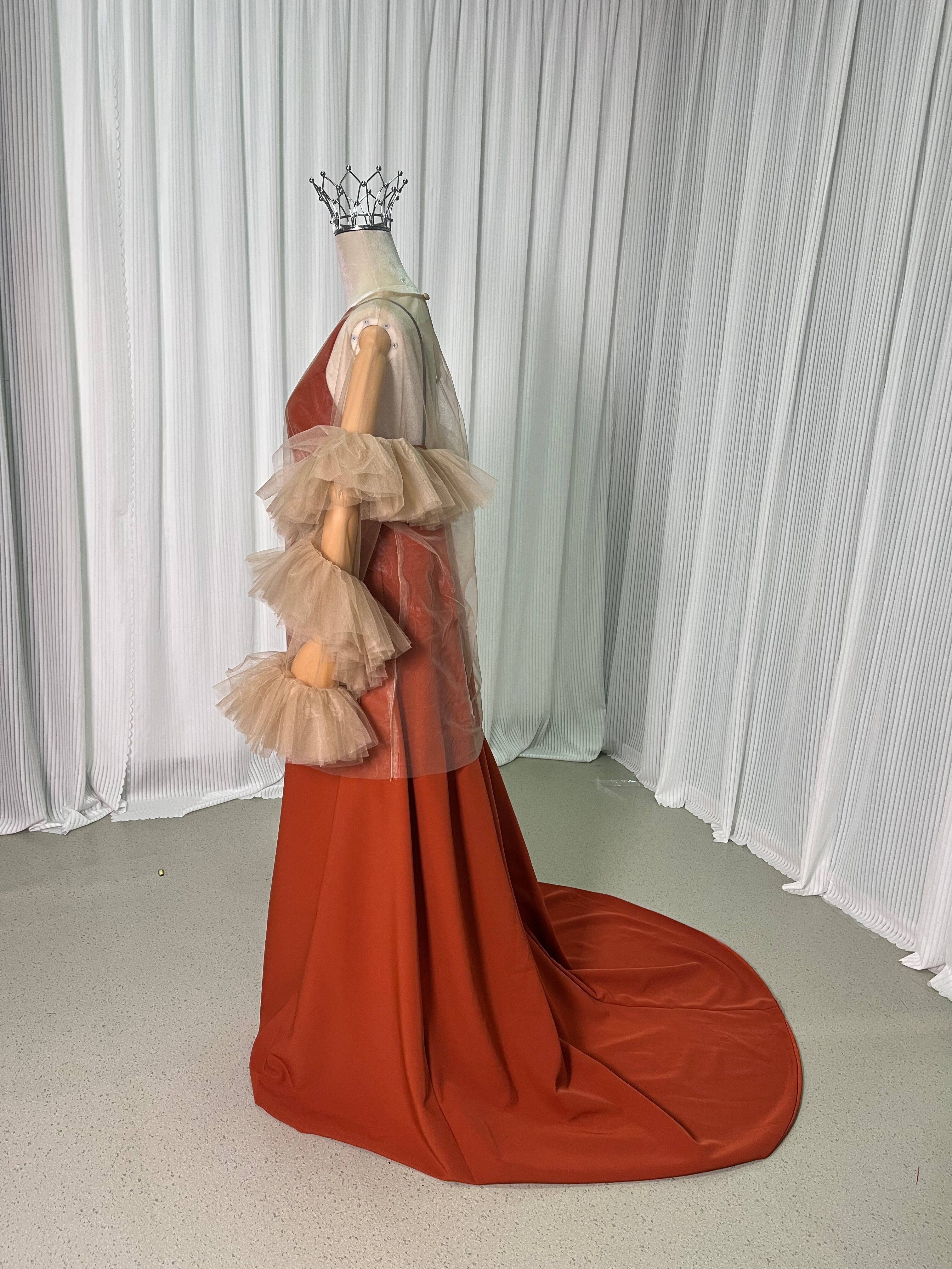抜群のおしゃれ見えパーティードレス ブラウン トレーン シアーな美しさ ポンチョ + テラコッタ色 ソフトチュール ポンチョ演奏会