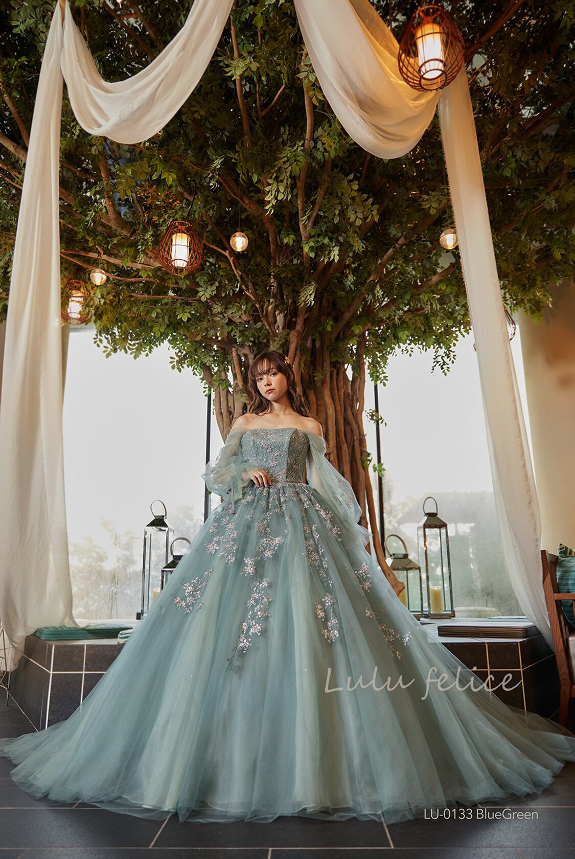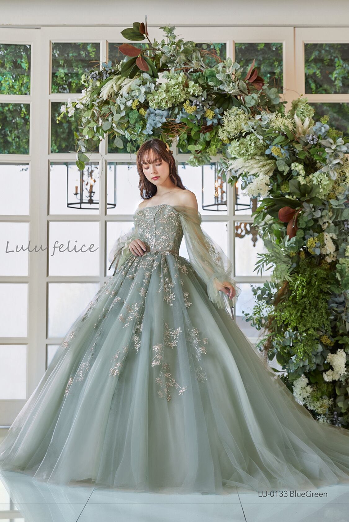 高品質!送料無料!カラードレス グリーン 取り外し袖 ソフトチュール かわいい エレガント レース刺繍 ハンドメイド トレーン オーダードレス プリンセスライン 花嫁 結婚式/前撮り