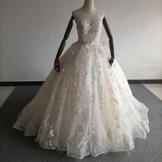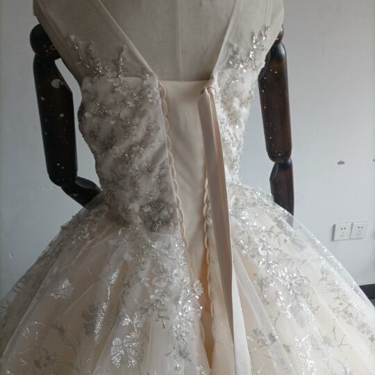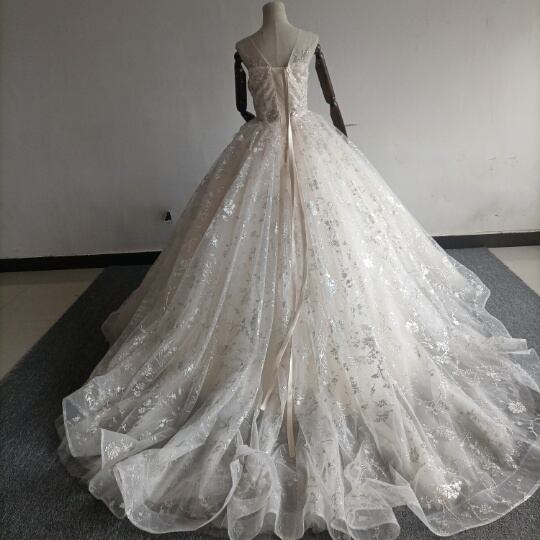 送料無料!豪華!ウエディングドレスキラキラスパンコール 薄シャンパン 贅沢な花総レースふわふわ袖 華やかなトレー/結婚式