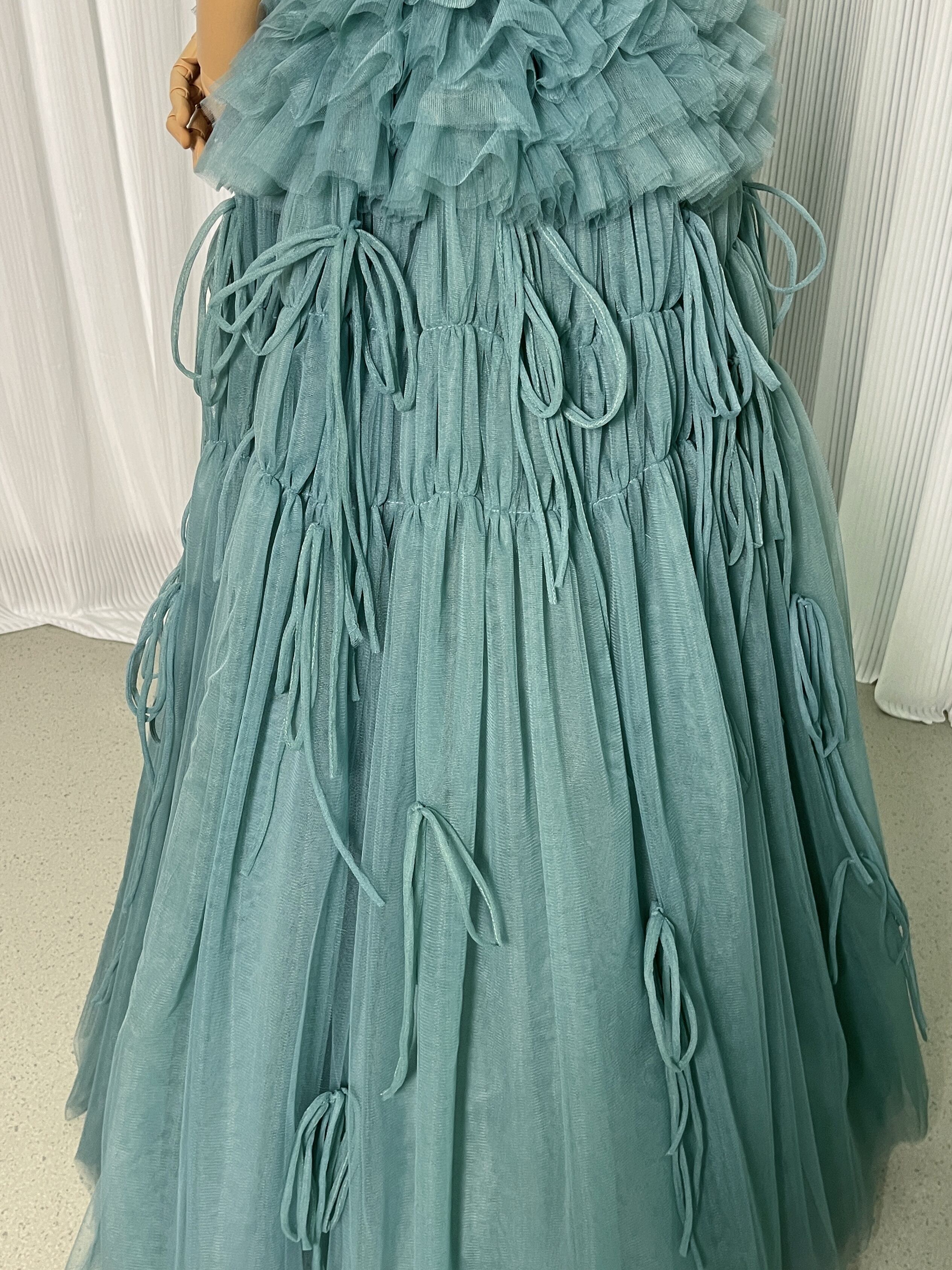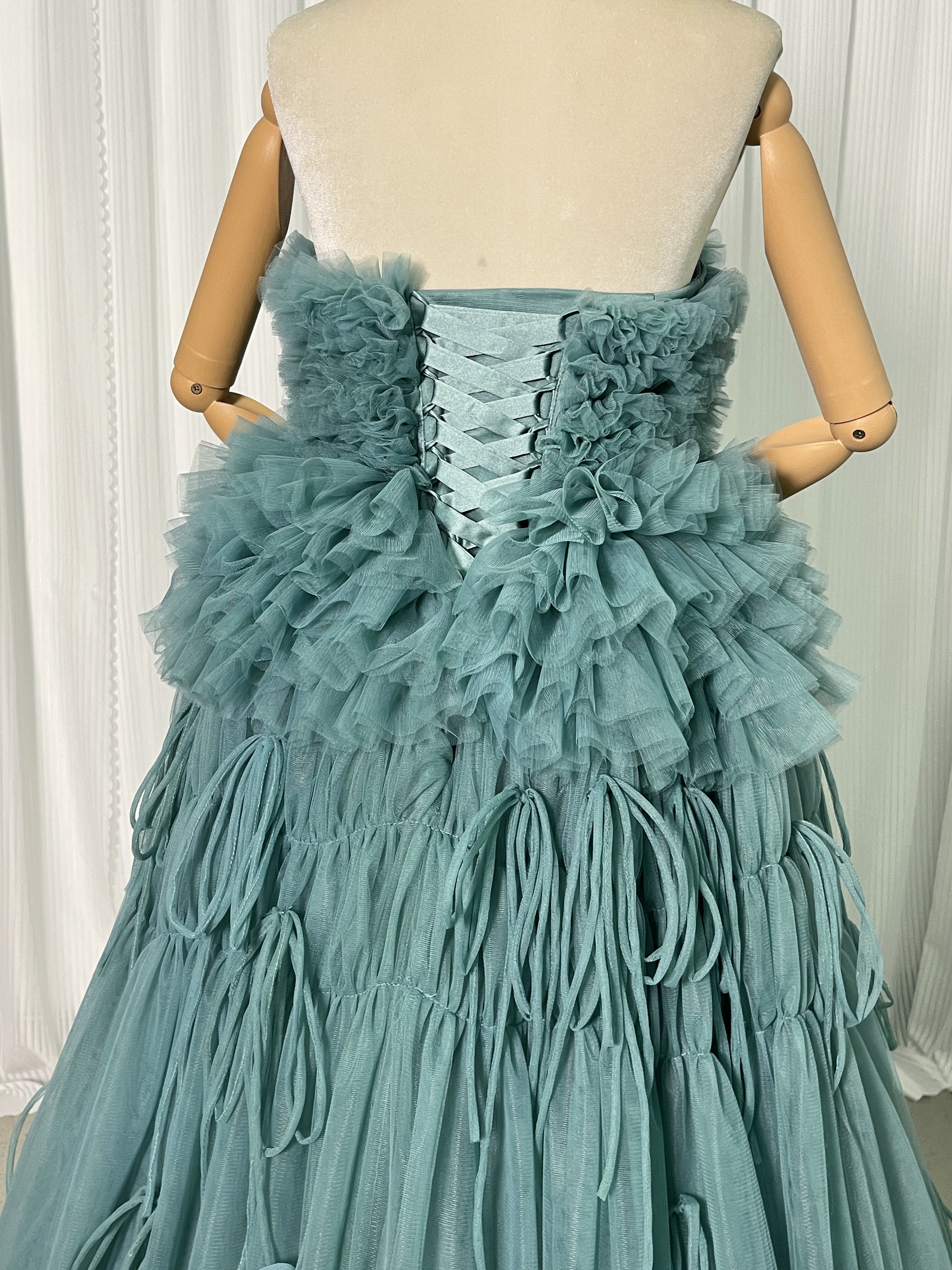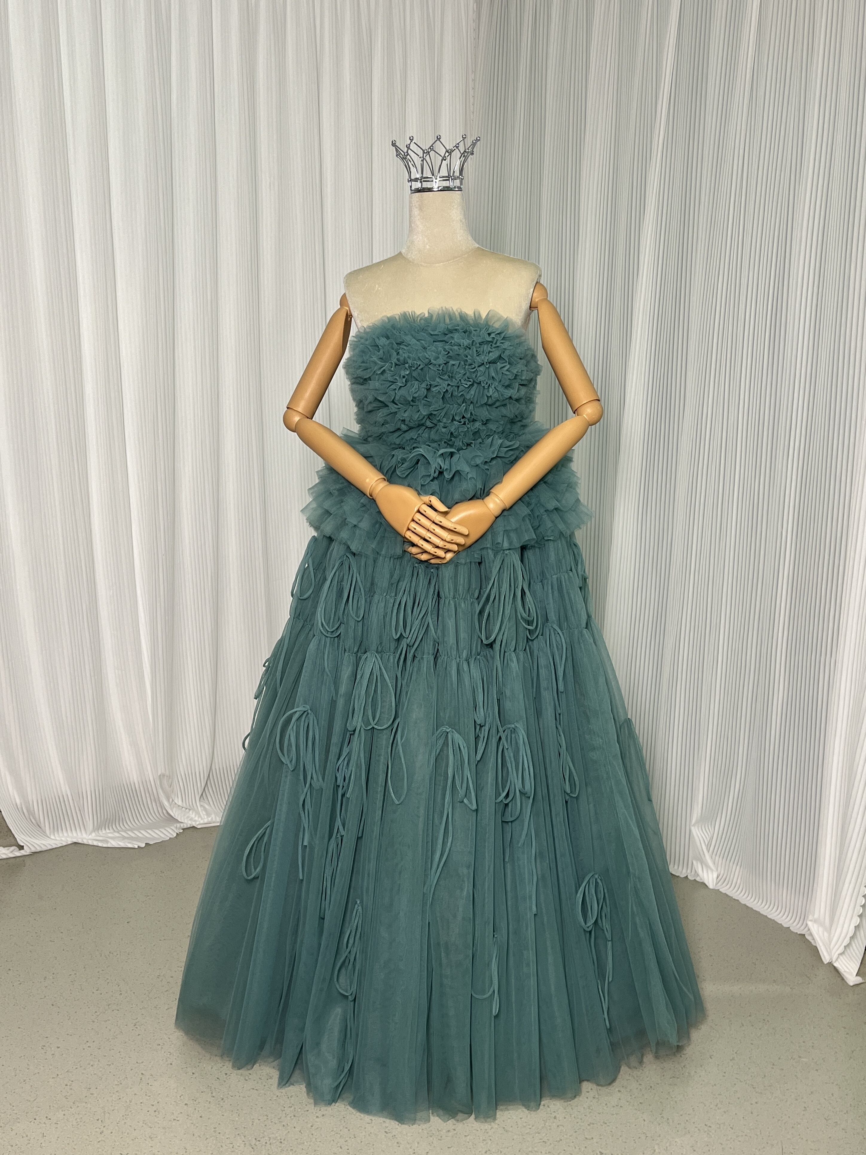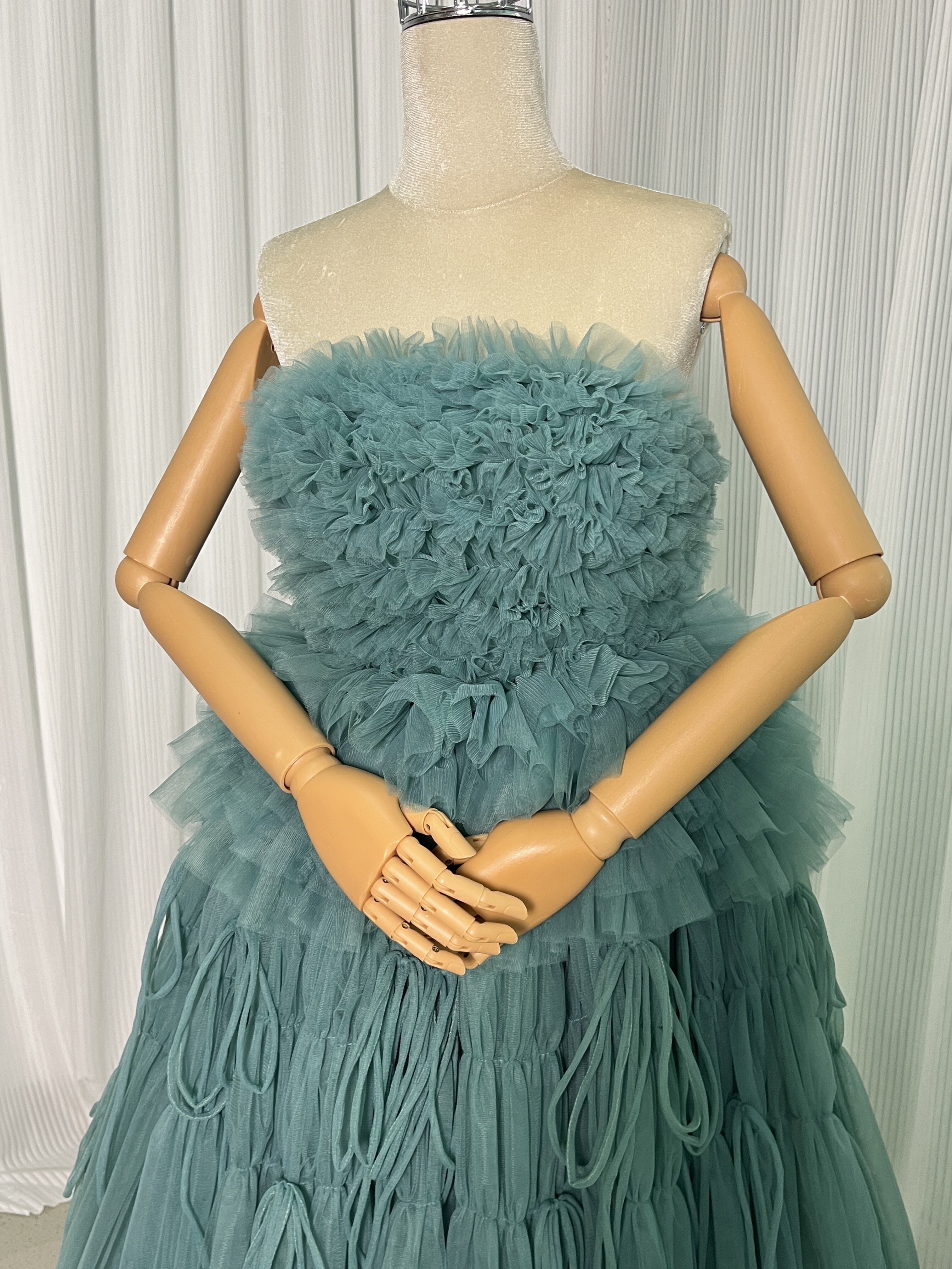 送料無料!グリーン ベアトップ カラードレス 柔らかく重ねたチュールスカート 結婚式/披露宴