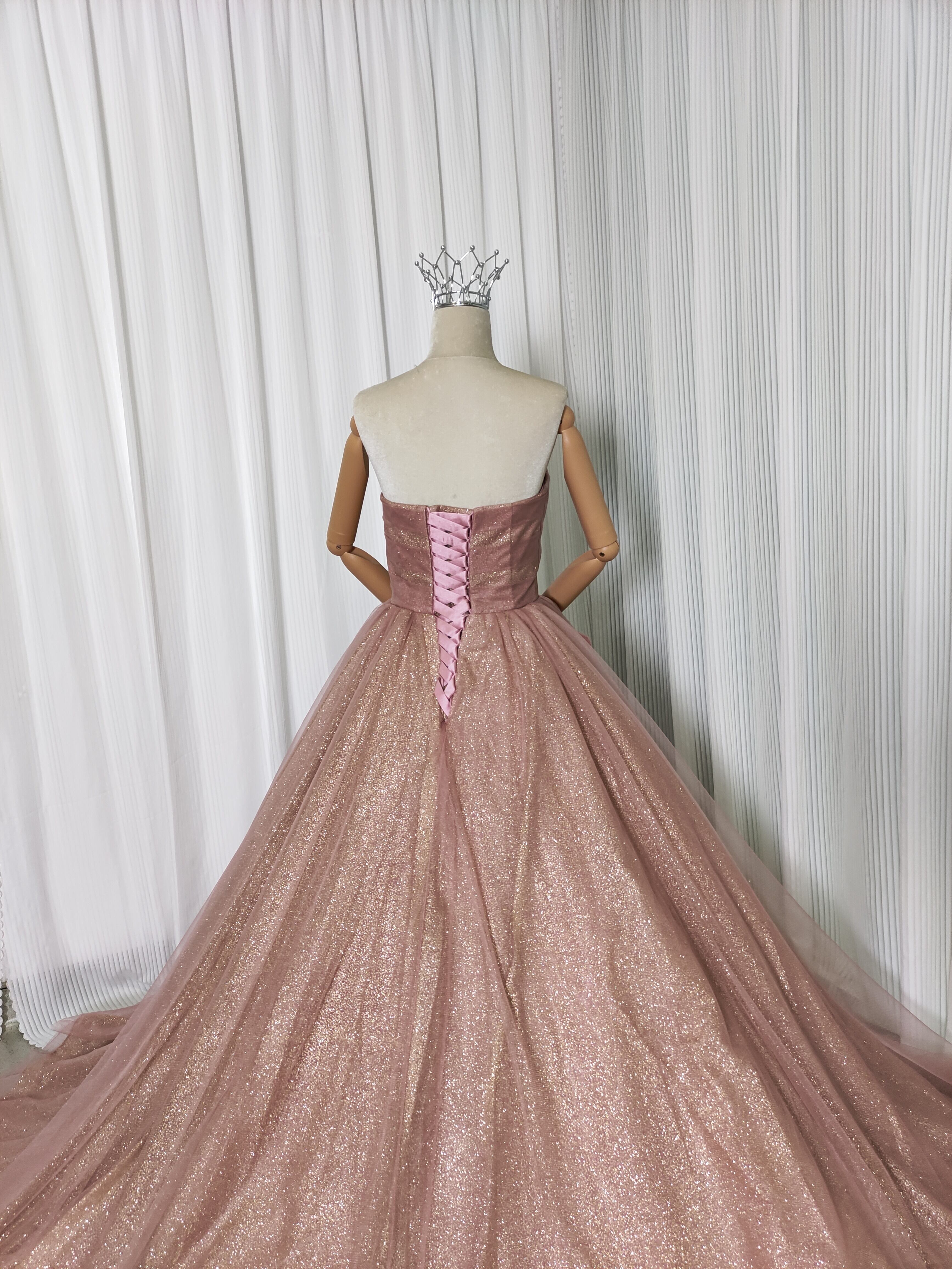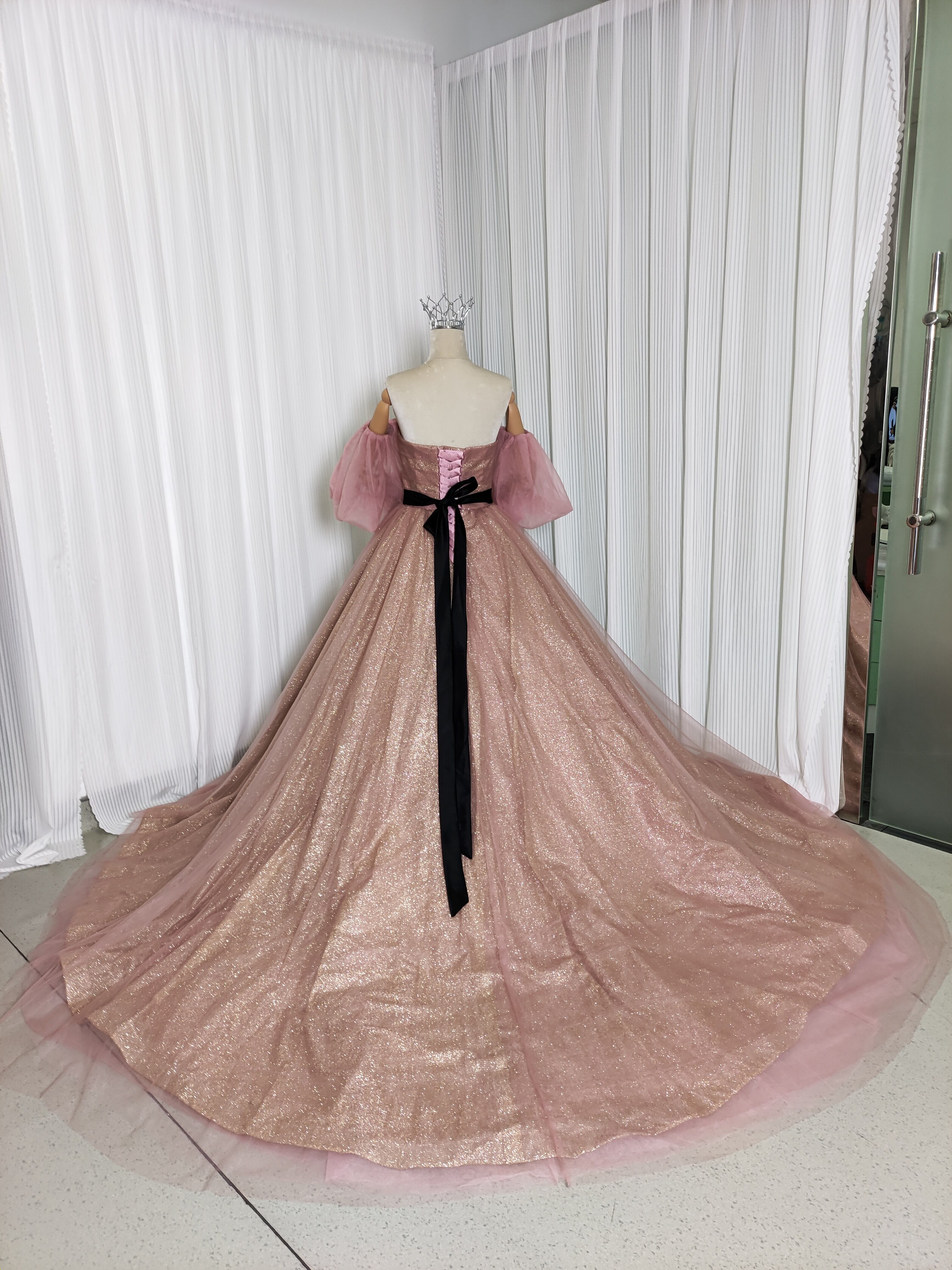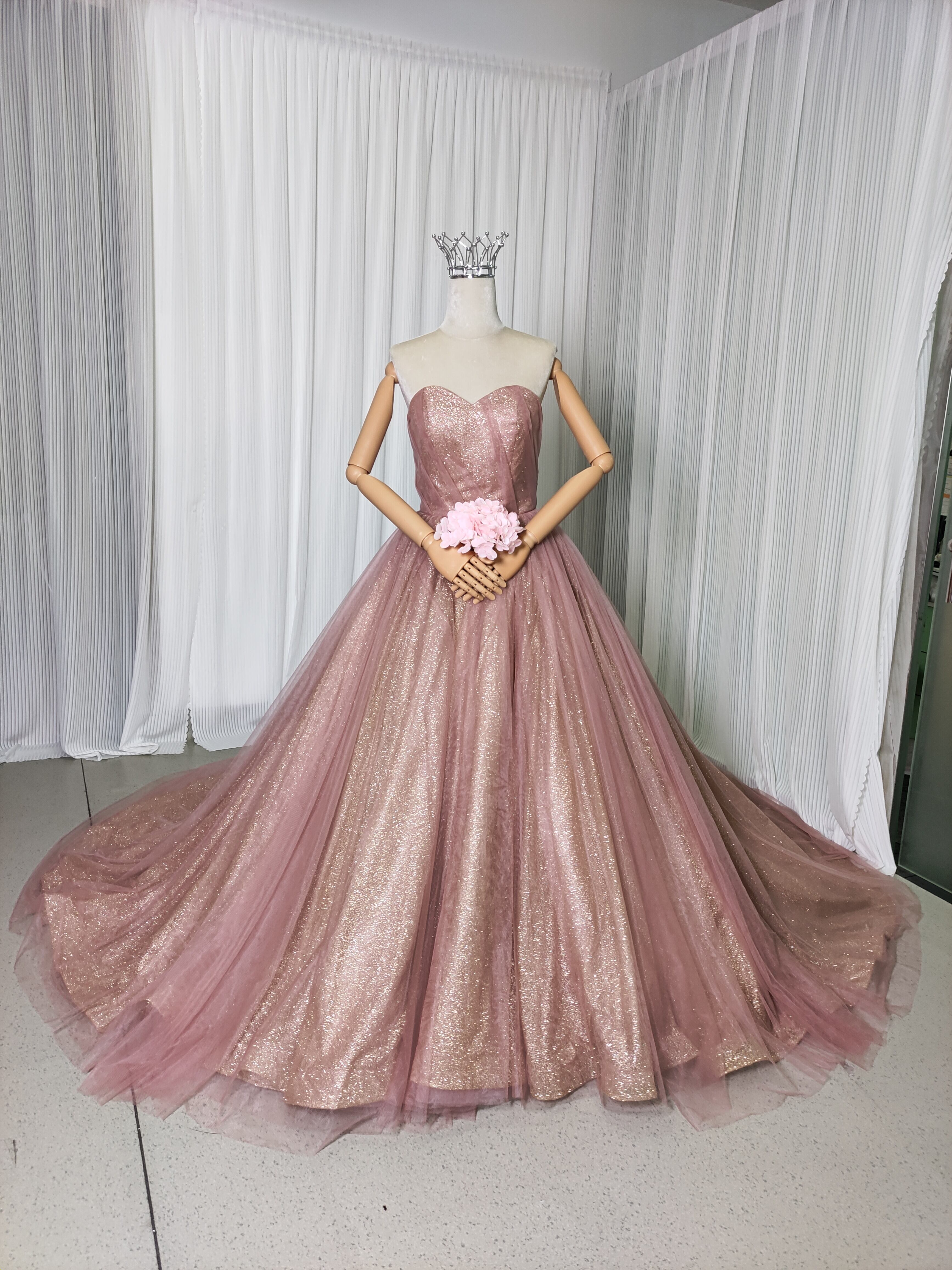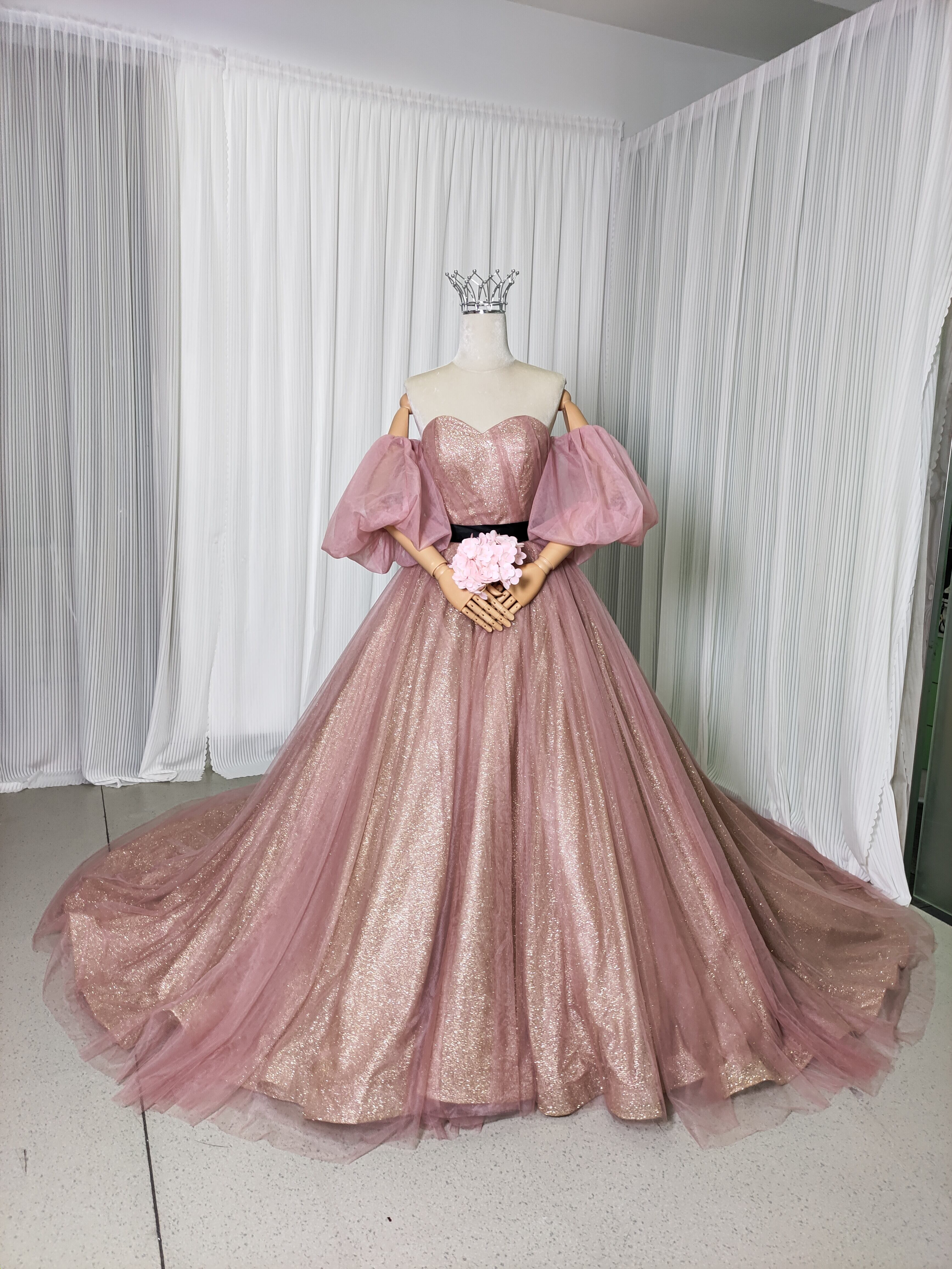 人気上昇!ピンク カラードレス キラキラチュール ソフトチュール 華やかなトレーン 結婚式/披露宴/前撮り
