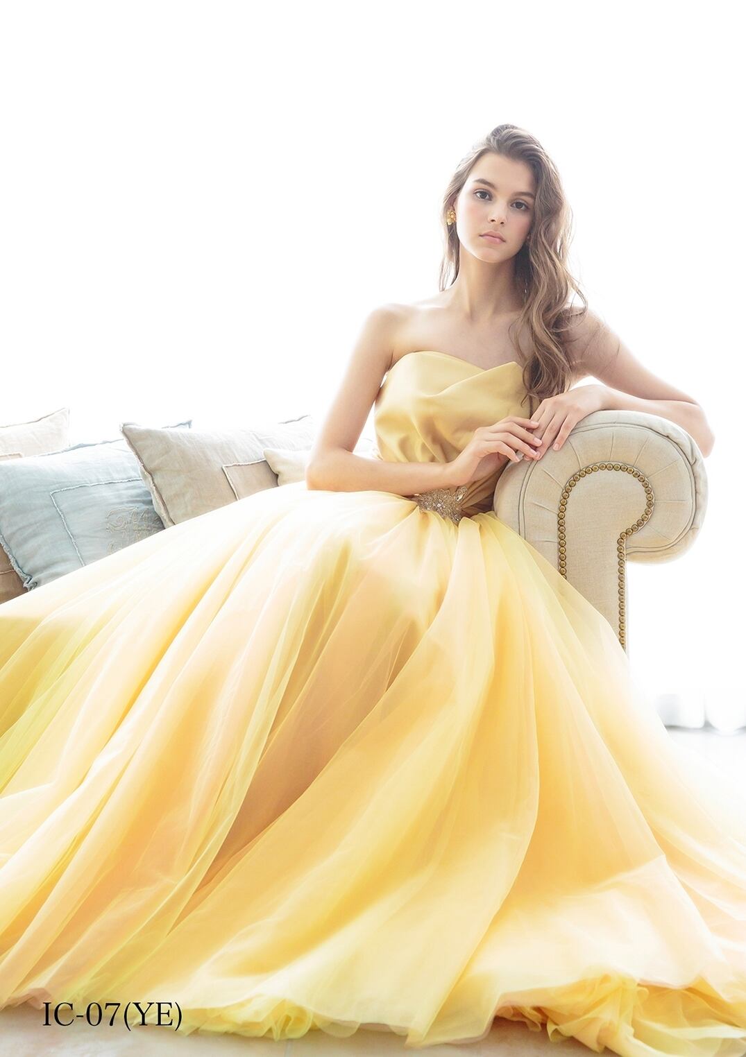 高品質!送料無料!カラードレス イエロー/黄色い ソフトチュール ベアトップ かわいい エレガント ハンドメイド トレーン オーダードレス ボリューミー 花嫁 結婚式/前撮り | David1021k Dress(ダヴィドレス)