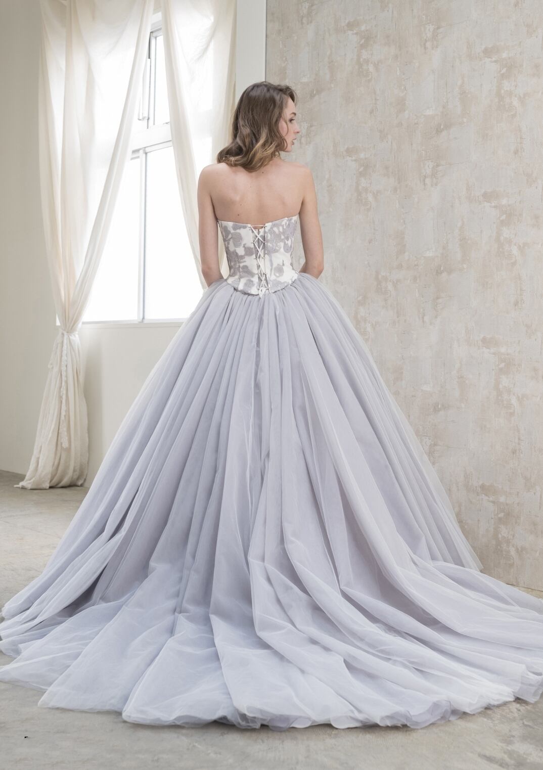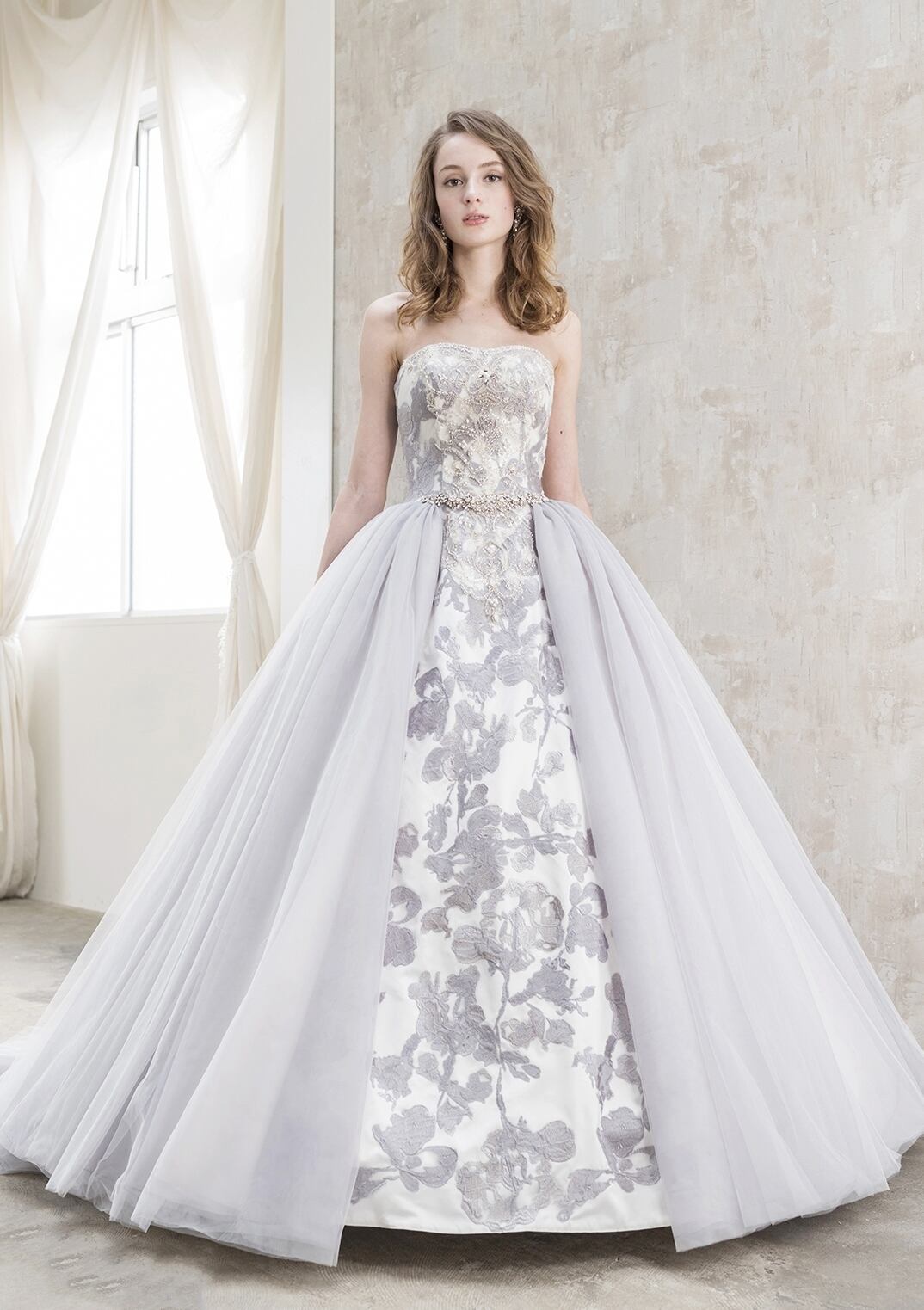 高品質!送料無料!カラードレス グレー ソフトチュール 花柄のモチーフ刺繍 エレガント ハンドメイド パーティードレス トレーン プリンセスライン オーダードレス 花嫁 結婚式/前撮り | David1021k Dress(ダヴィドレス)