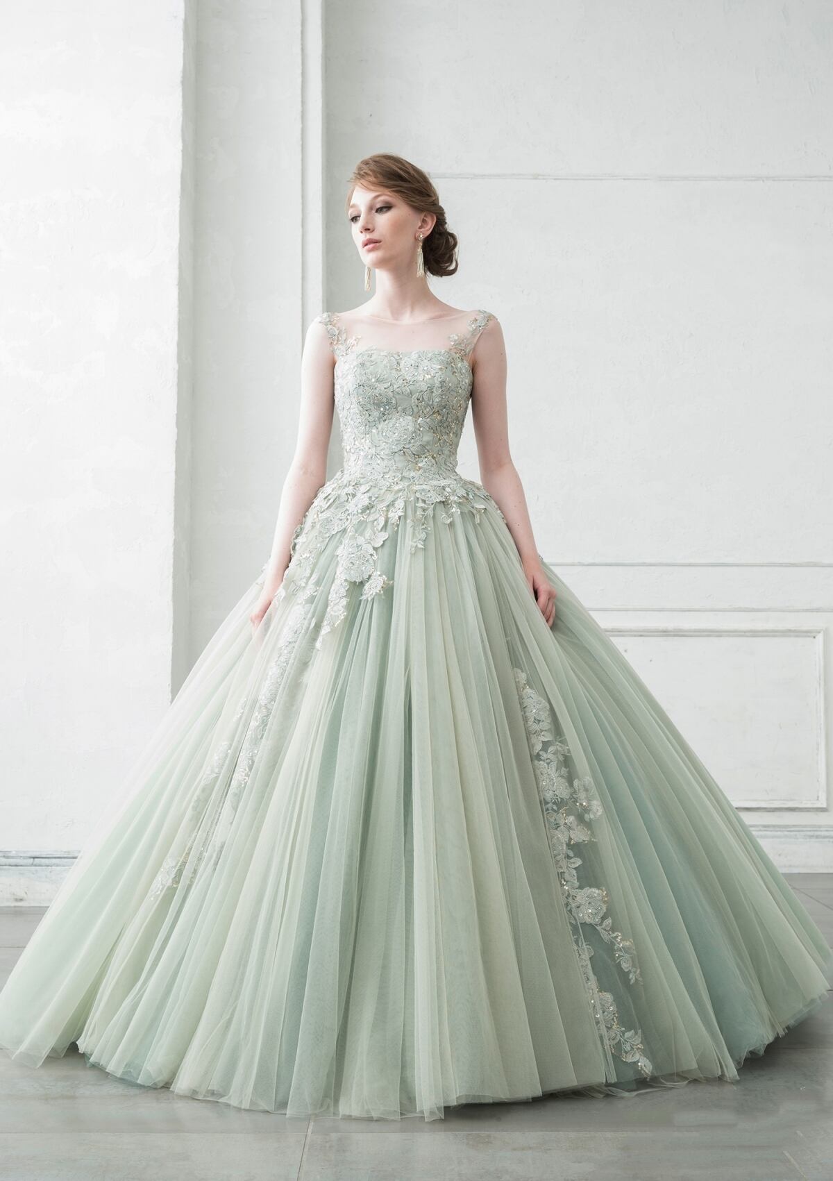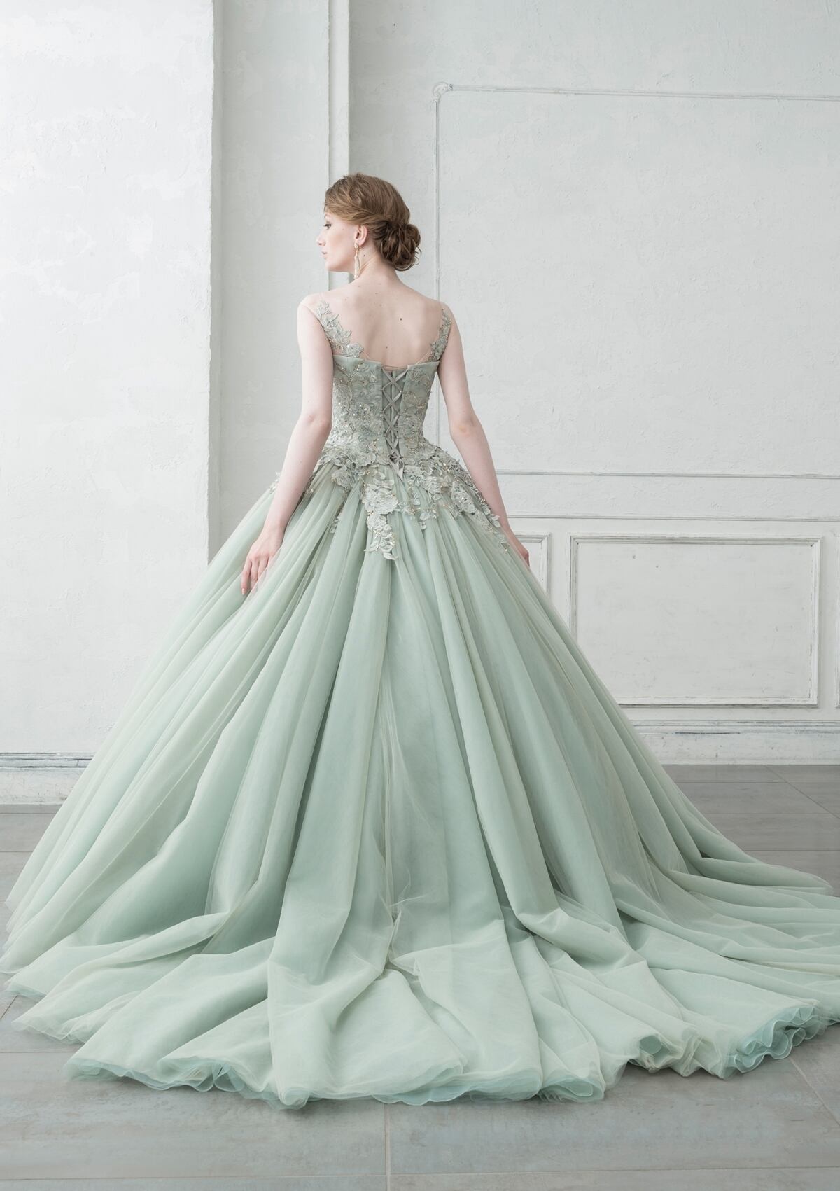 高品質!送料無料!カラードレス 爽やかで優しい薄グリーン ソフトチュール キャミソール 上品レース かわいい エレガント ハンドメイド トレーン オーダードレス 花嫁 結婚式/前撮り | David1021k Dress(ダヴィドレス)