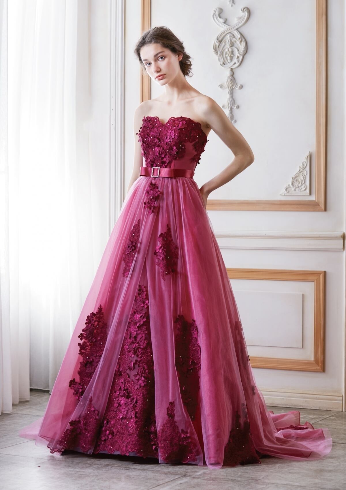 高品質!送料無料!カラードレス フューシャピンク モーブ 花モチーフ 付け袖 ソフトチュール かわいい エレガント ハンドメイド トレーン オーダードレス 花嫁 結婚式/前撮り | David1021k Dress(ダヴィドレス)