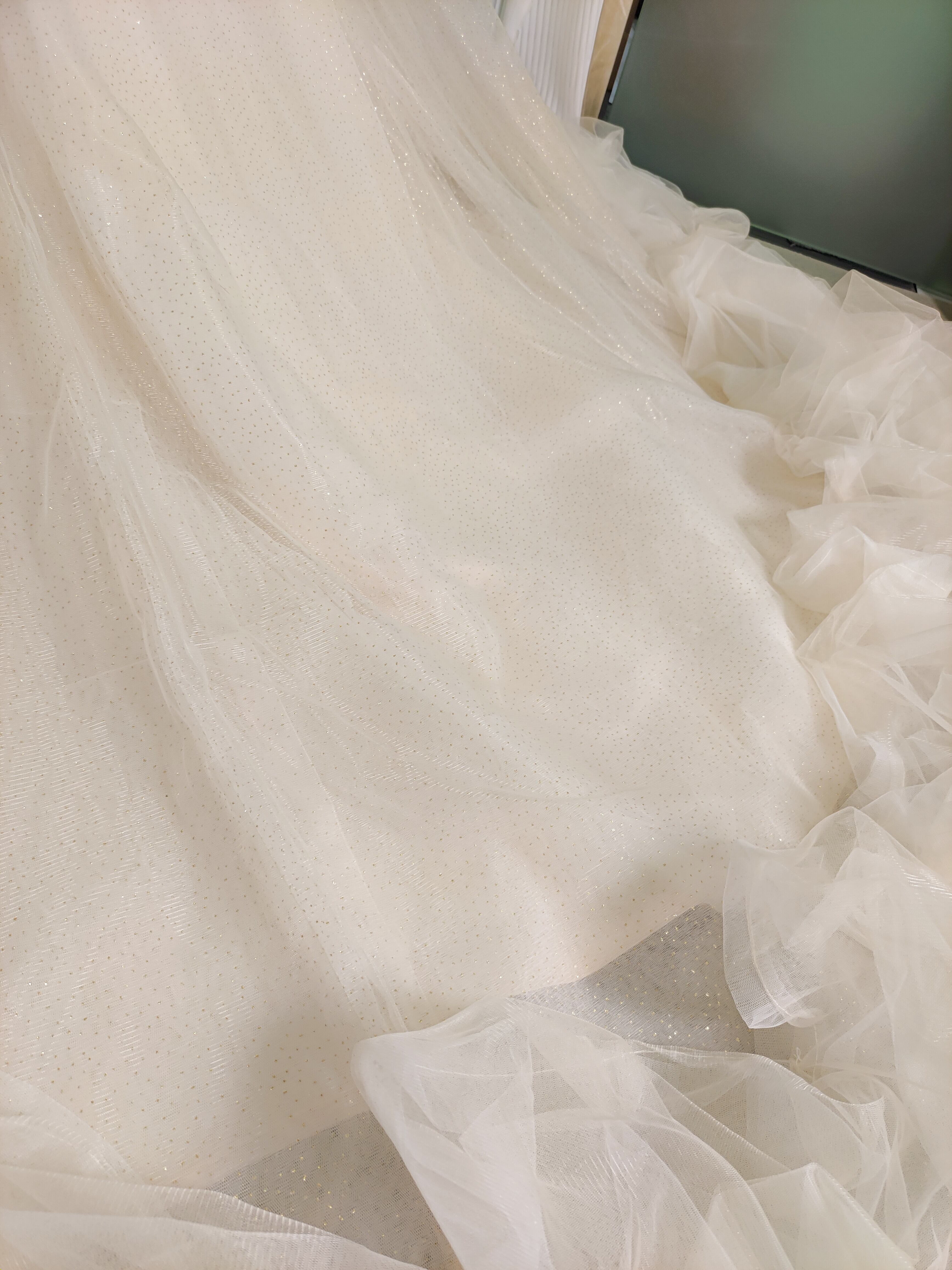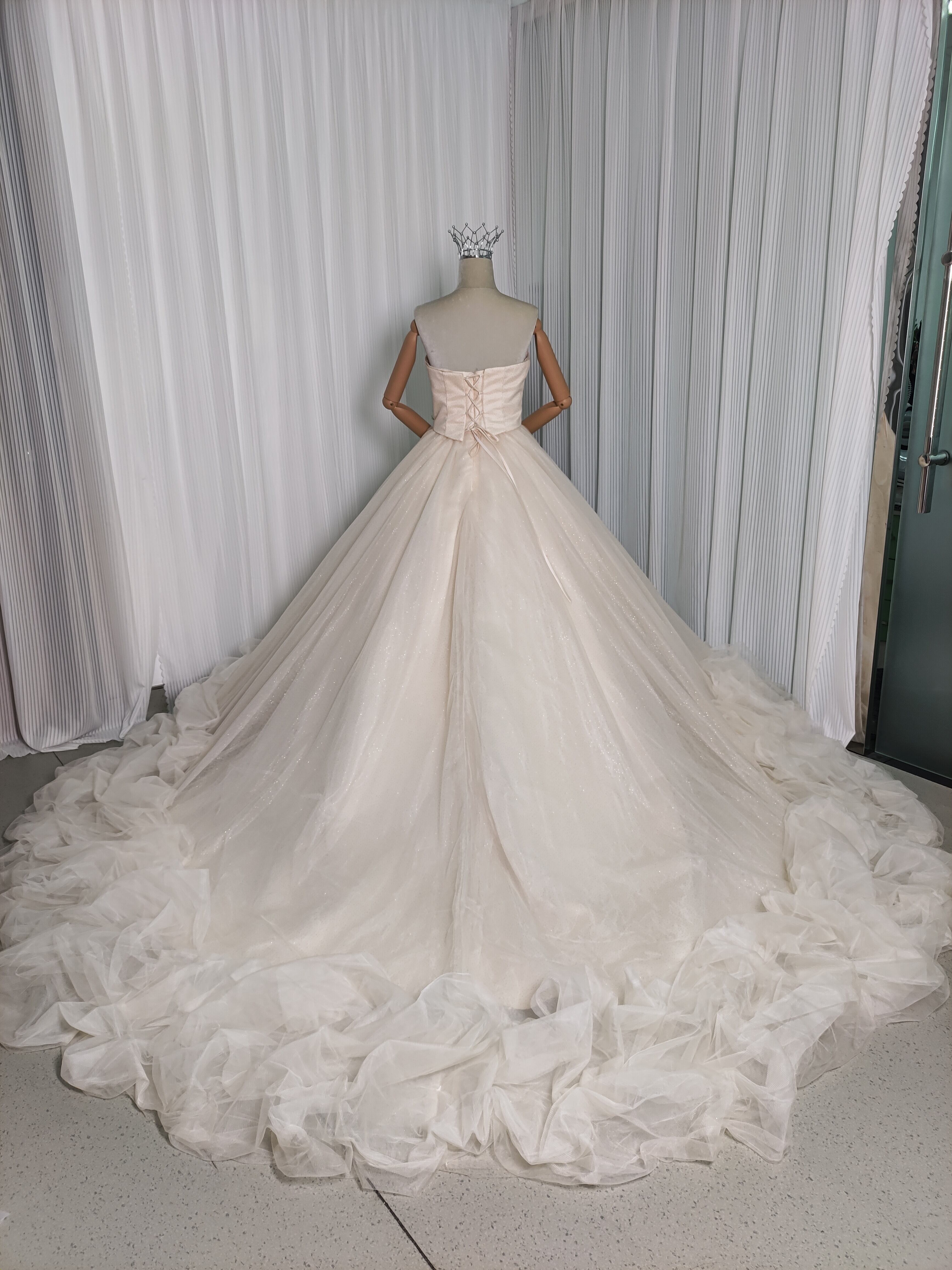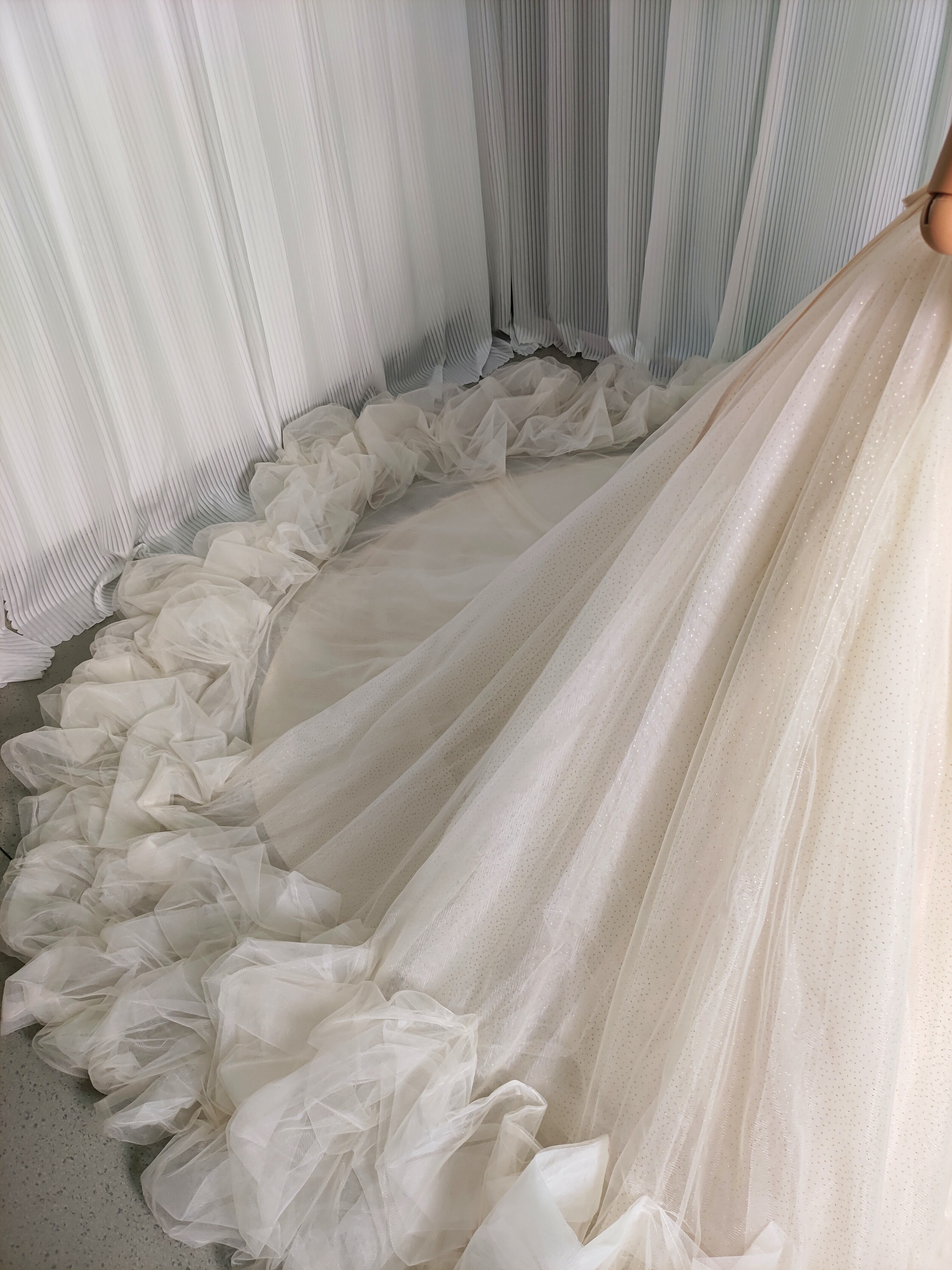 輝きな光彩を放つ パステルイエロー カラードレスキラキラチュール裾に繊細レースをあしらった華やかなトレーン プリンセス