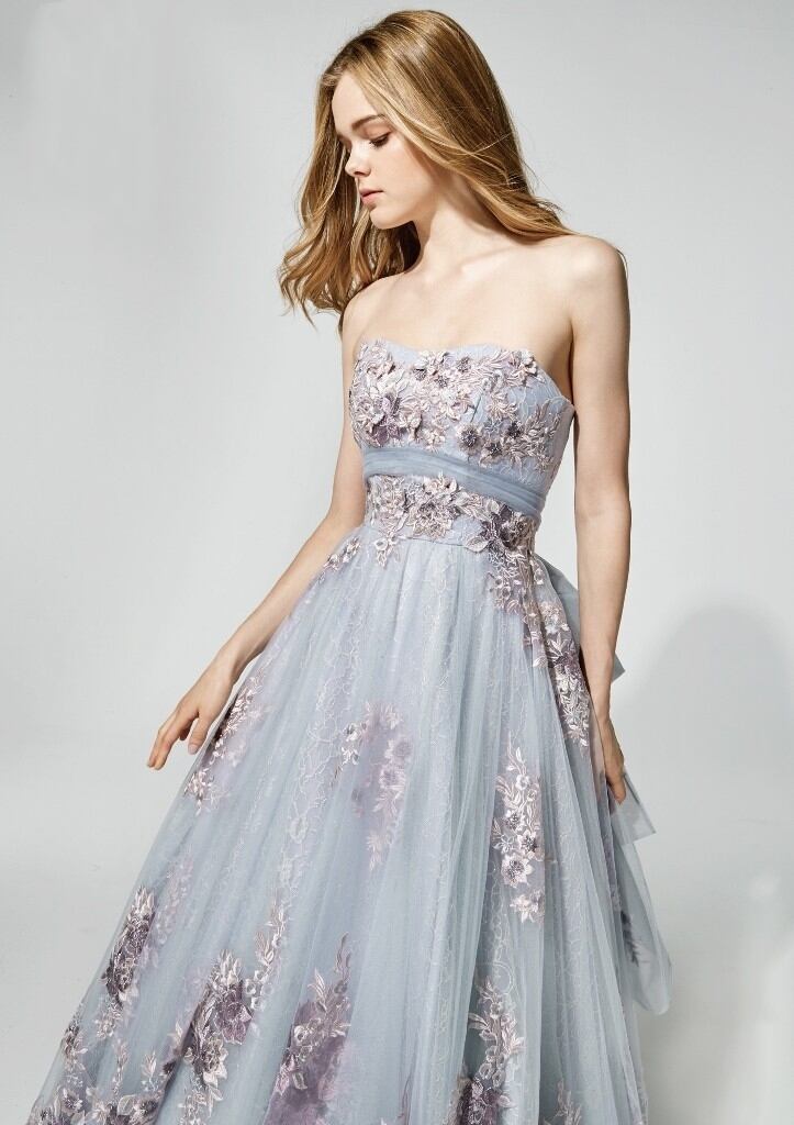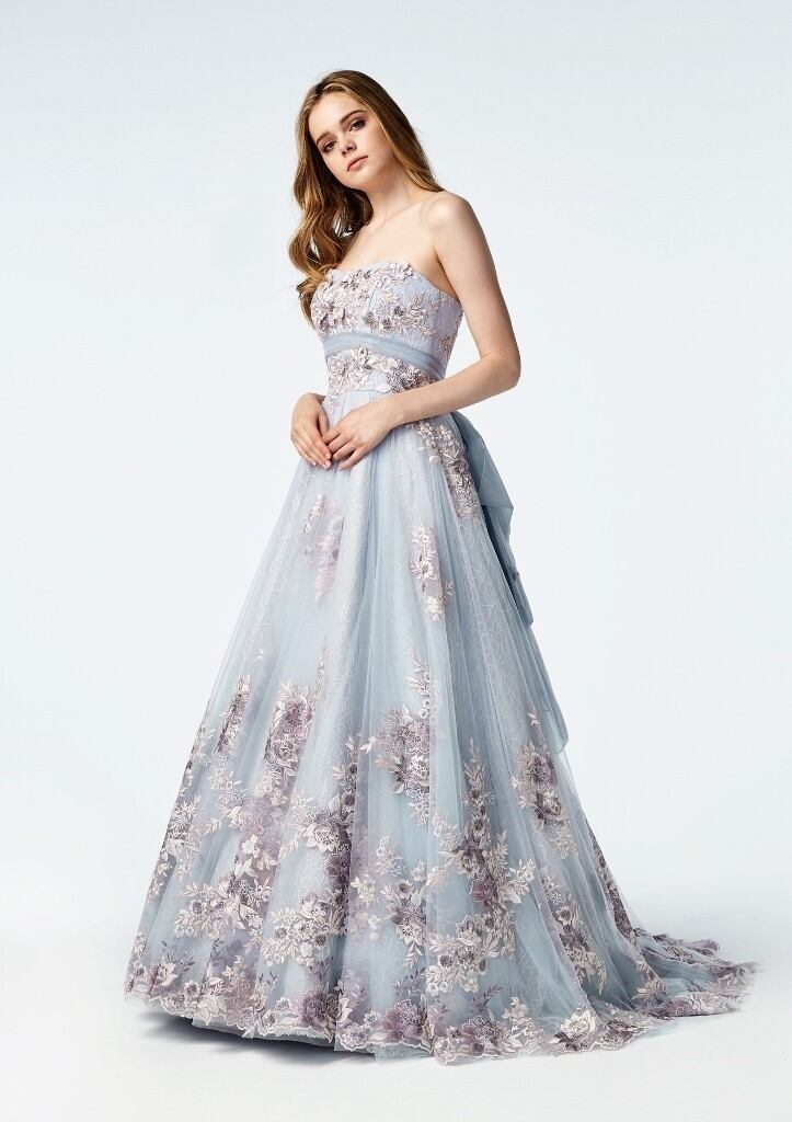高品質!送料無料!カラードレス ブルーグレー ソフトチュール 花柄のモチーフ刺繍 かわいい エレガント ハンドメイド Aライン パーティードレス トレーン オーダードレス 花嫁 結婚式/前撮り | David1021k Dress(ダヴィドレス)