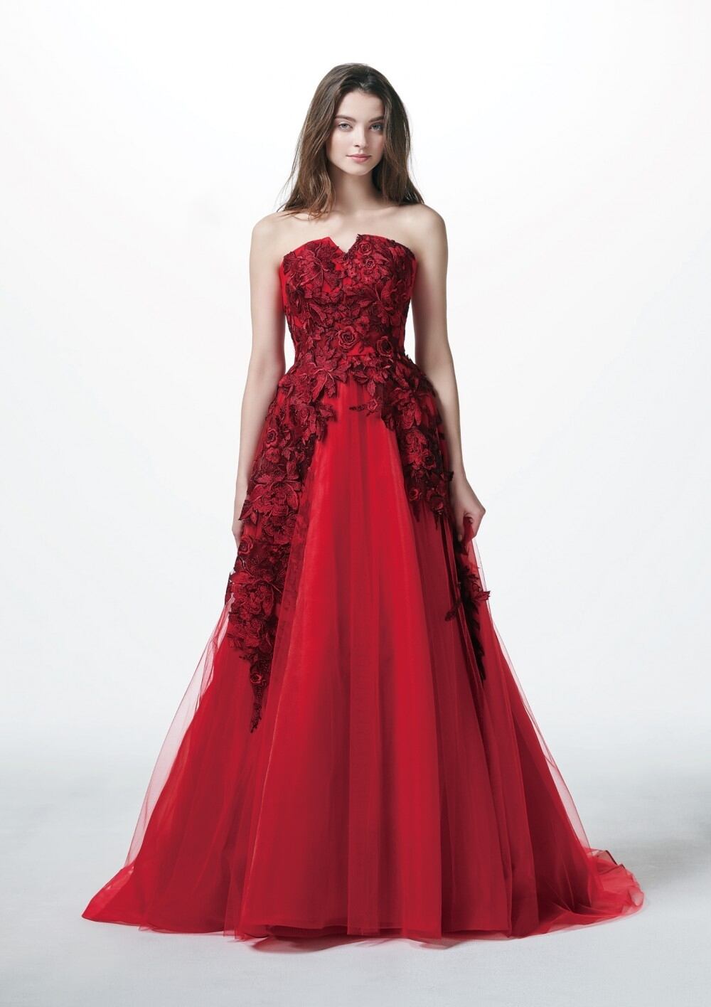 高品質!送料無料!カラードレス レッド/赤 パーティードレス 3D立体レース刺繍 花柄のモチーフ刺繍 ハンドメイド Aライン トレーン オーダーメイド かわいい エレガント 花嫁 結婚式/前撮り