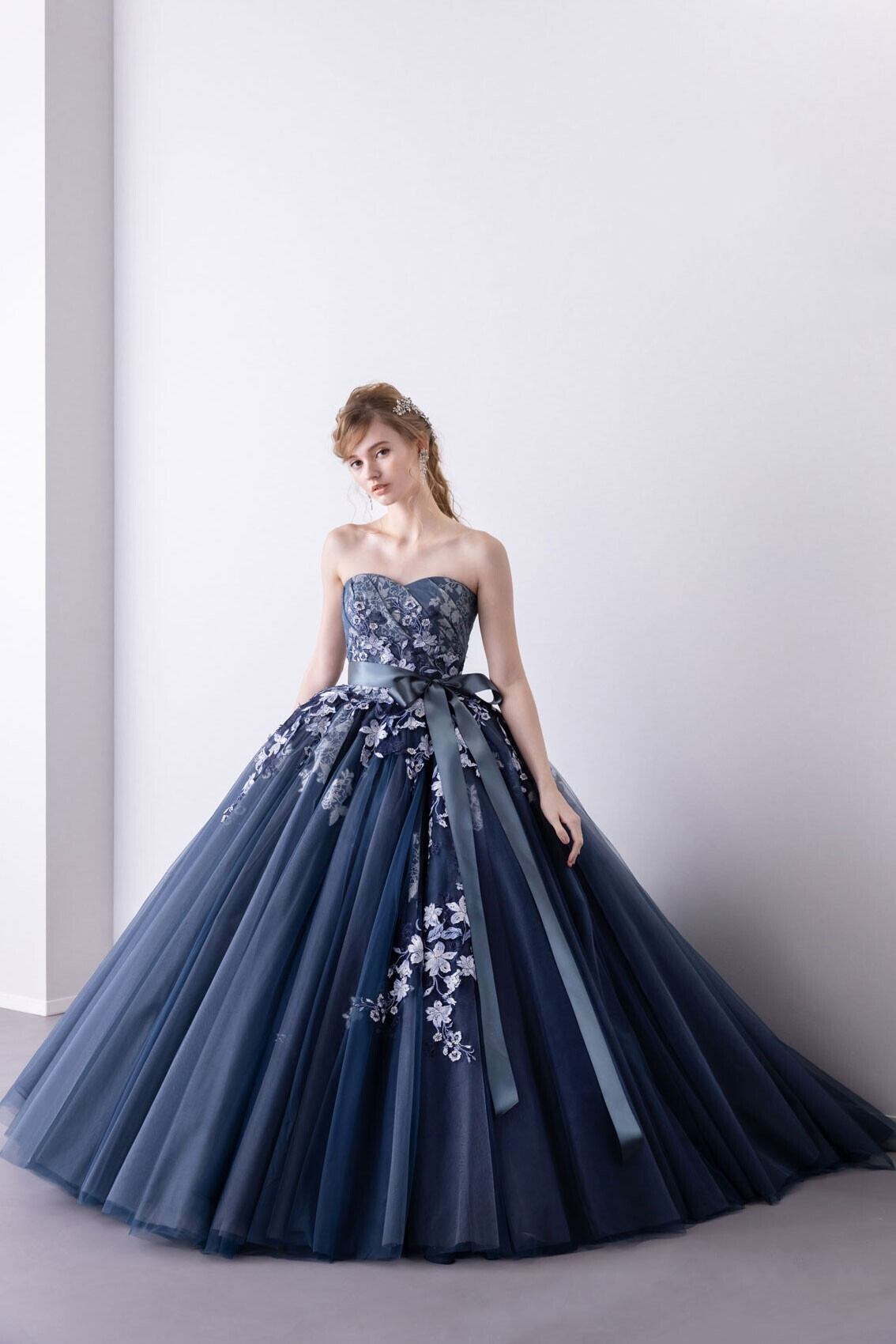 高品質!送料無料!カラードレス ネイビー色 ベルト ソフトチュール 花モチーフ かわいい エレガント ハンドメイド パーティードレス トレーン オーダーメイド 花嫁 結婚式/前撮り | David1021k Dress(ダヴィドレス)