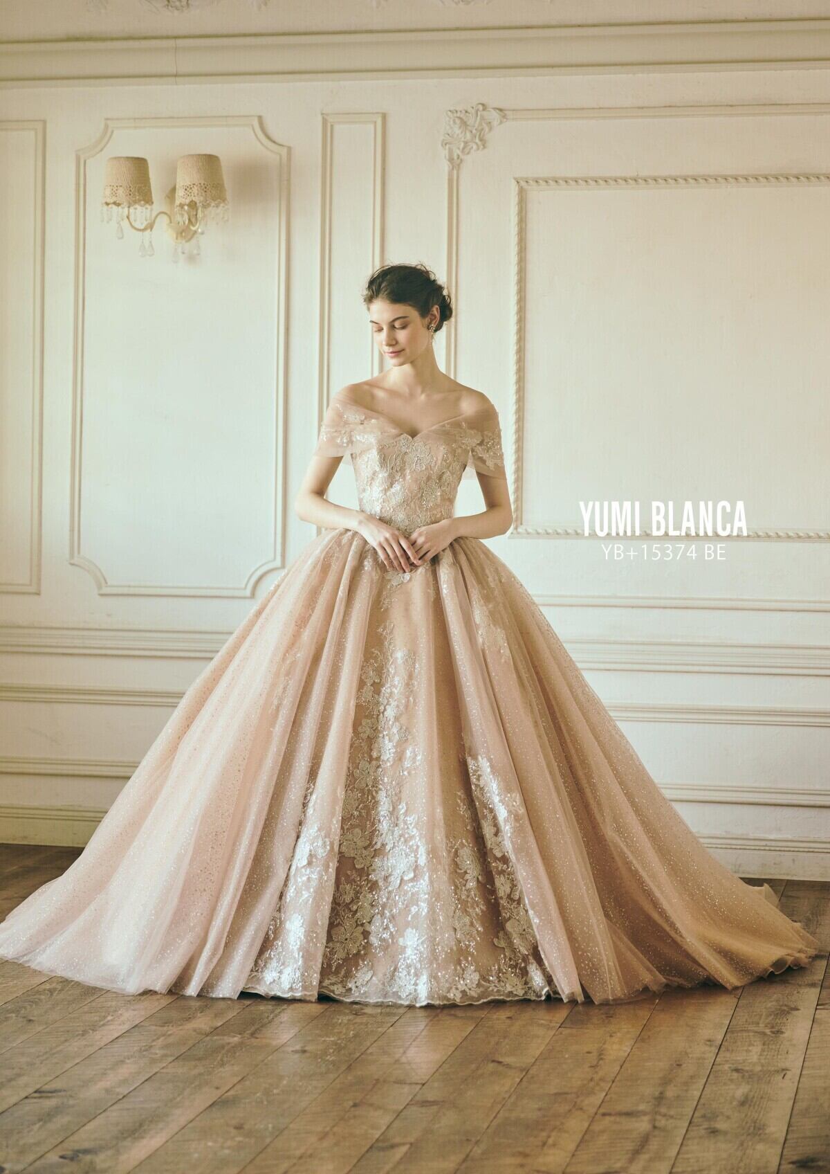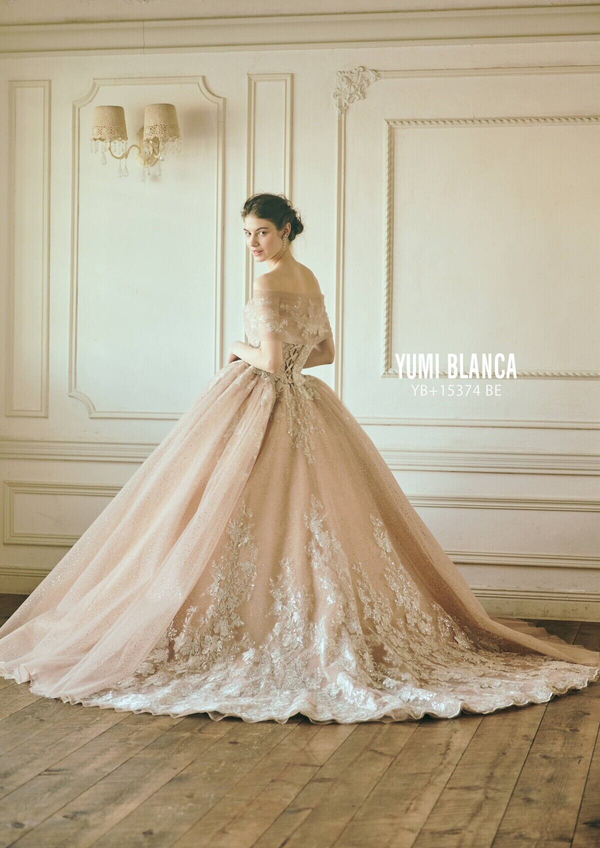 高品質!送料無料!カラードレス ベージュ色 オフショルダー 上品レース ソフトチュール 花モチーフ かわいい エレガント ハンドメイド パーティードレス トレーン オーダーメイド 花嫁 結婚式/前撮り | David1021k Dress(ダヴィドレス)