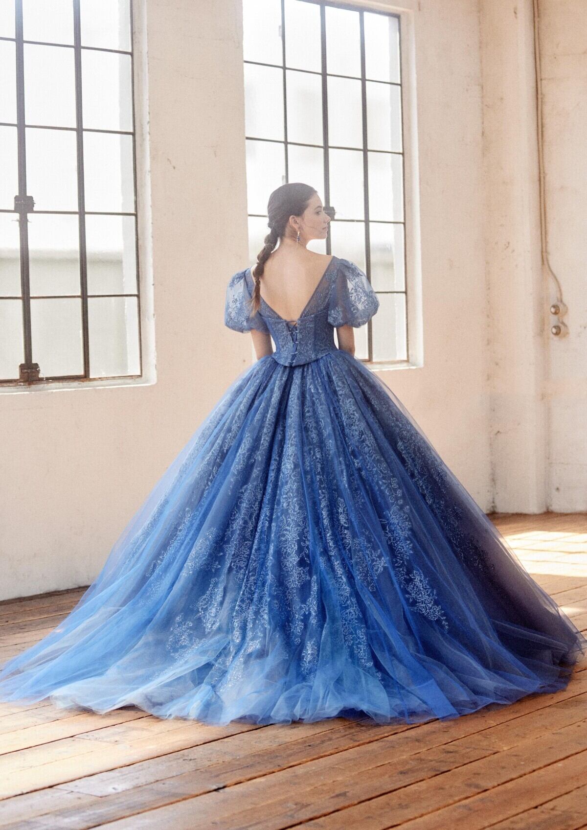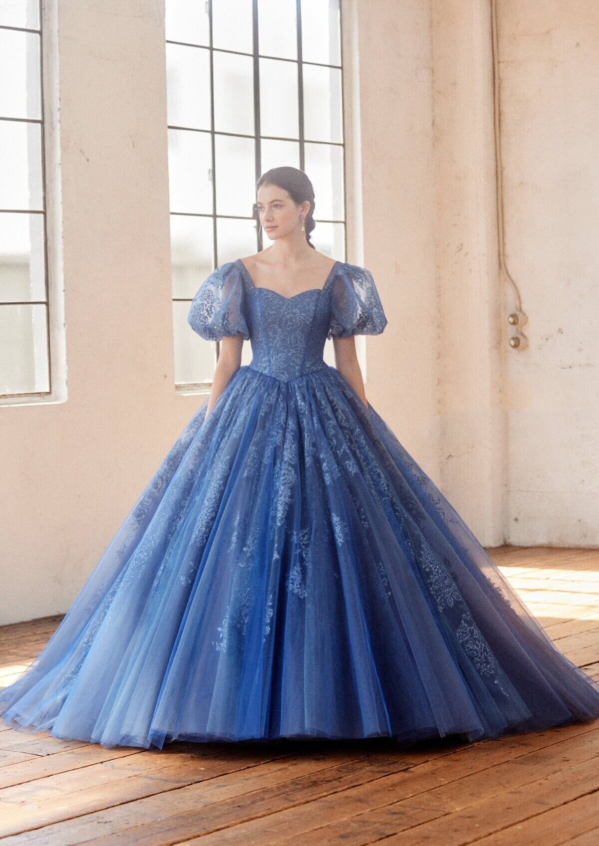 高品質!送料無料!パーティードレス カラードレス ネイビー色/ブルー パフスリーブ 花モチーフ ソフトチュール プリンセスライン エレガント トレーン オーダーメイド 花嫁 結婚式/前撮り | David1021k Dress(ダヴィドレス)