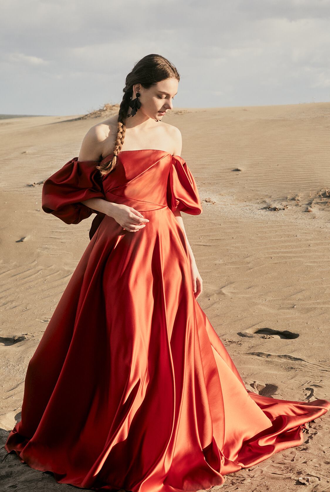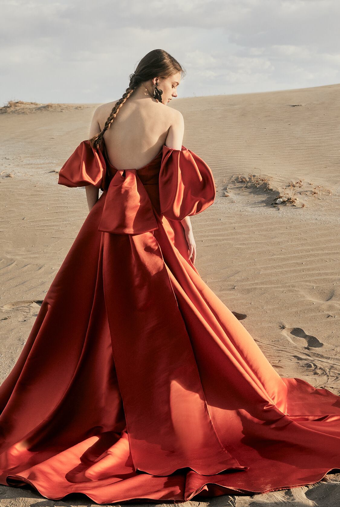高品質!送料無料!パーティードレス カラードレス テラコッタ色 高級サテン パフスリーブ エレガント リボン 華やかなトレーン オーダーメイド 花嫁 結婚式/前撮り | David1021k Dress(ダヴィドレス)