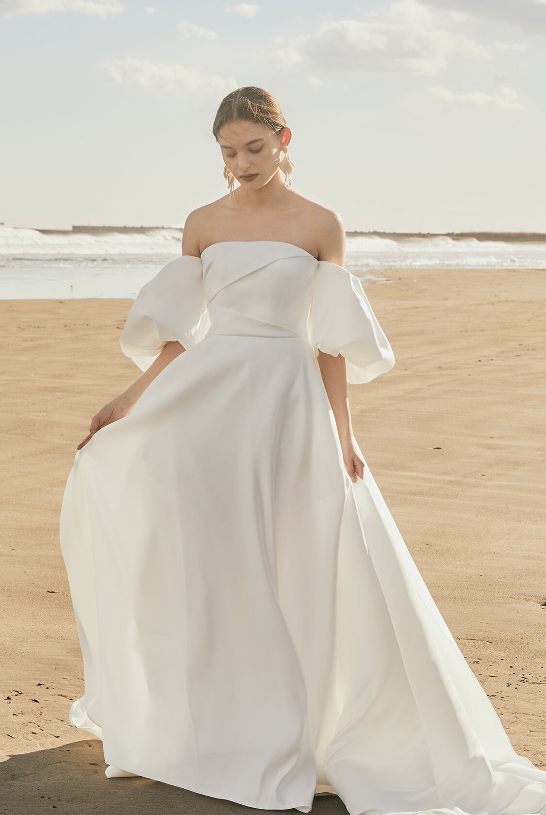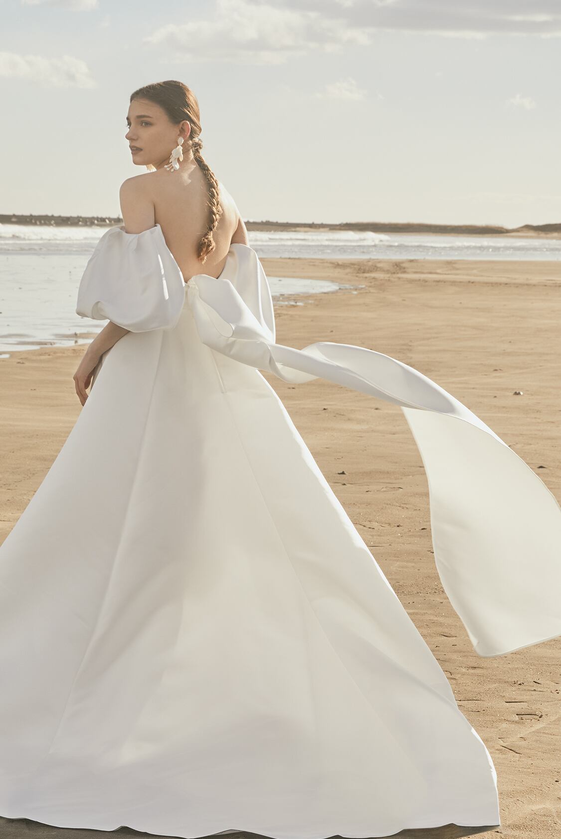 高品質!送料無料!ウエディングドレス パーティードレス オフホワイト 高級サテン パフスリーブ エレガント リボン 華やかなトレーン オーダーメイド 花嫁 結婚式/前撮り | David1021k Dress(ダヴィドレス)