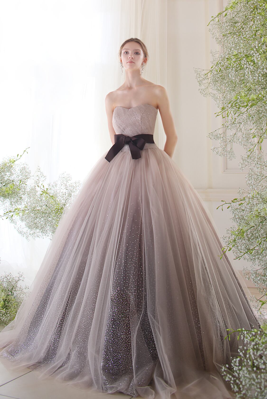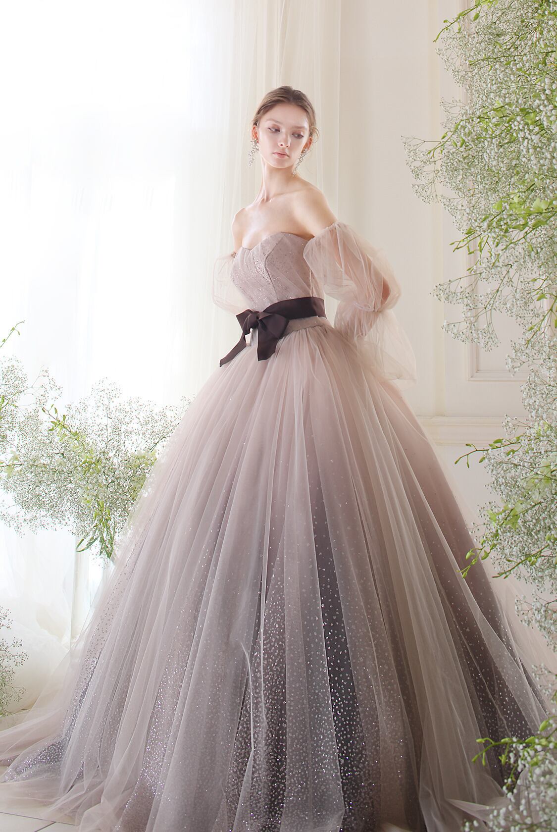 高品質!送料無料!カラードレス ベージュ色 パーティードレス 付け袖 キラキラグリッターチュール エレガント リボン 華やかなトレーン オーダーメイド 花嫁 結婚式/前撮り | David1021k Dress(ダヴィドレス)