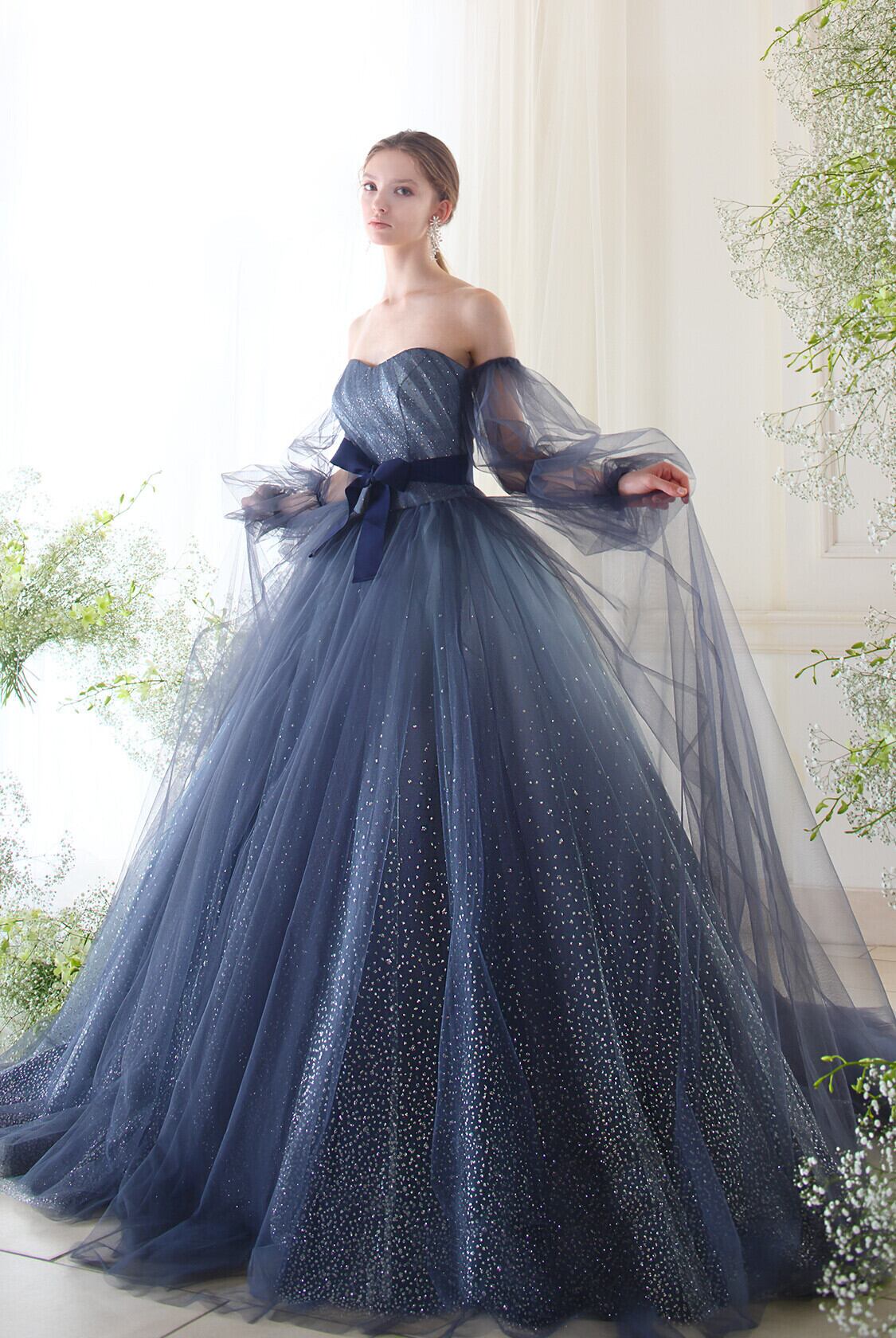 高品質!送料無料!カラードレス ネイビー色 パーティードレス 付け袖 キラキラグリッターチュール エレガント リボン 華やかなトレーン オーダーメイド 花嫁 結婚式/前撮り | David1021k Dress(ダヴィドレス)