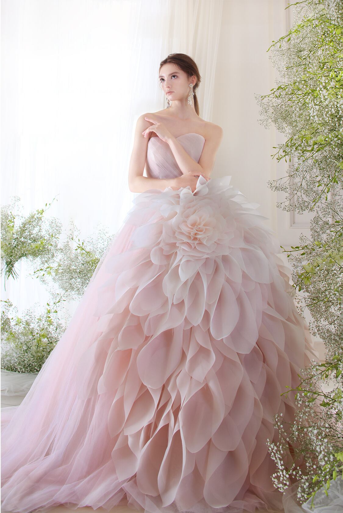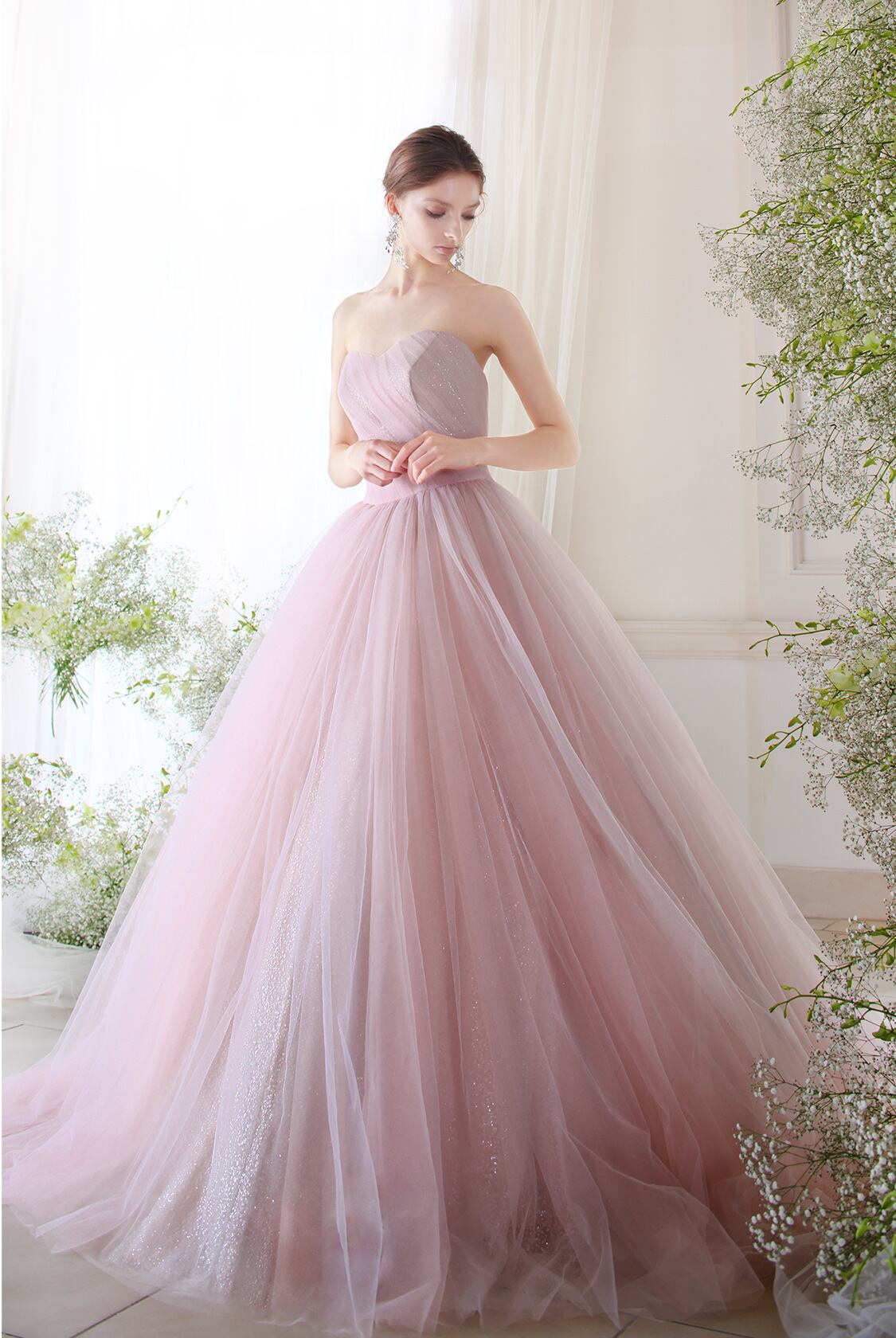 高品質!送料無料!カラードレス 薄ピンク パーティードレス 取り外し花 オーバースカート ベアトップ キラキラグリッターチュール エレガント トレーン オーダーメイド 花嫁 結婚式/前撮り