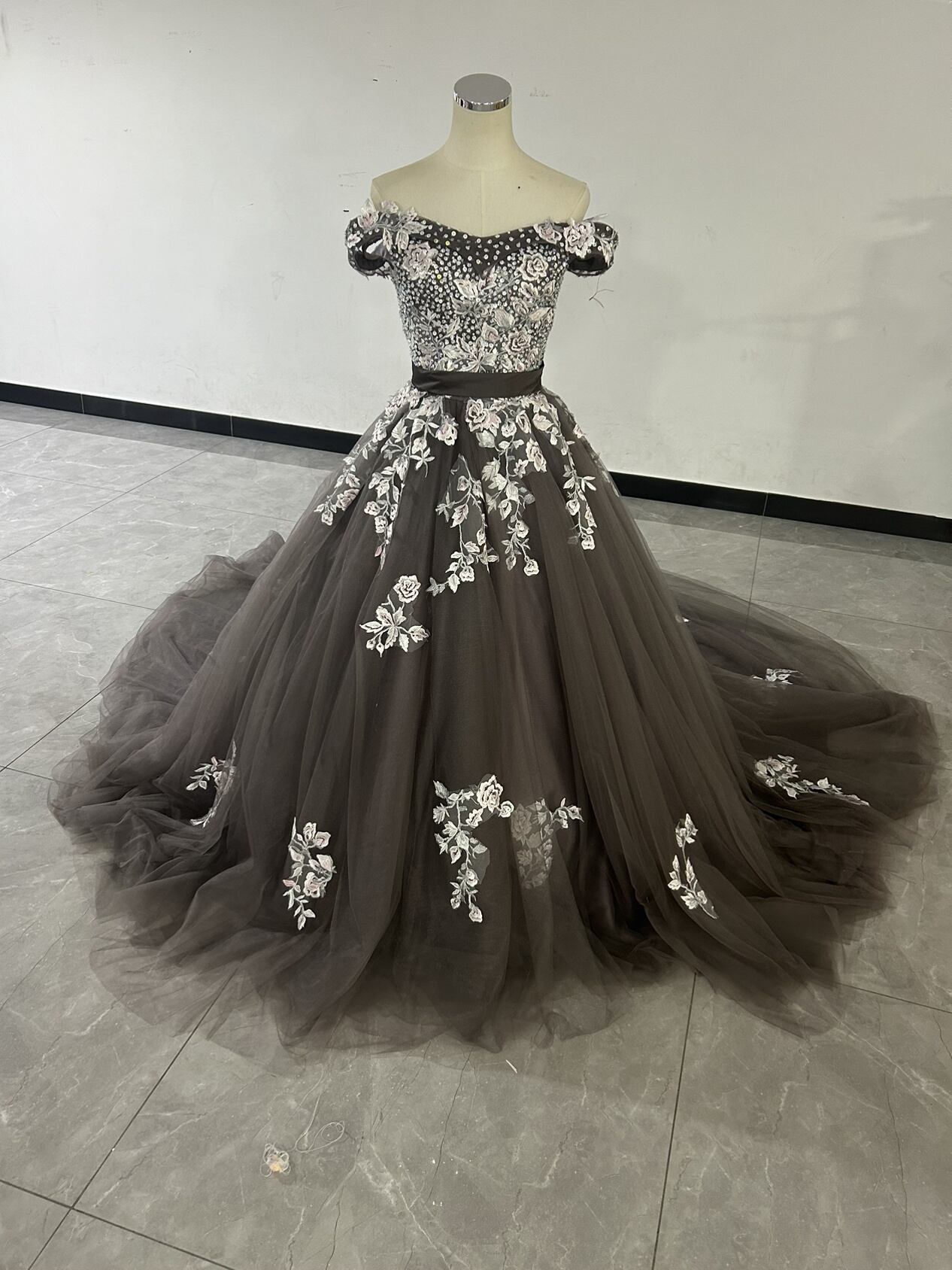 人気上昇!上品レース 取り外しオフショルダー カラードレス キラキラチュール ソフトチュール 華やかなトレーン 結婚式/披露宴